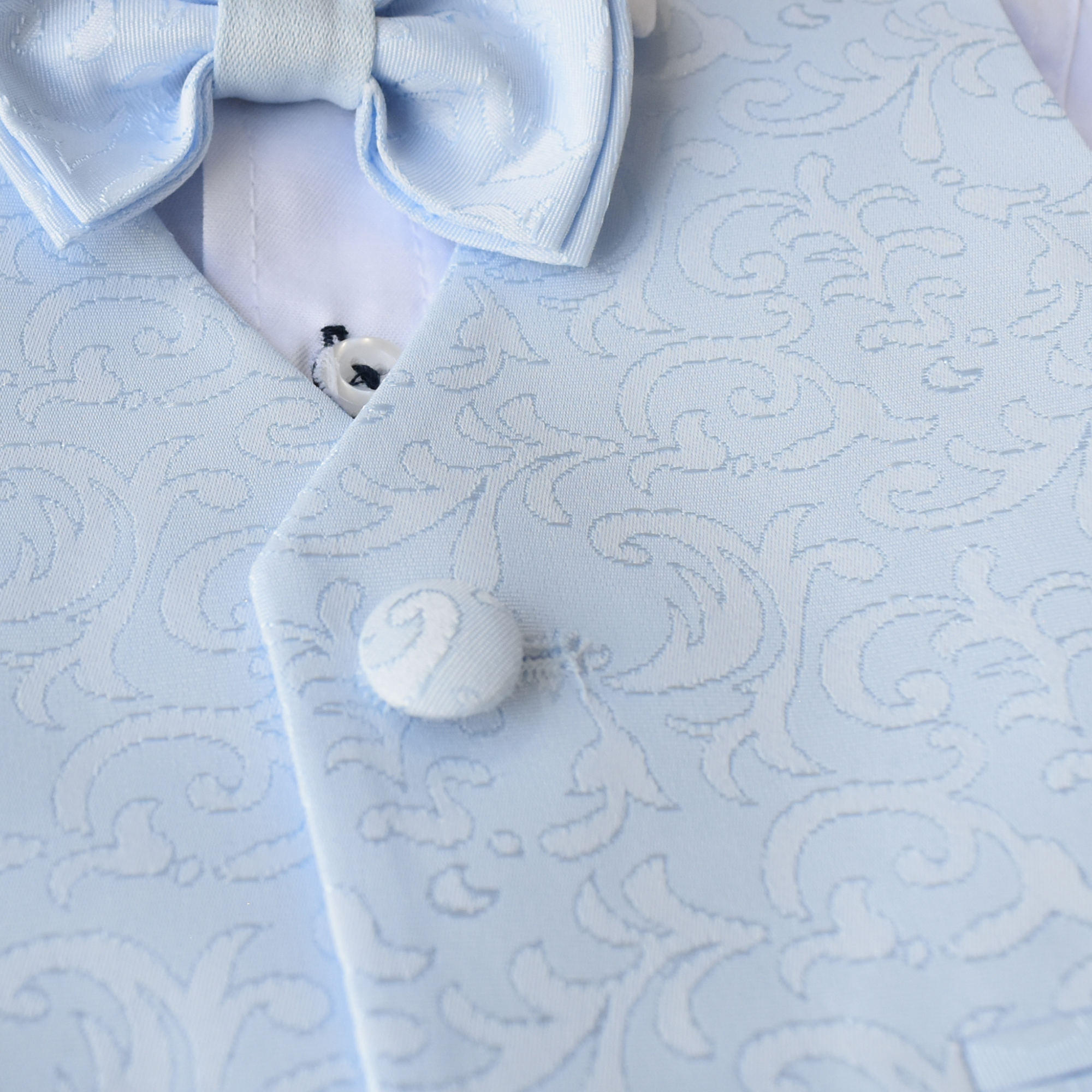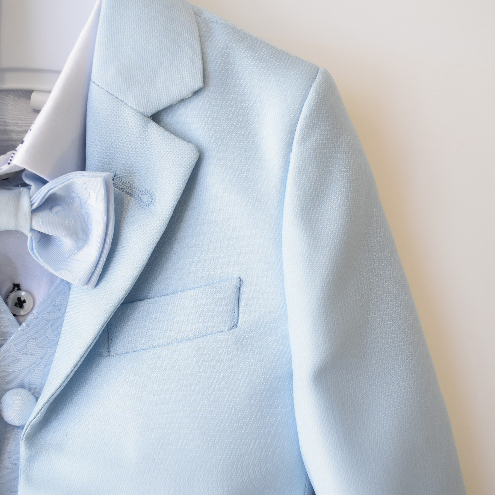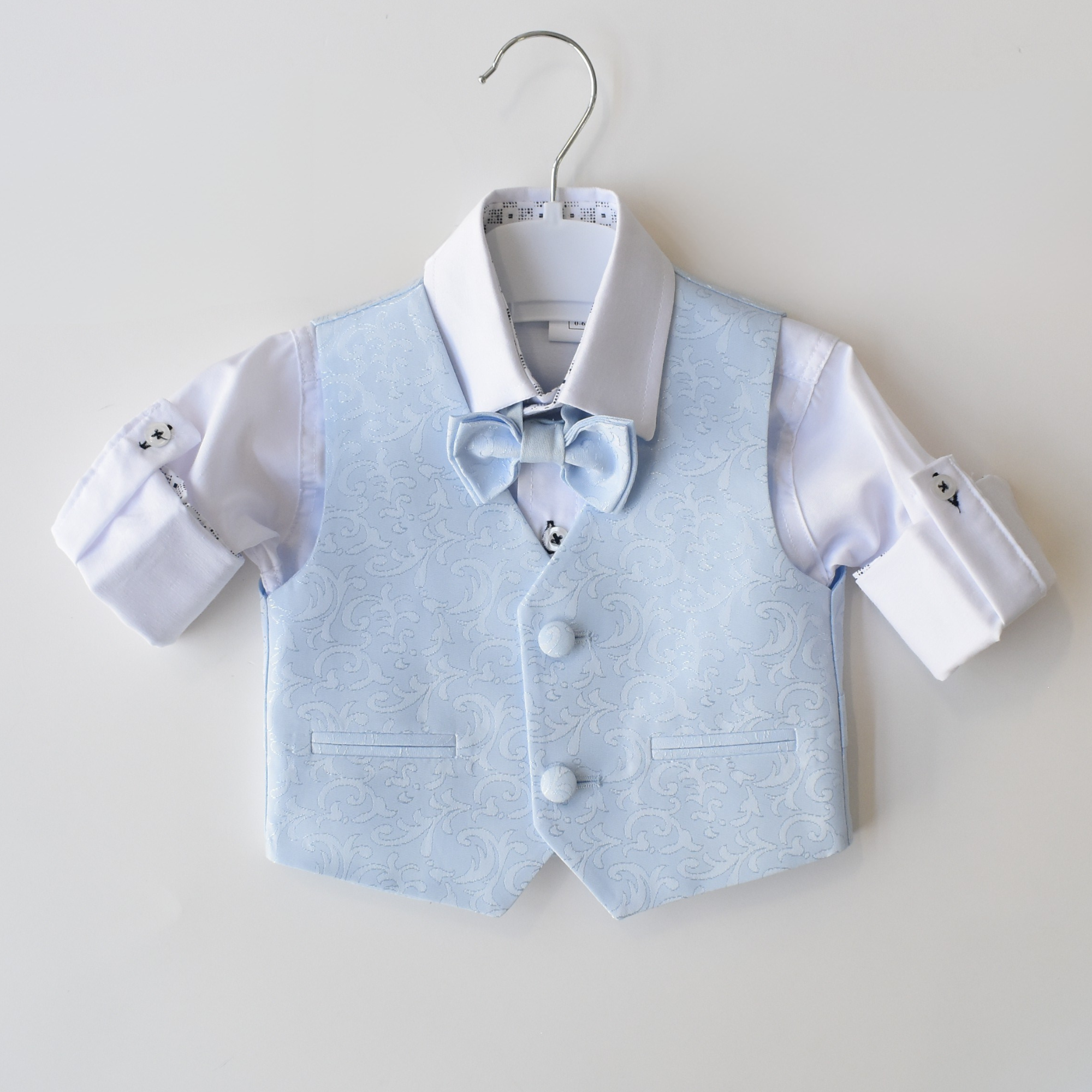 Make a statement on your special day with this stylish baptism or wedding day suit. It boasts a trendy, European-inspired look that exudes both elegance and comfort. The set includes a white cotton shirt, a sleeveless vest with a jacquard pattern (jacquard print may vary from sample picture), a matching jacquard bowtie, and a soft baby blue blazer and adjustable waist pants. All made of 100% cotton.