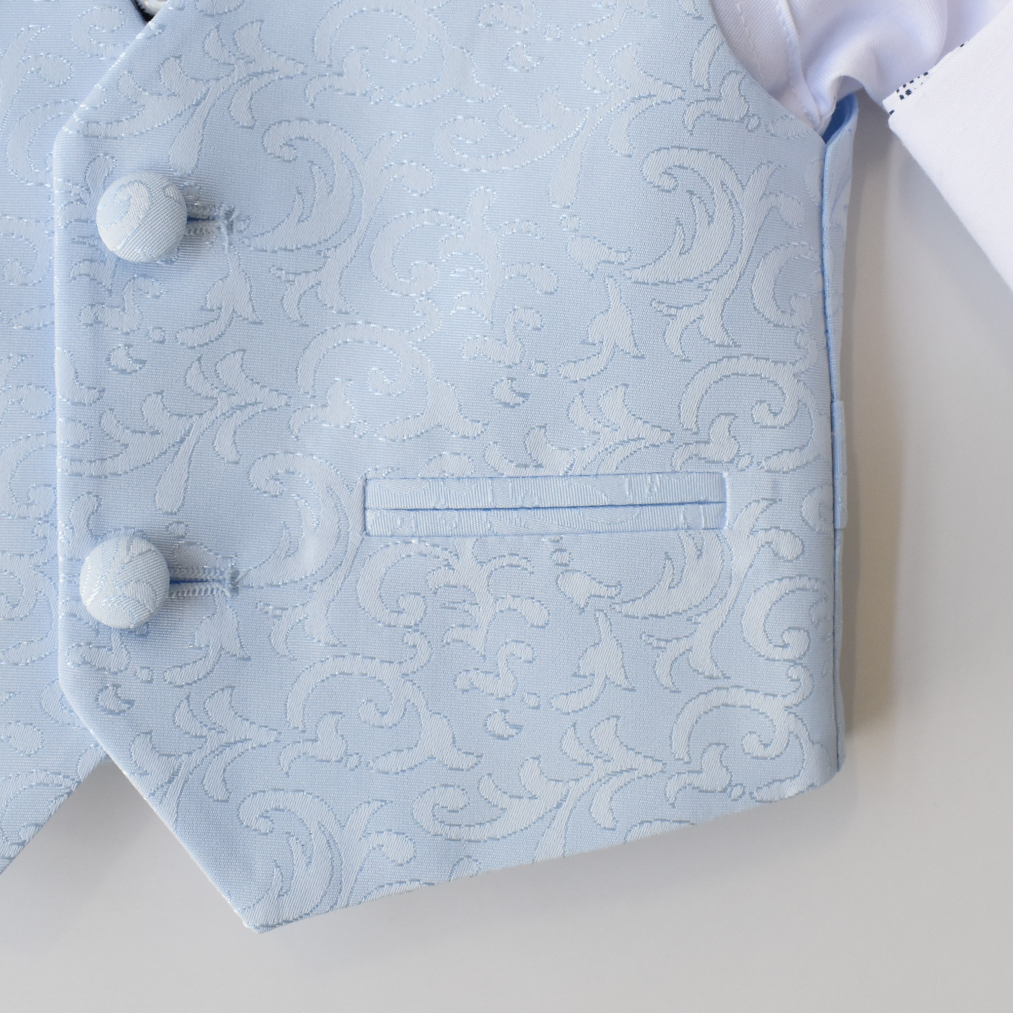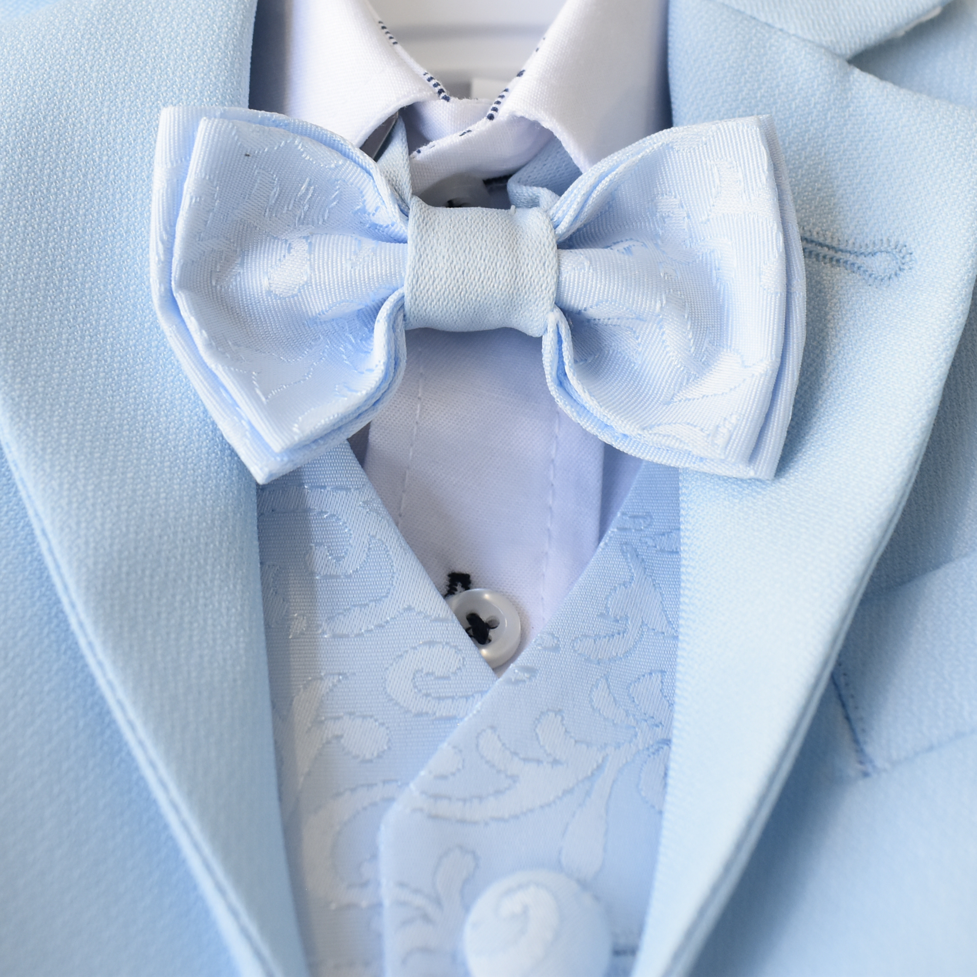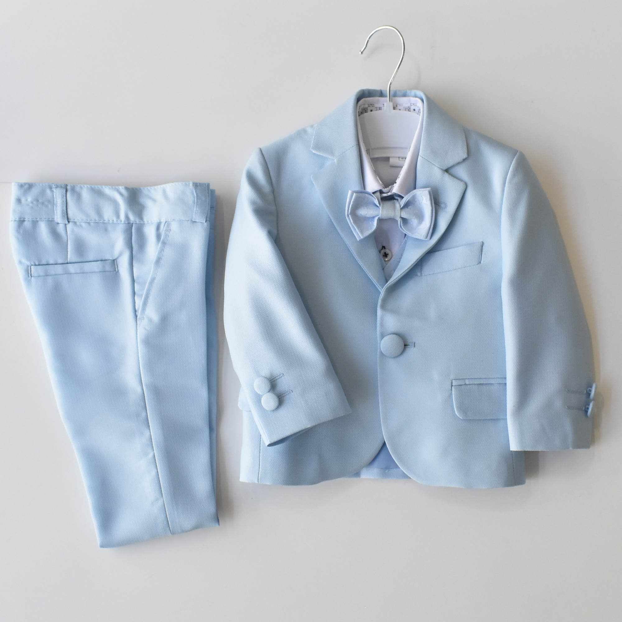 Make a statement on your special day with this stylish baptism or wedding day suit. It boasts a trendy, European-inspired look that exudes both elegance and comfort. The set includes a white cotton shirt, a sleeveless vest with a jacquard pattern (jacquard print may vary from sample picture), a matching jacquard bowtie, and a soft baby blue blazer and adjustable waist pants. All made of 100% cotton.