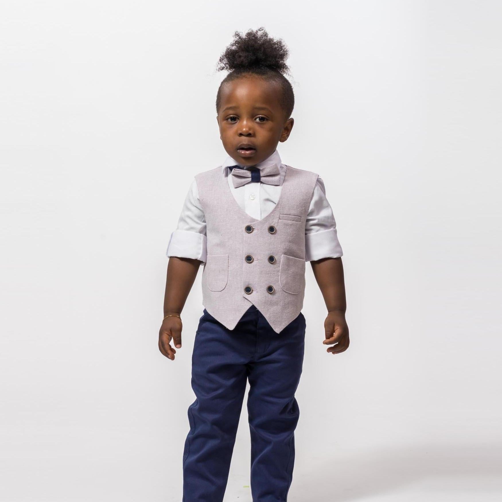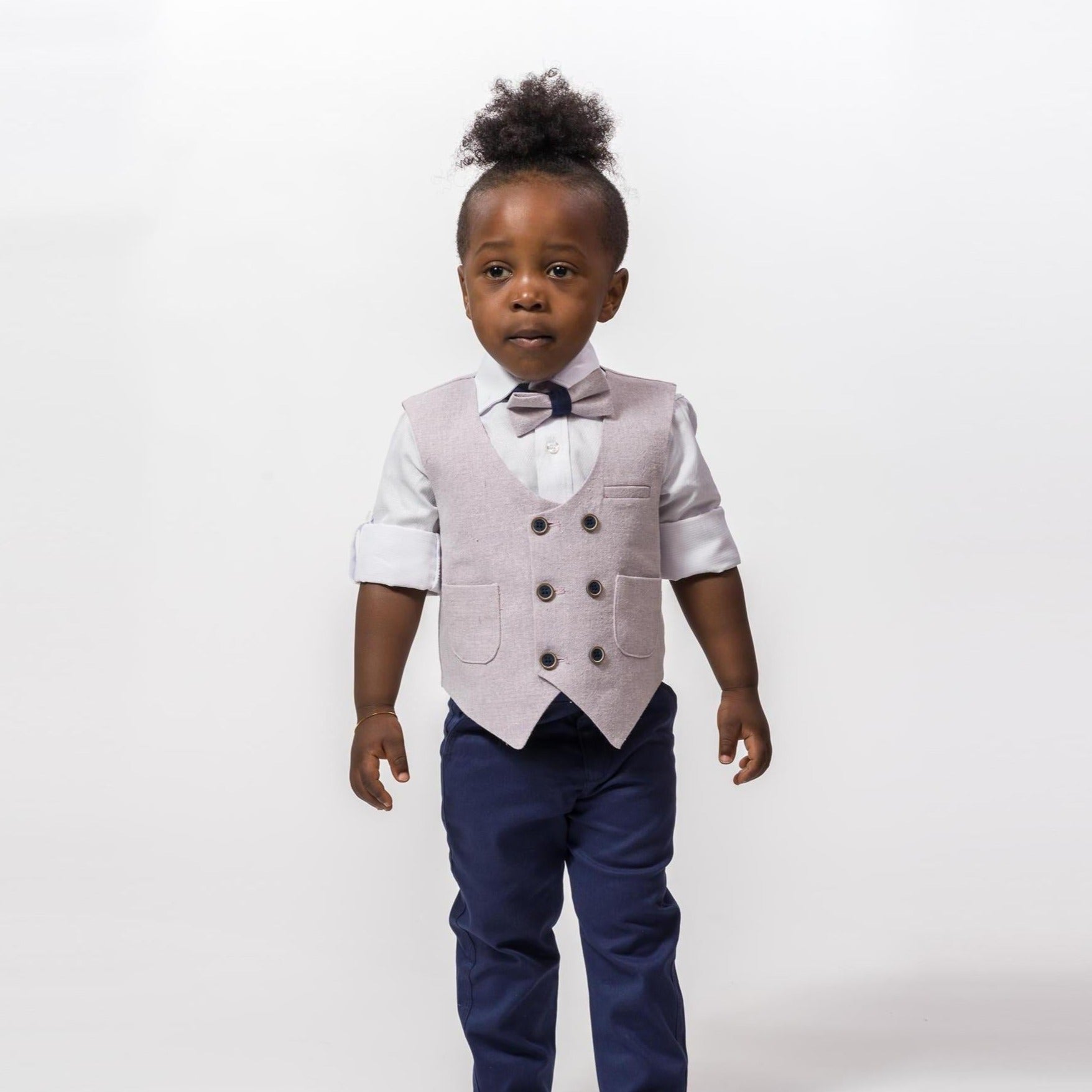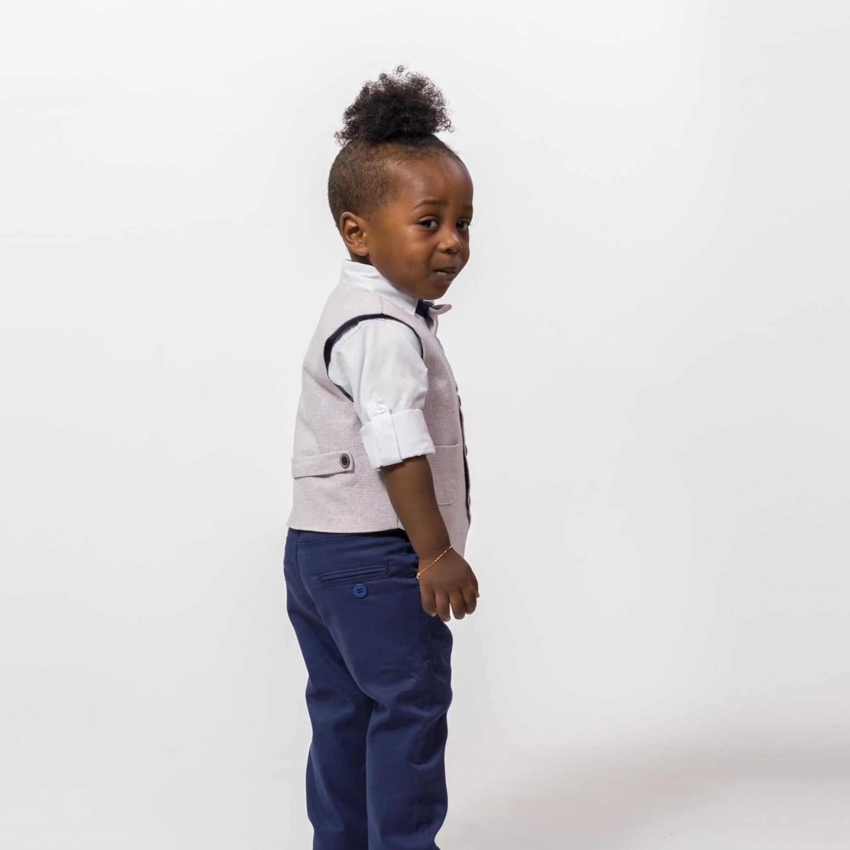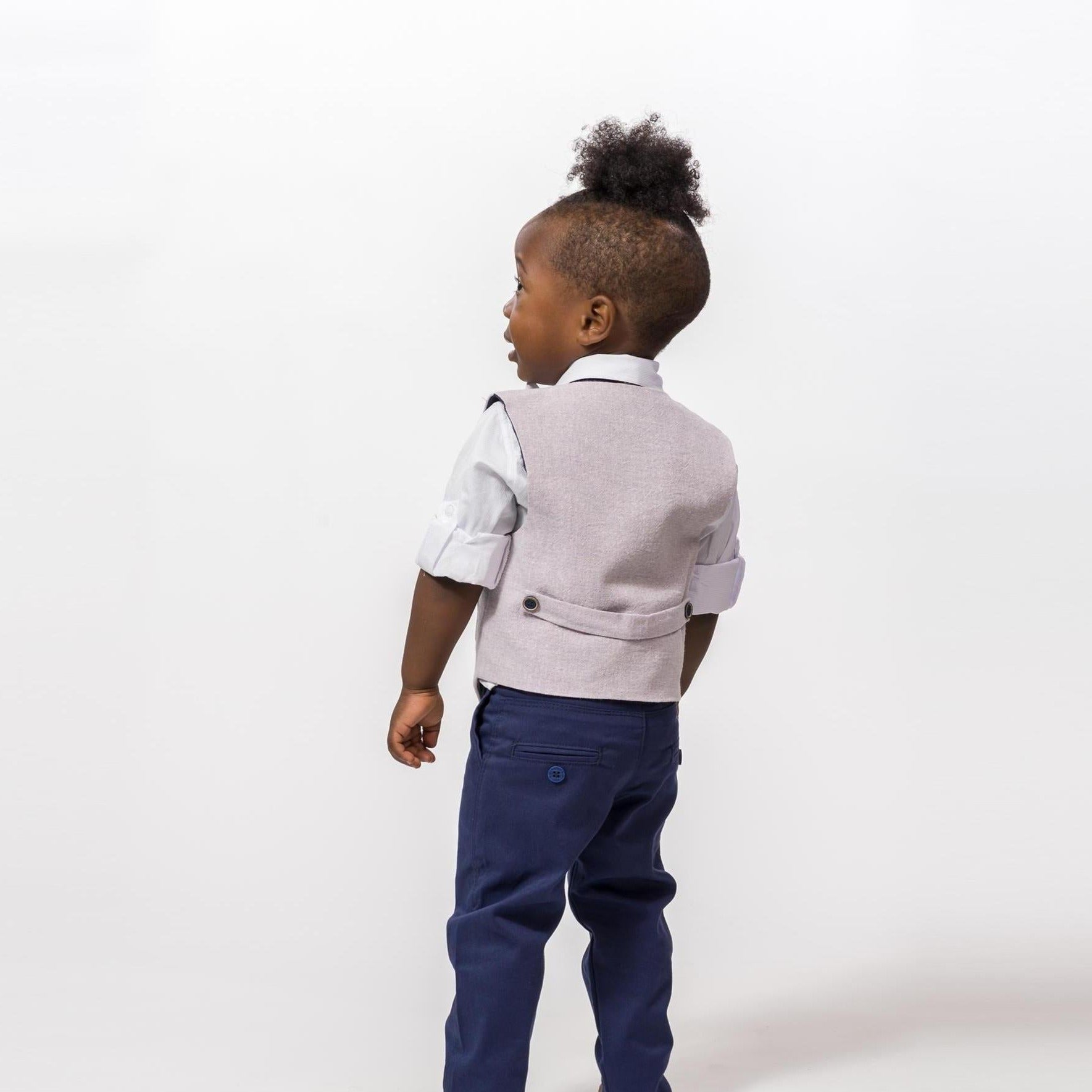 This is taking the vest set style to a new level. Stylish knit cotton vest set including sleeveless vest, soft patterned cotton shirt, and slim fit adjustable waist knit cotton pants, and matching bowtie. A real superstar in the making!