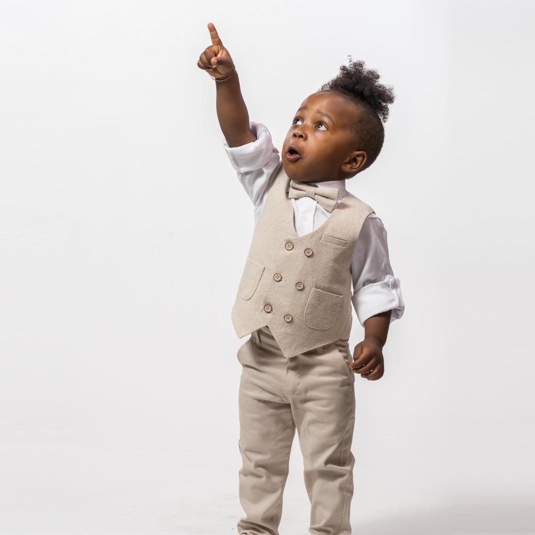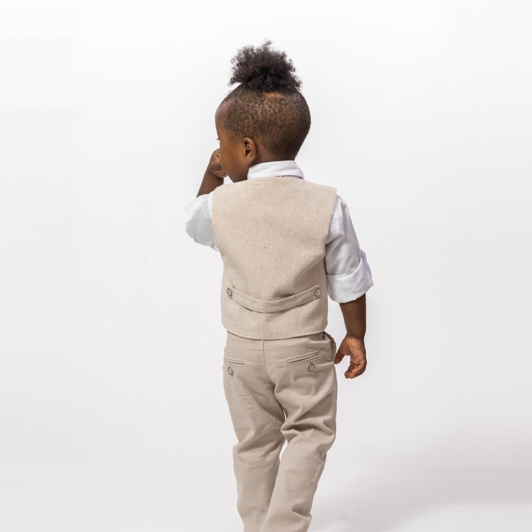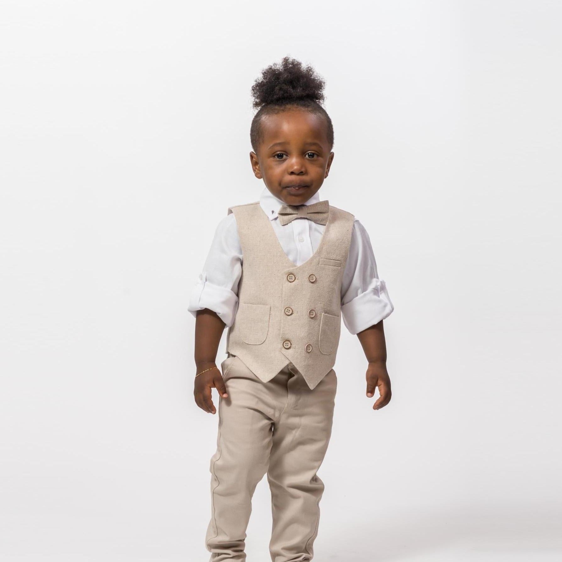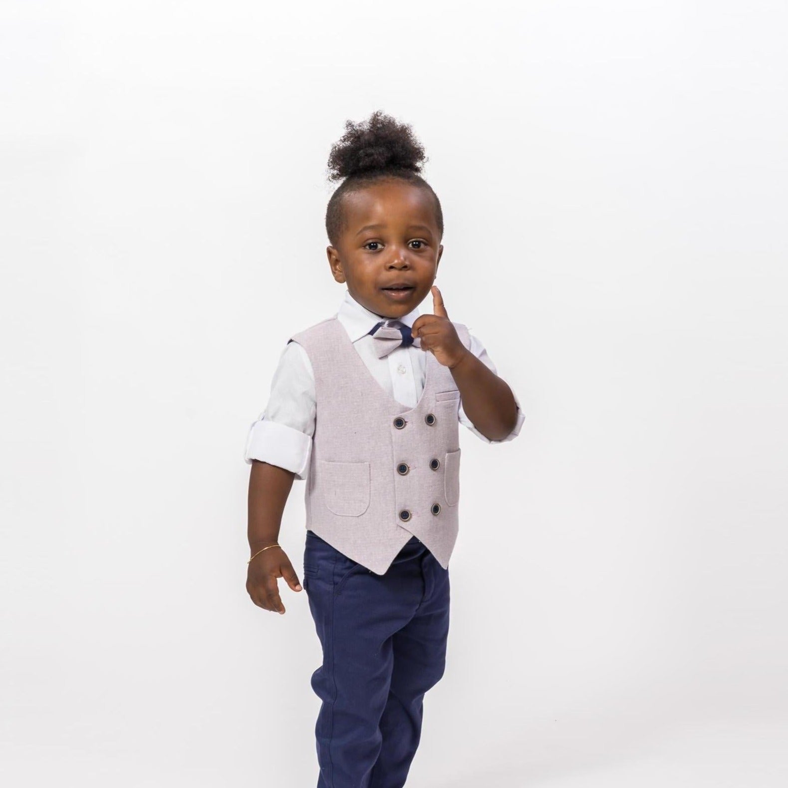 This is taking the vest set style to a new level. Stylish knit cotton vest set including sleeveless vest, soft patterned cotton shirt, and slim fit adjustable waist knit cotton pants, and matching bowtie. A real superstar in the making!
