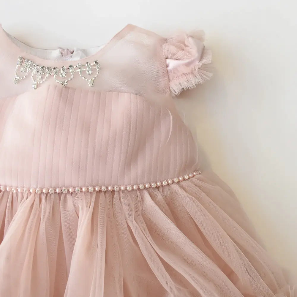 Give your little one a regal look with this charming baby dress, available in both white and blush. Featuring delicate pleated fabric on the bodice, sparkling rhinestone embellishments, and a voluminous layered tulle skirt, this dress is perfect for special occasions like christenings, weddings, and birthdays.