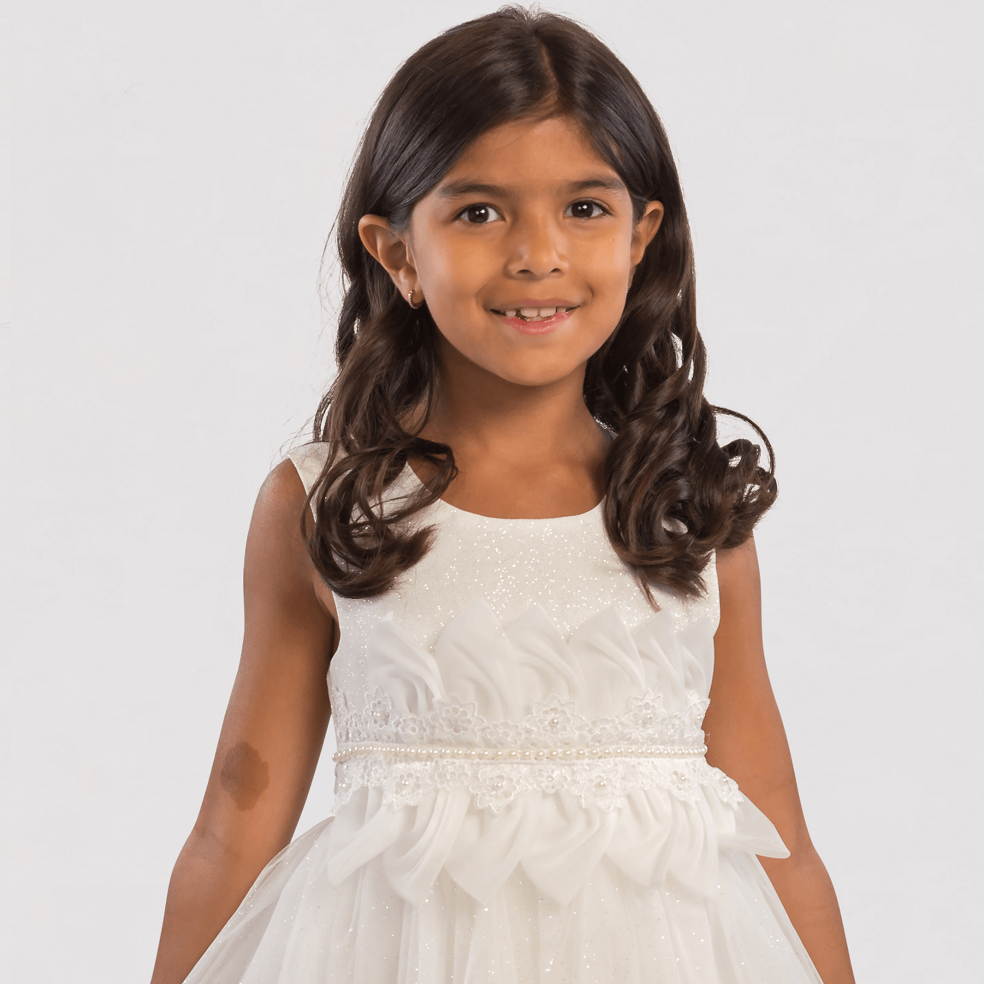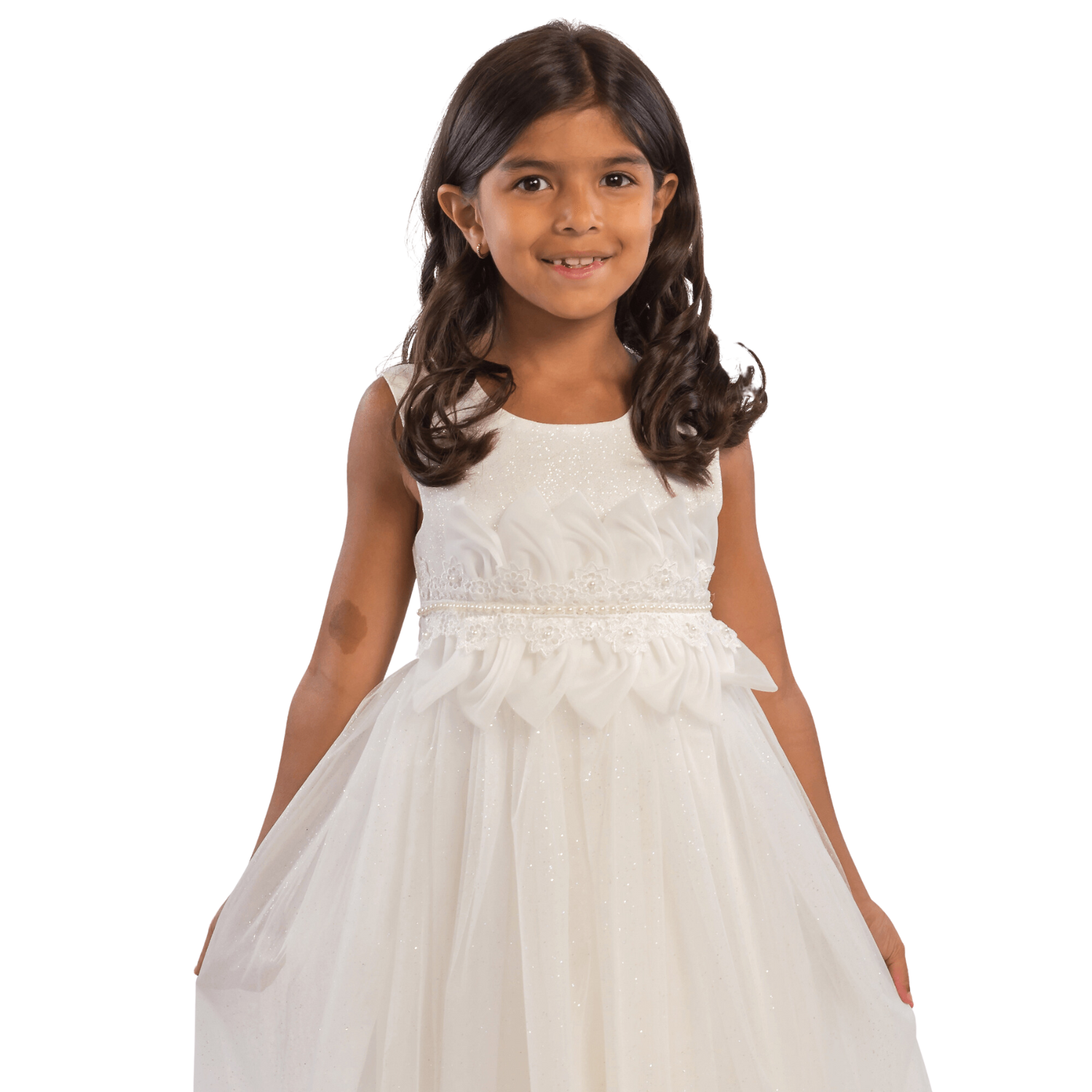 Version longue de la "Nana's Dress" en tulle brillant avec des volants en V originaux, de la dentelle et des perles à la taille feront de votre bout de chou une vraie princesse. Une robe exclusive signée JuniorKids!