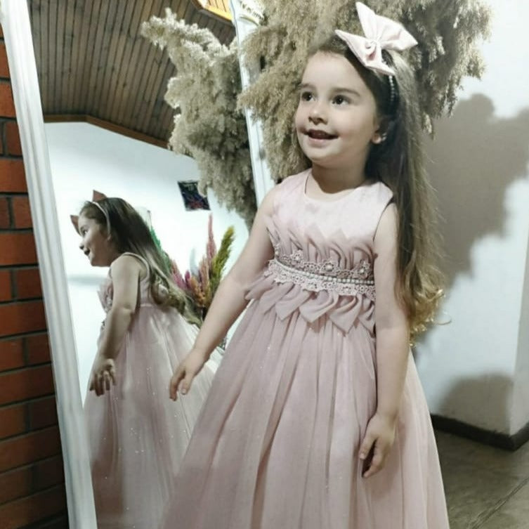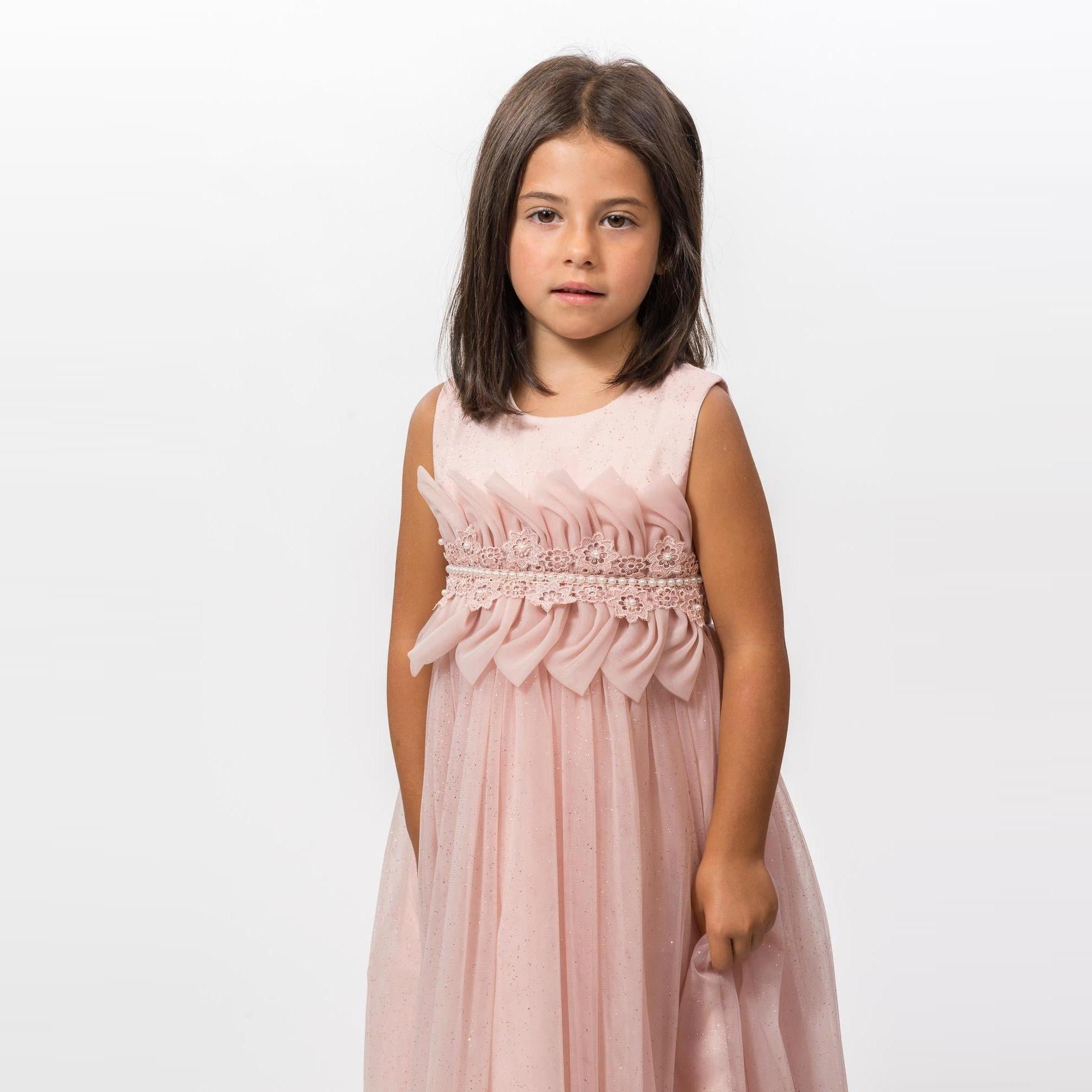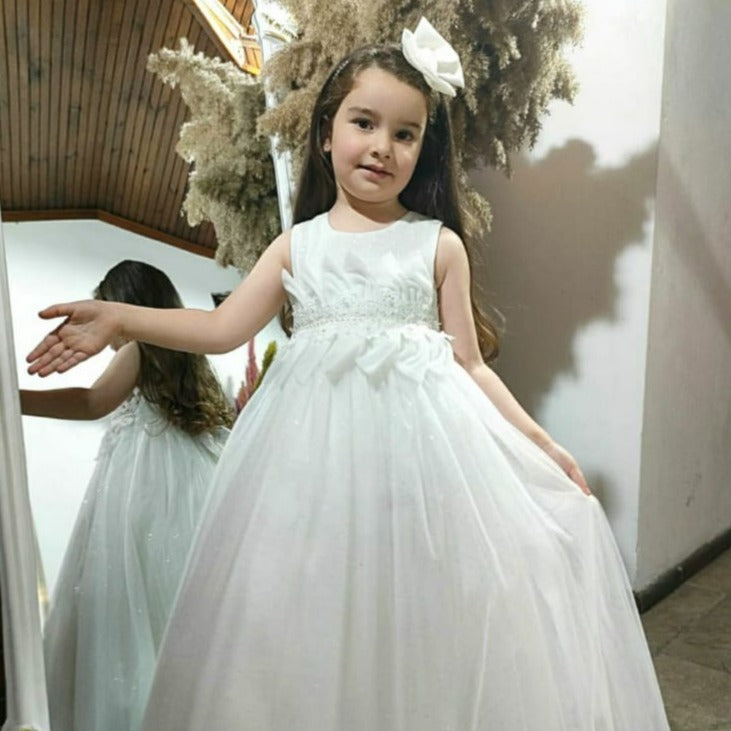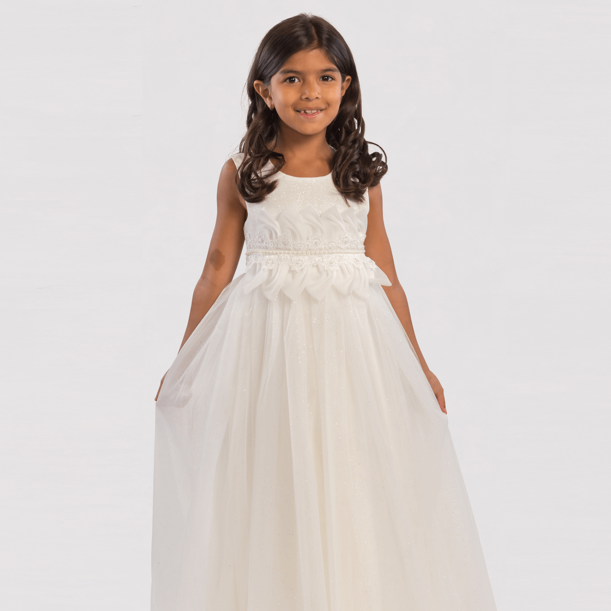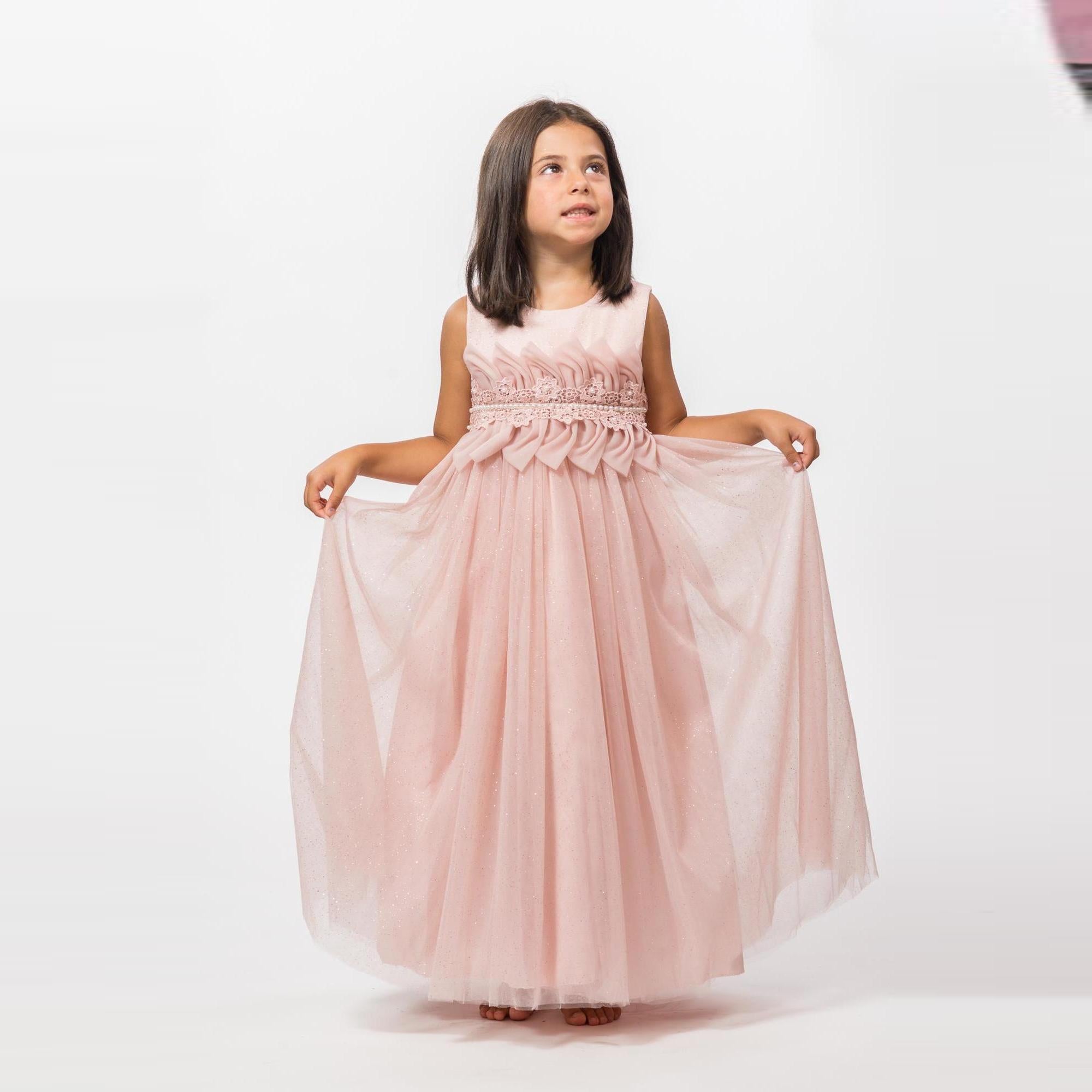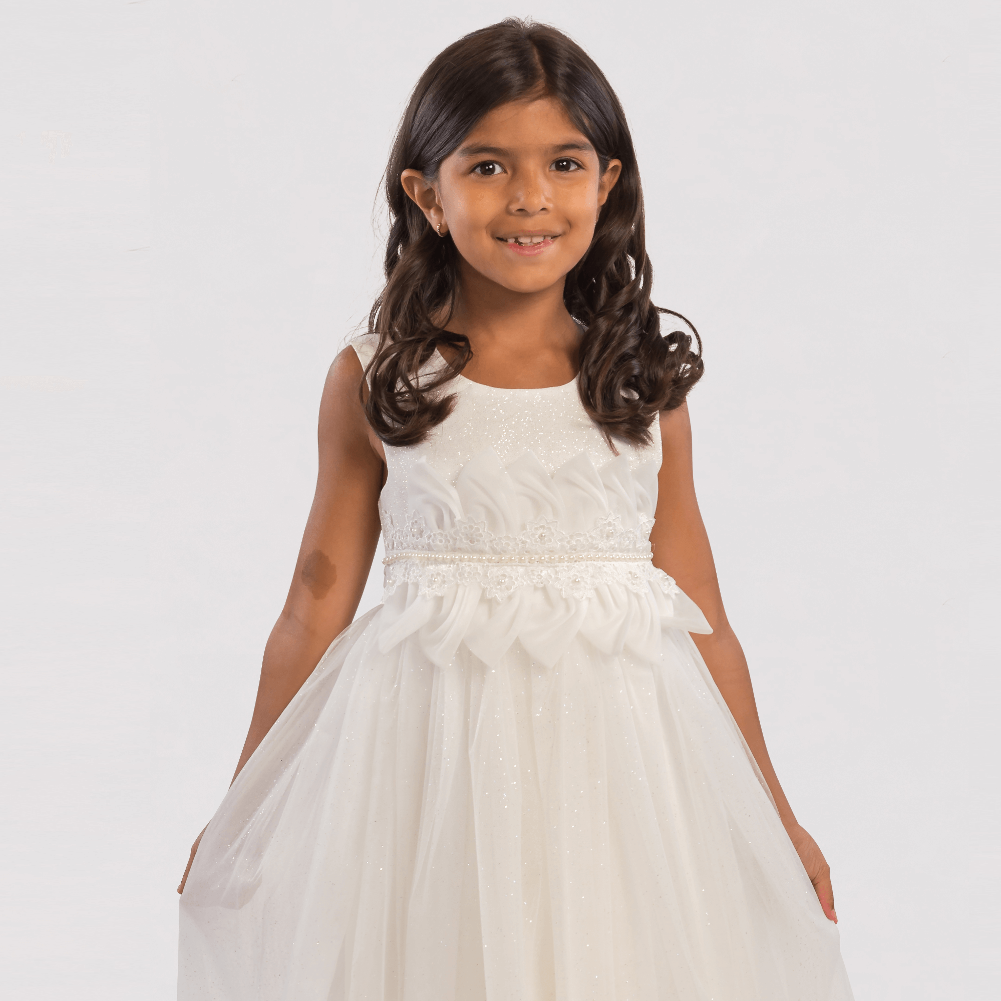 Beautiful long version of the Nana's Dress in shiny tulle with original V-shaped ruffles, lace and pearls on the waist will make your little one a real princess. An exclusive dress by JuniorKids!