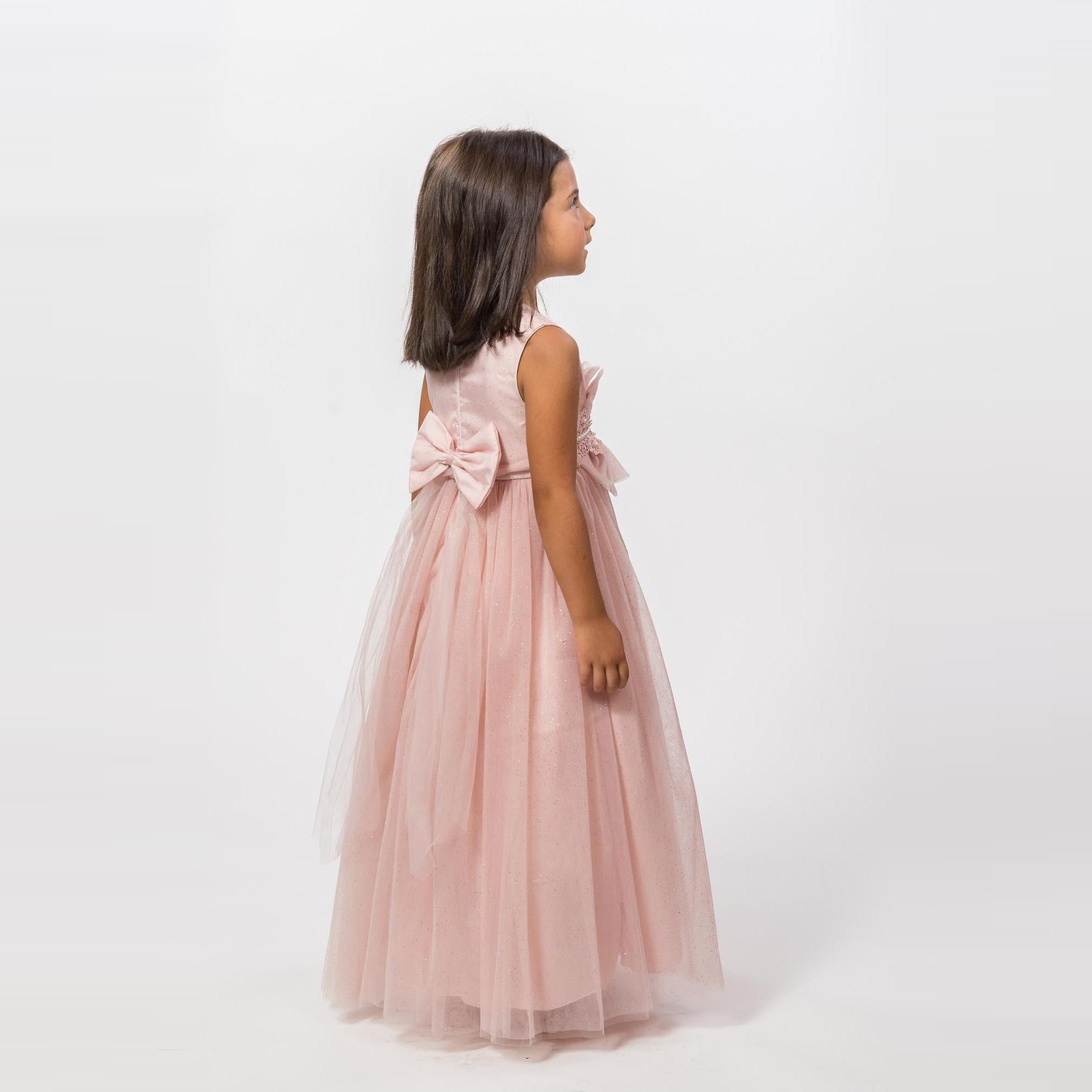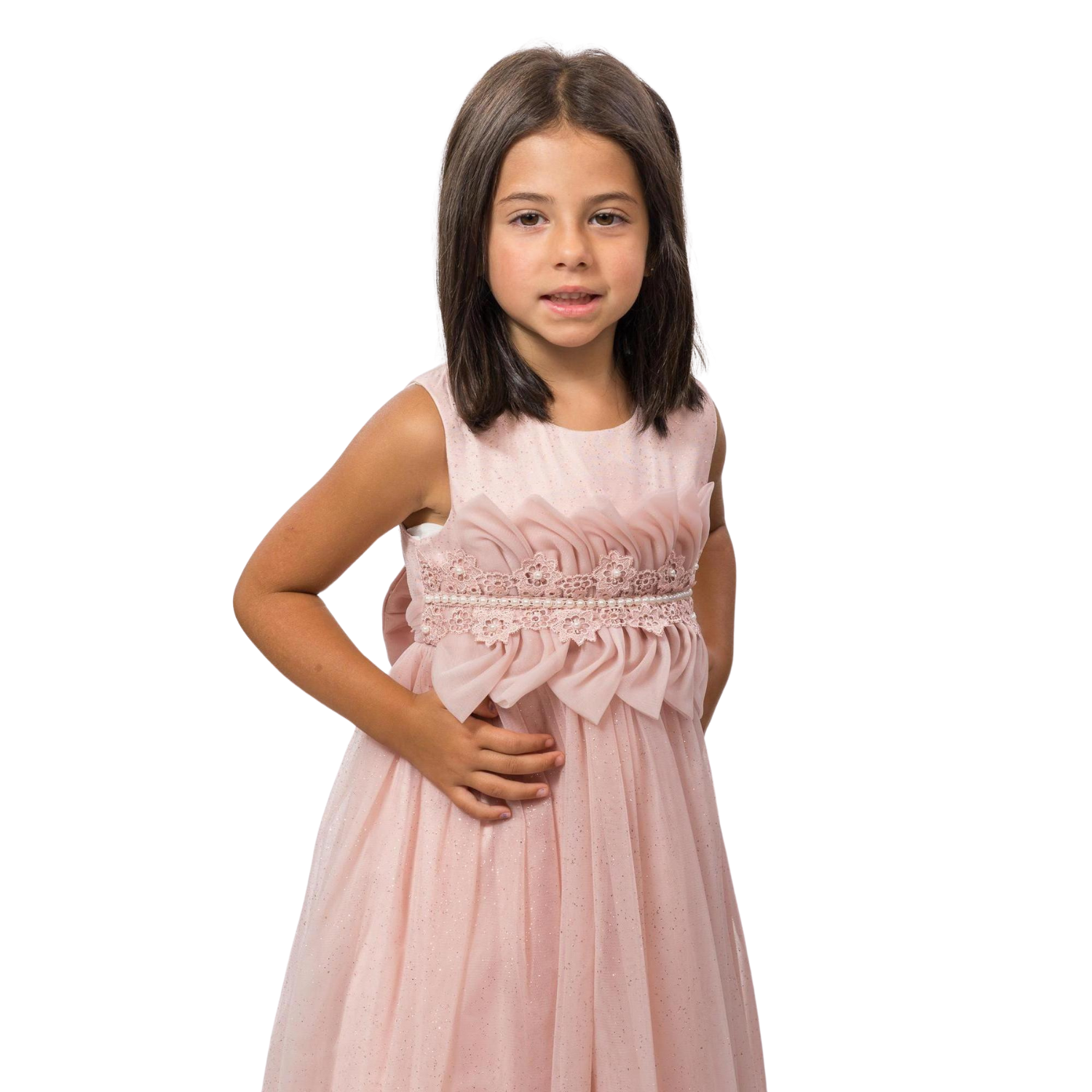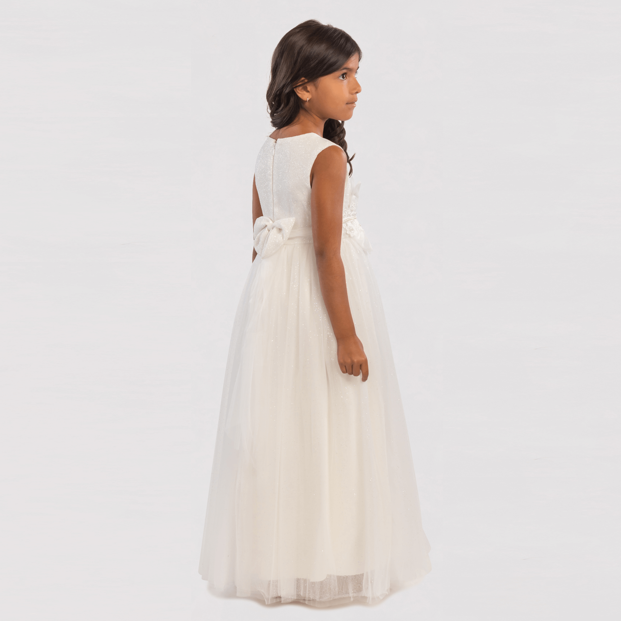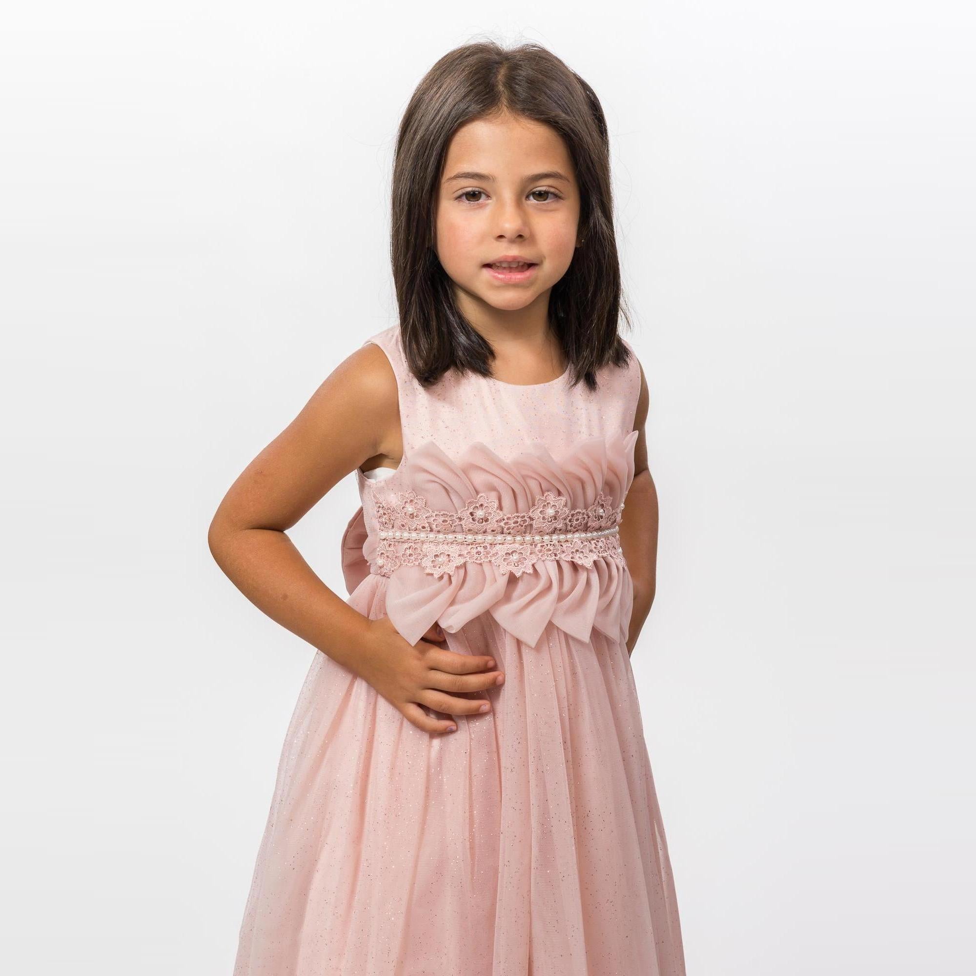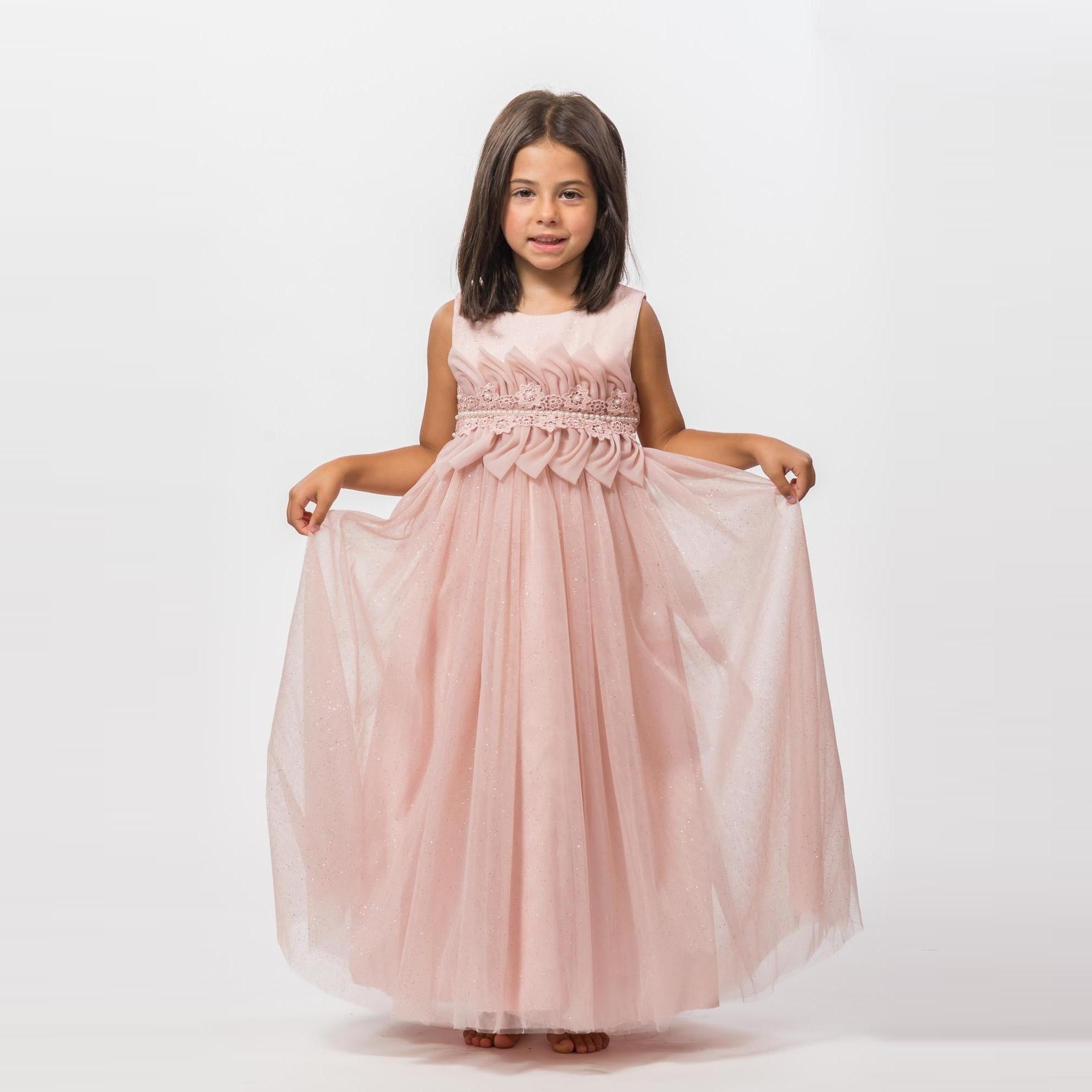 Beautiful long version of the Nana's Dress in shiny tulle with original V-shaped ruffles, lace and pearls on the waist will make your little one a real princess. An exclusive dress by JuniorKids!