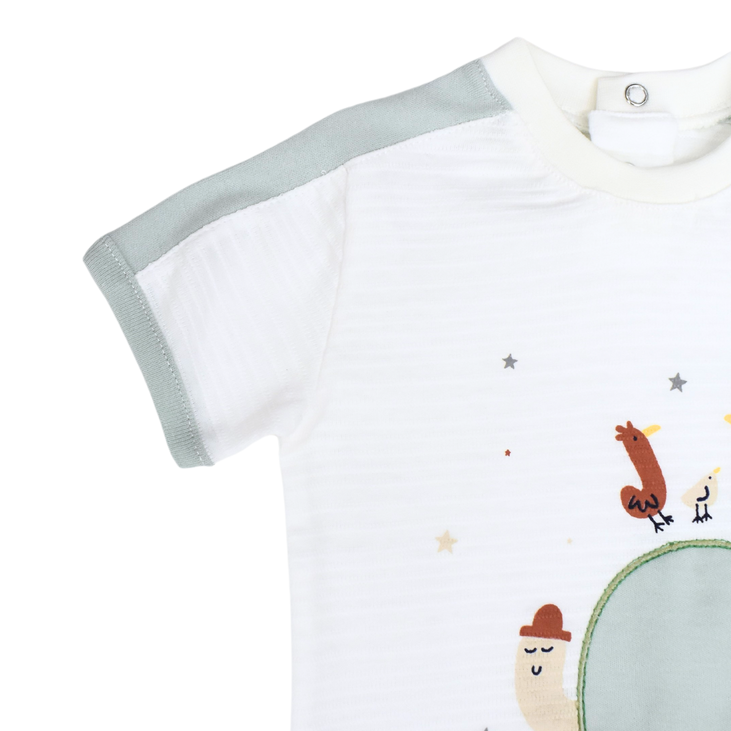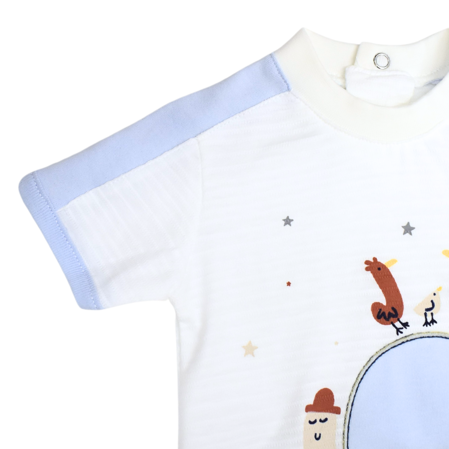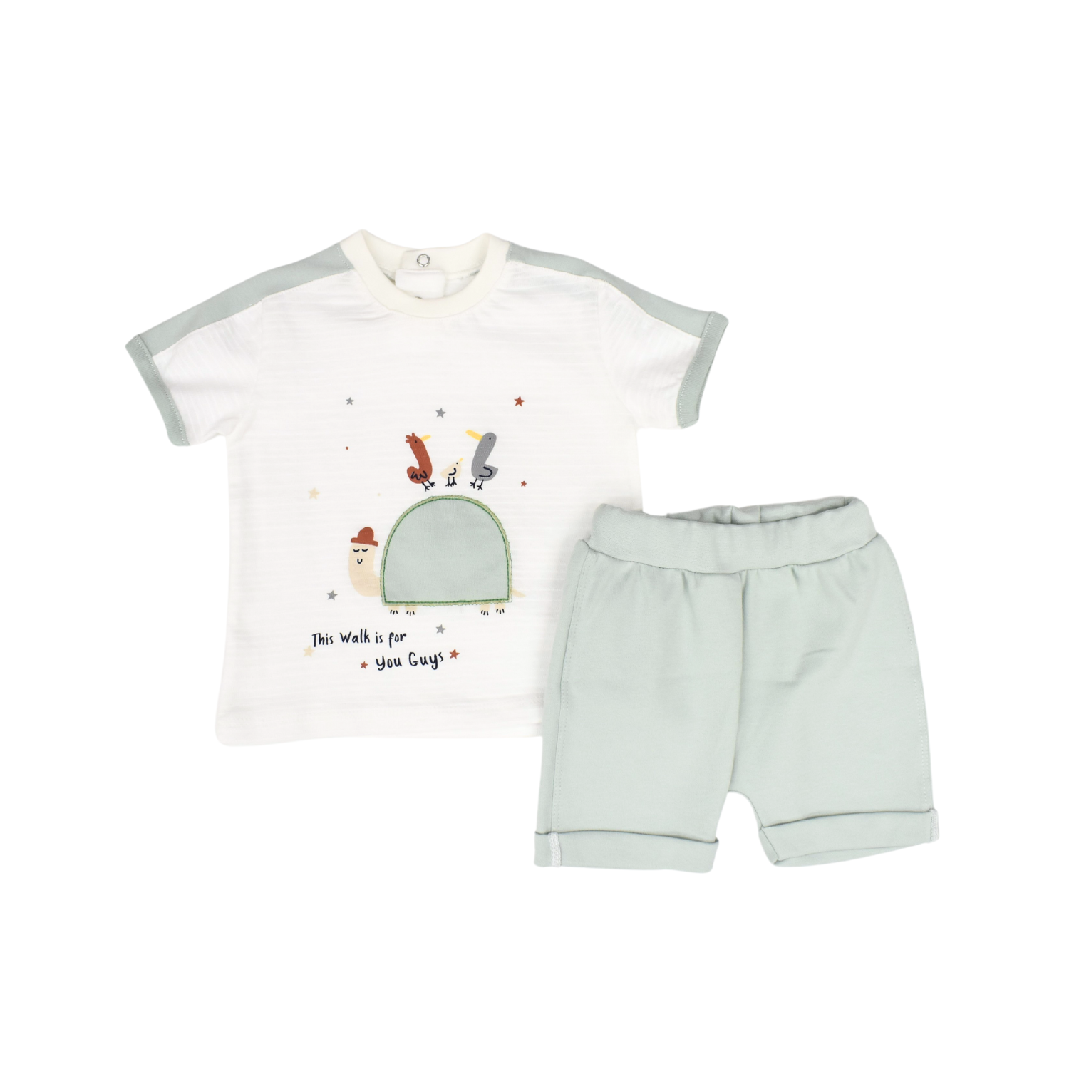 A new look for your little man featuring a soft cotton t-shirt with soft cotton elasticated waist shorts.
