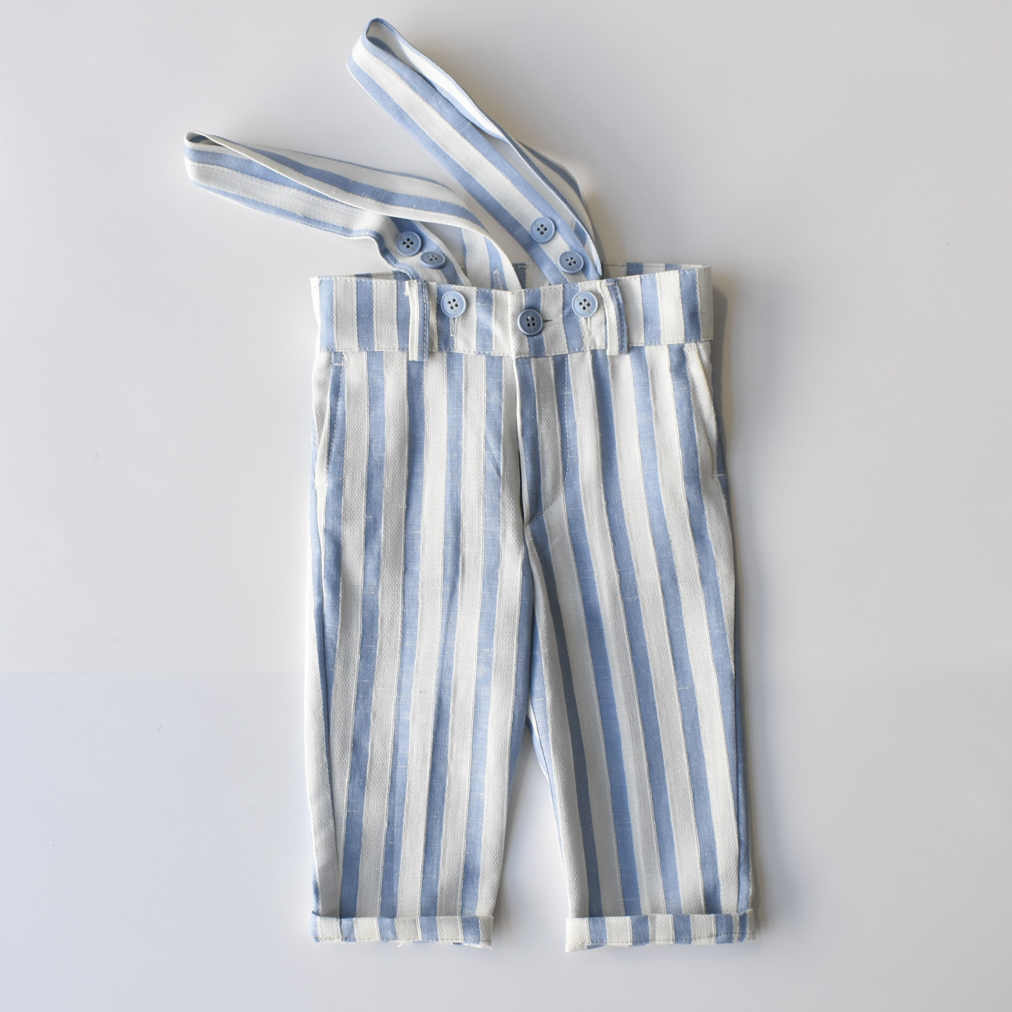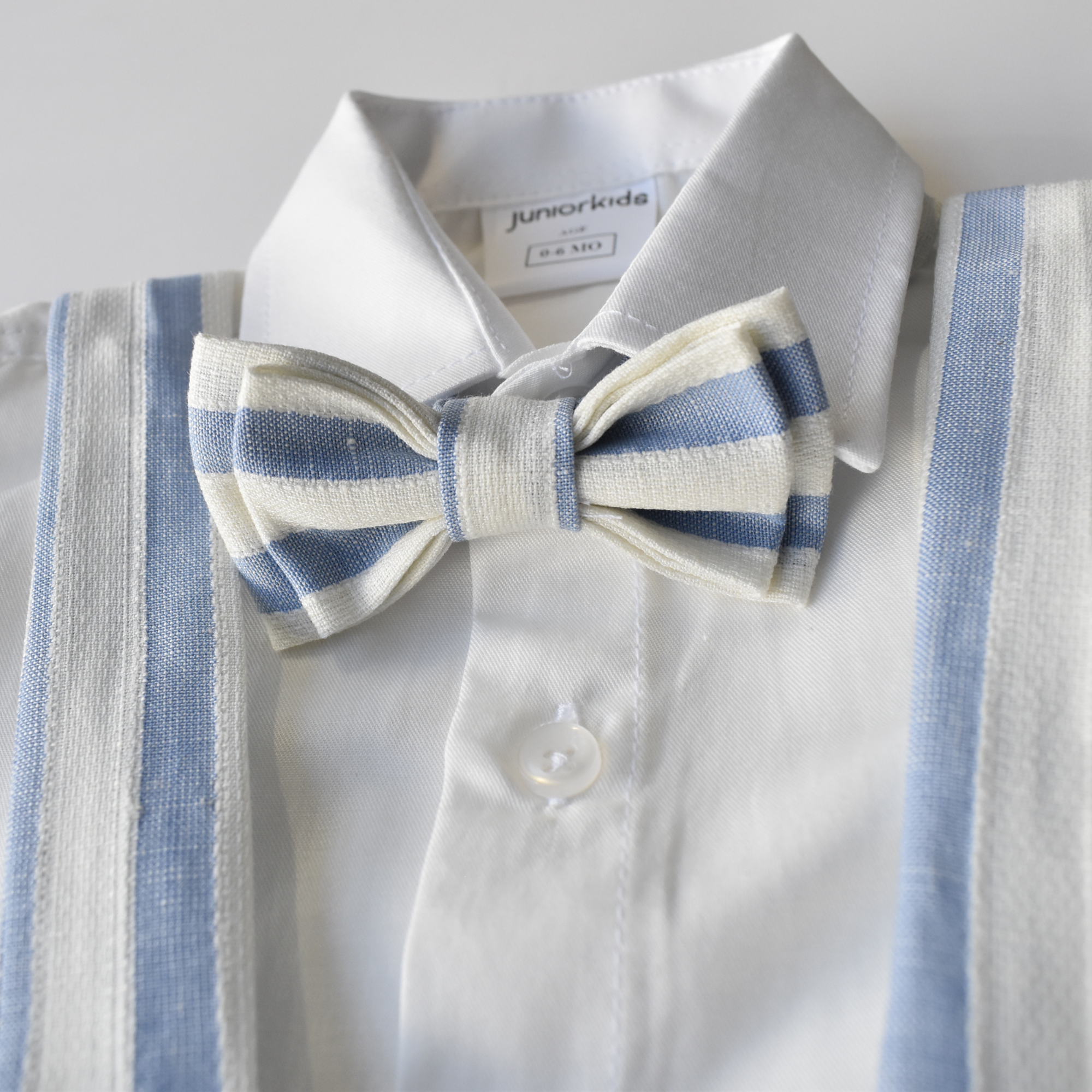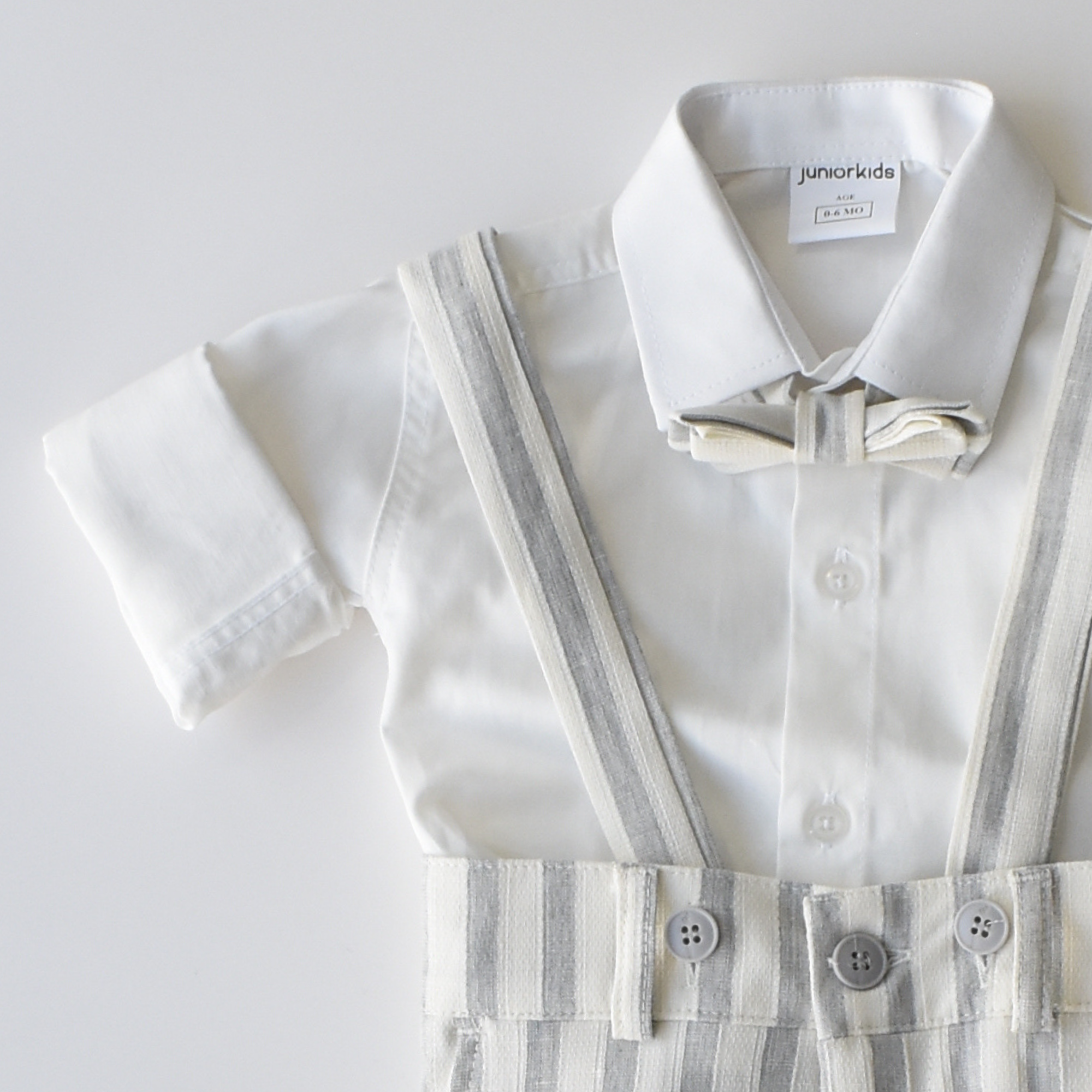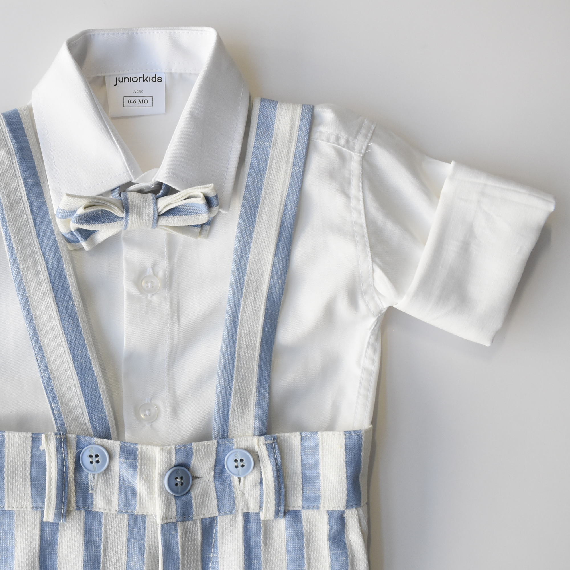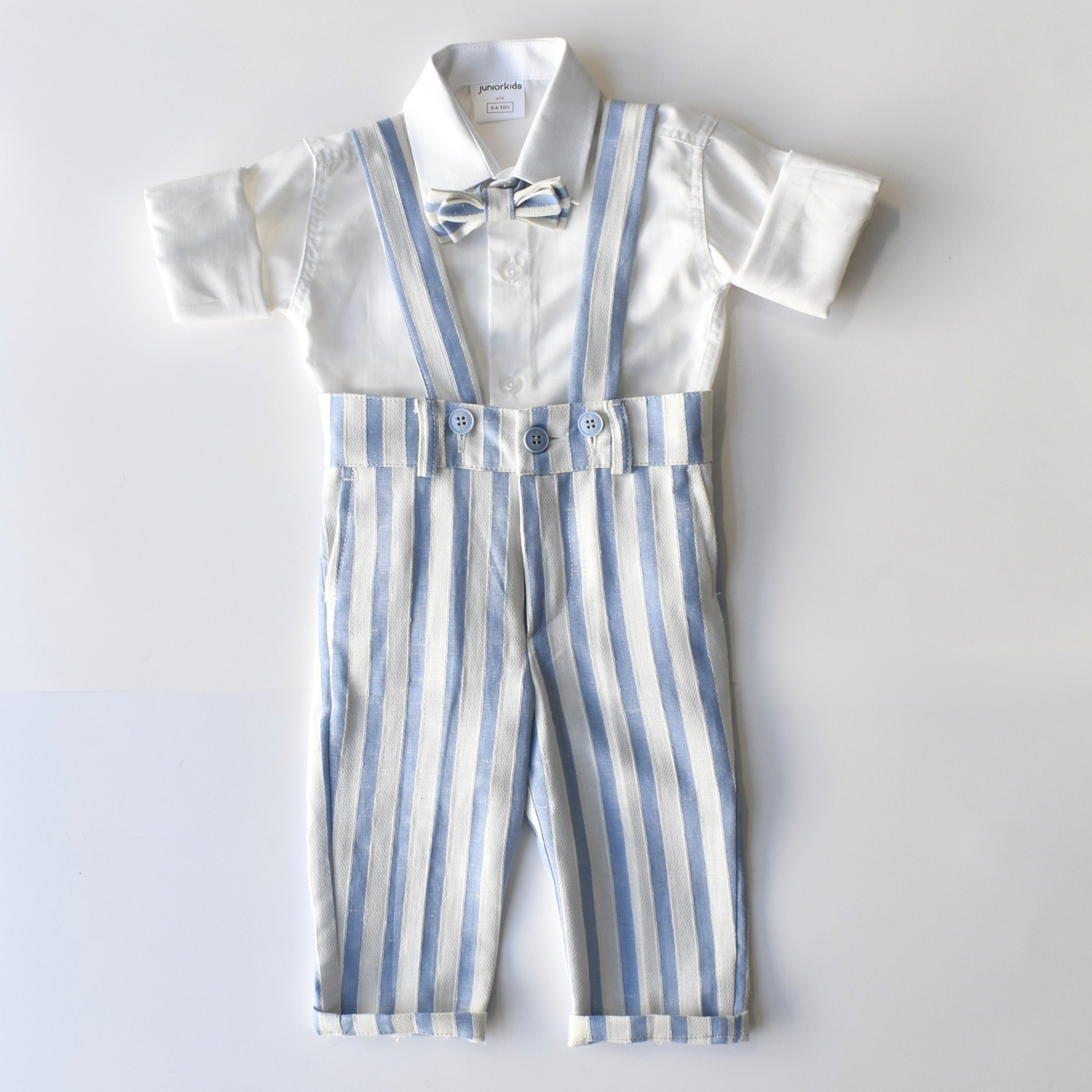 This stylish baptism set features a trendy, European-inspired look that is both elegant and comfortable. It includes a cotton shirt, striped suspender pants, and the option to wear it with or without a sleeveless vest and bowtie for a complete, polished look. Perfect for making a statement on your special day!