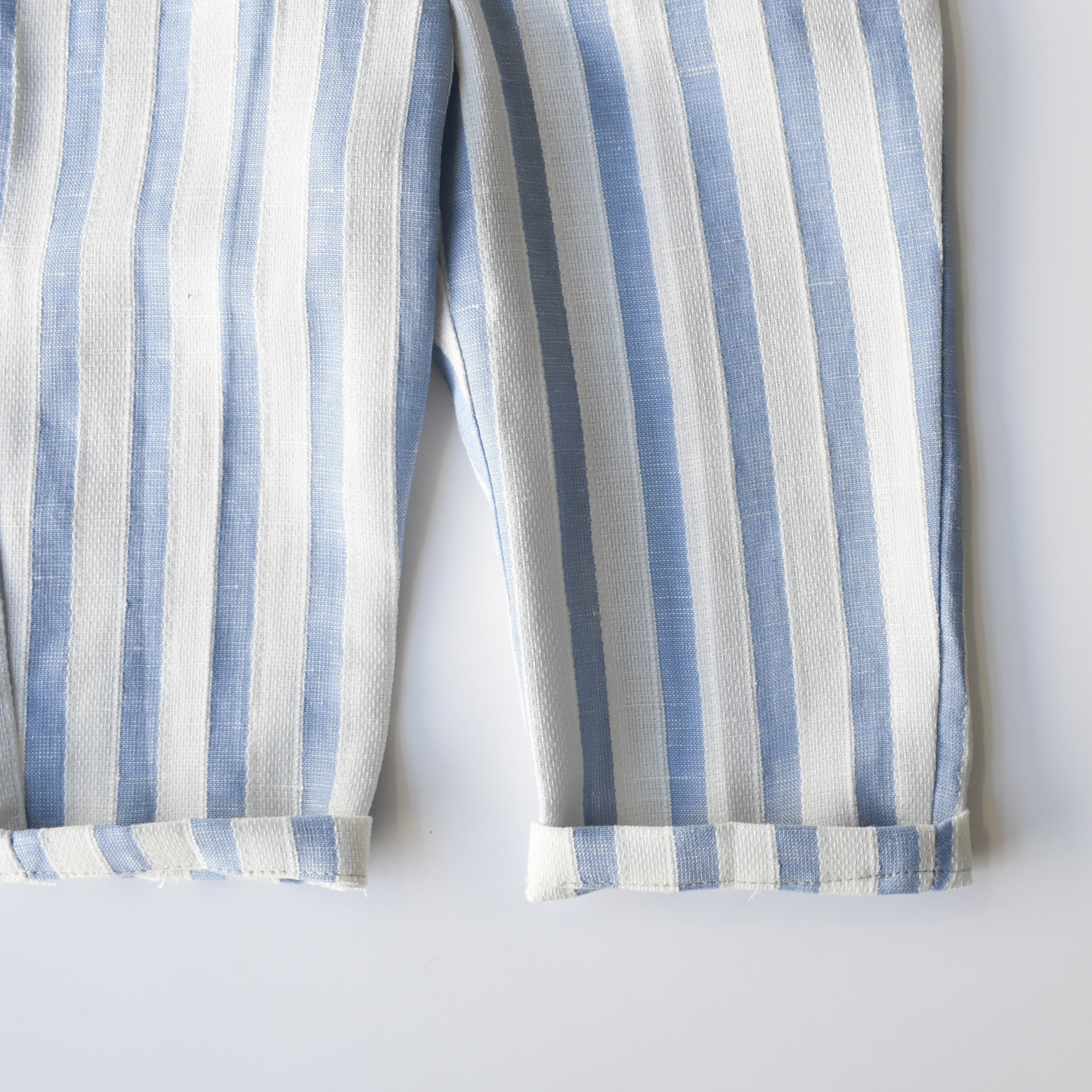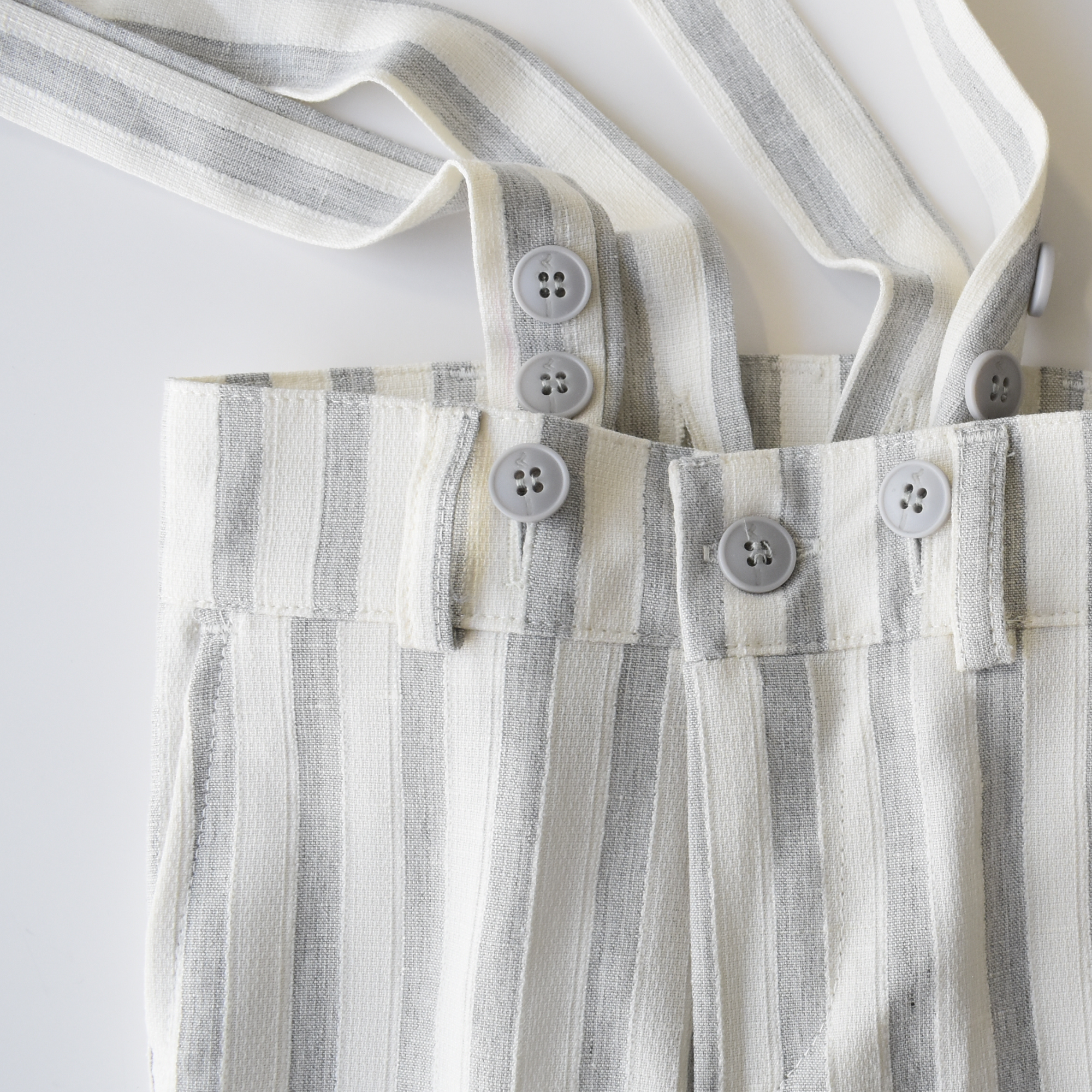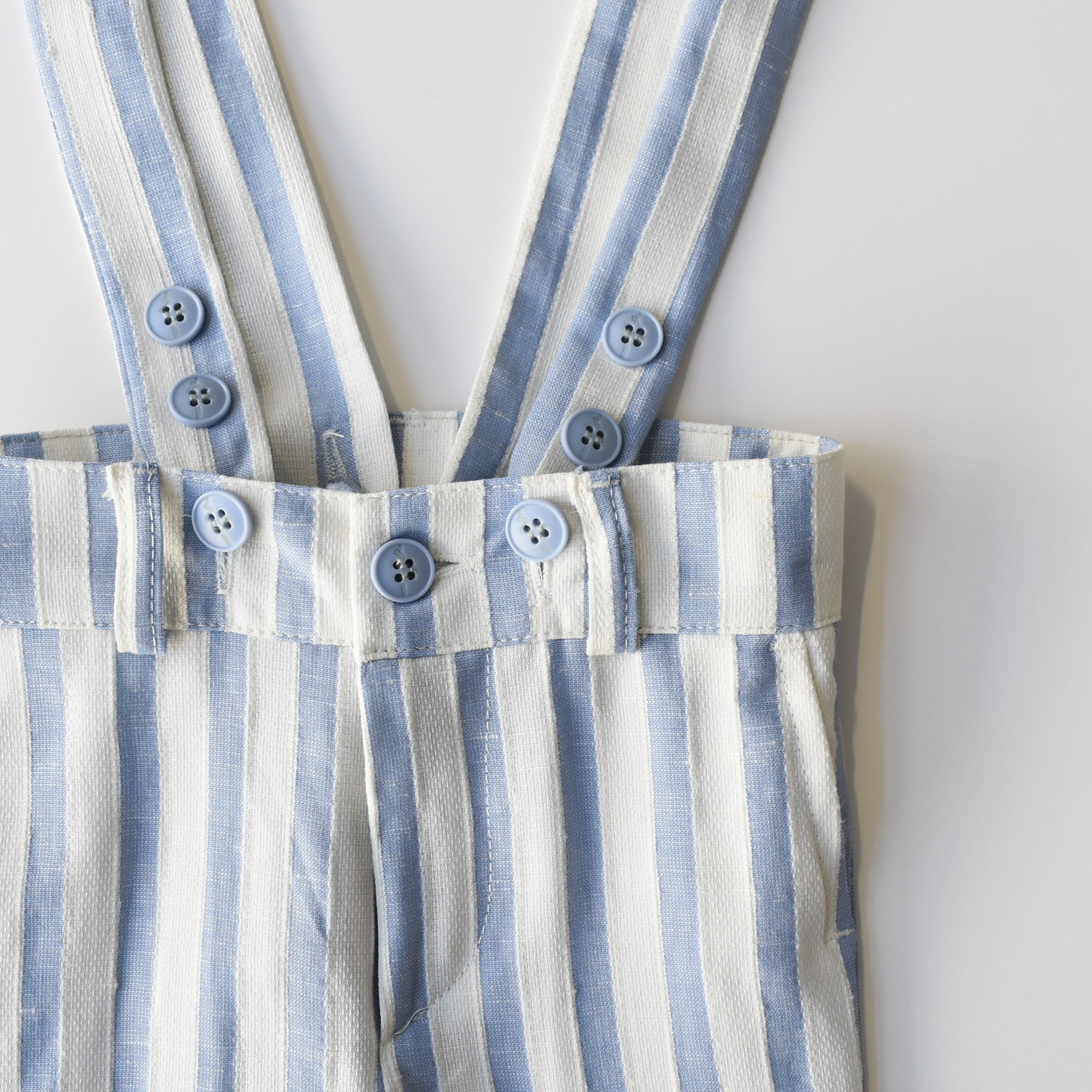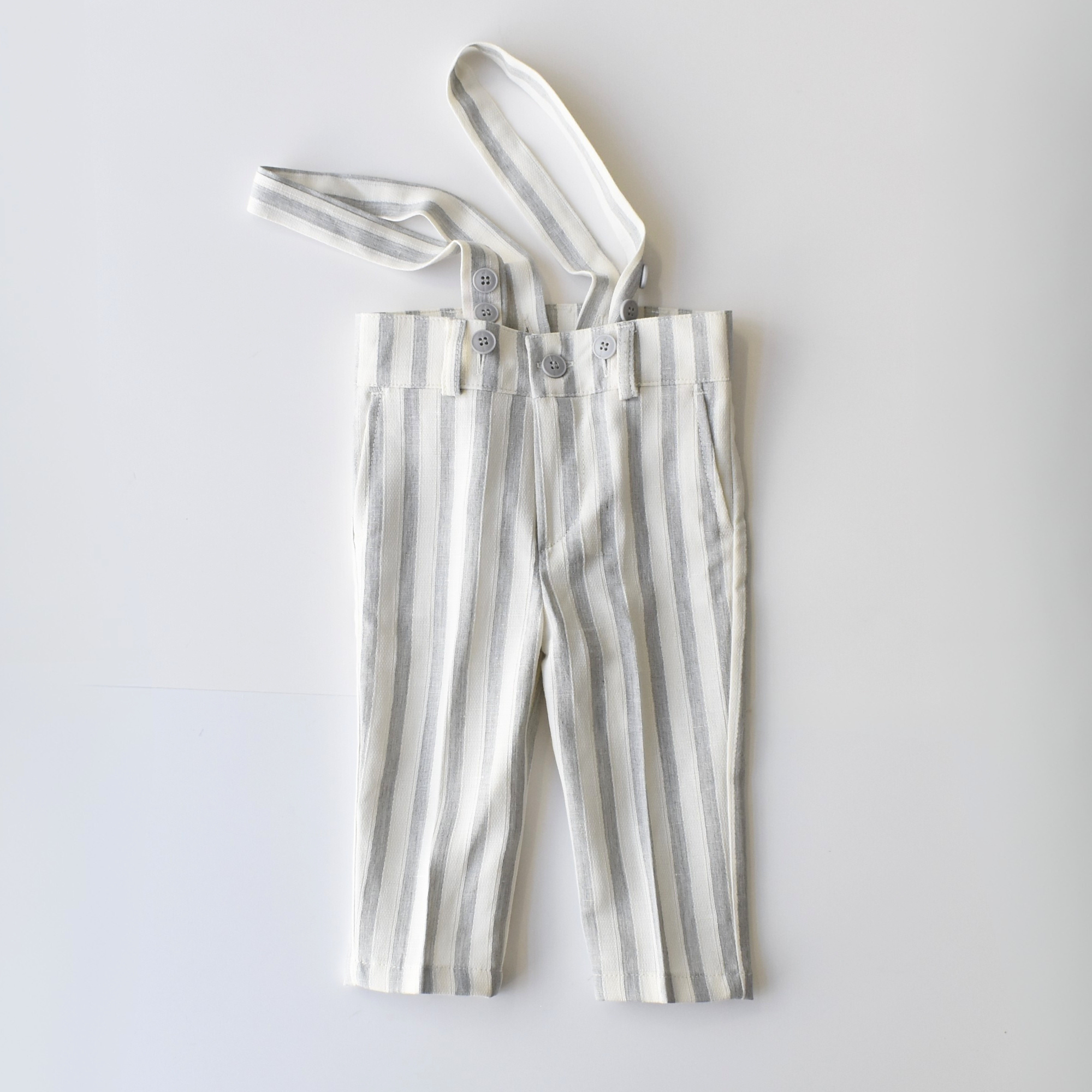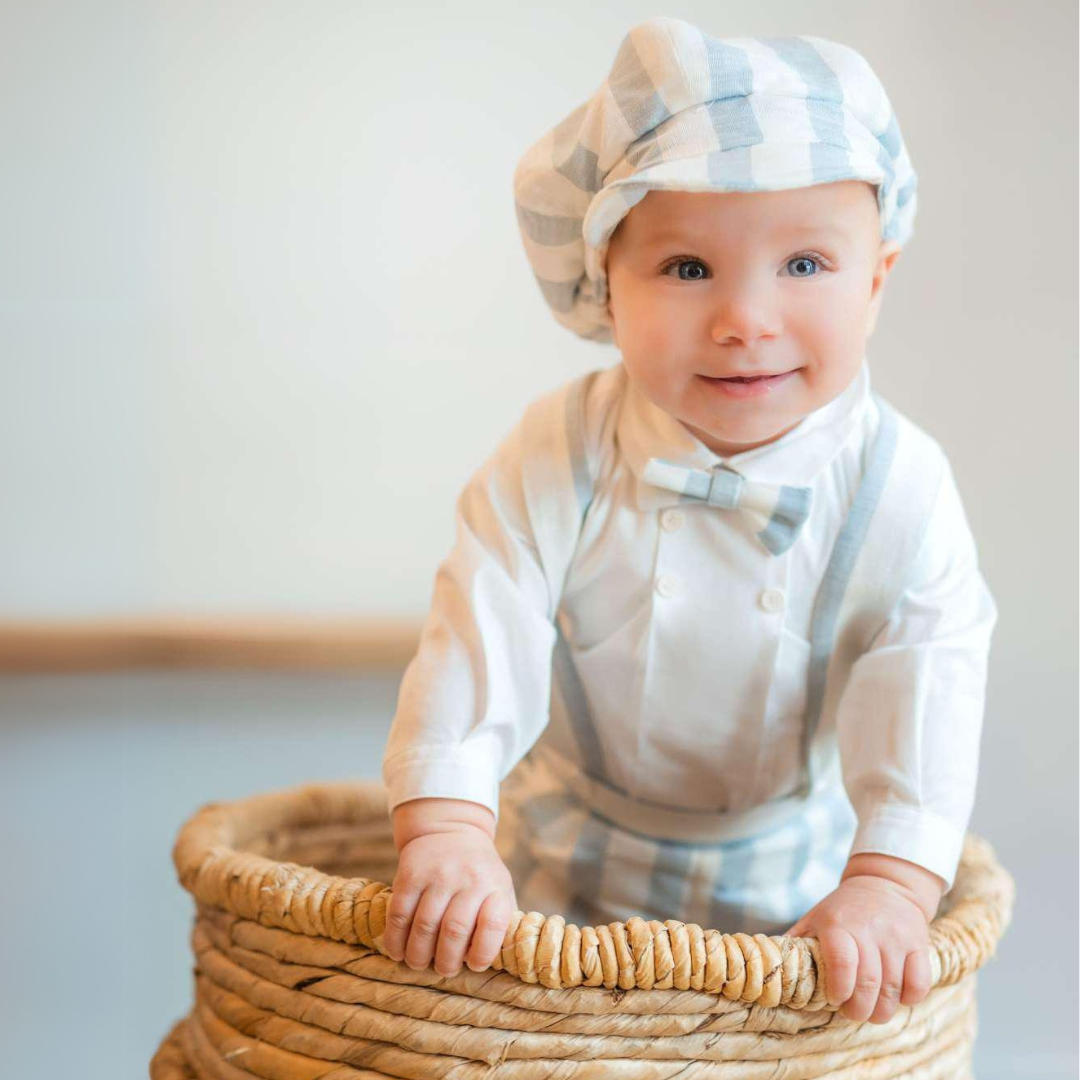 This stylish baptism set features a trendy, European-inspired look that is both elegant and comfortable. It includes a cotton shirt, striped suspender pants, and the option to wear it with or without a sleeveless vest and bowtie for a complete, polished look. Perfect for making a statement on your special day!