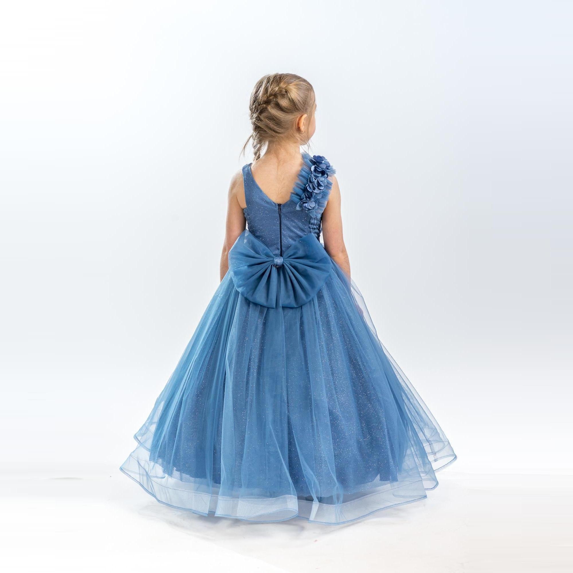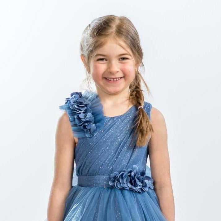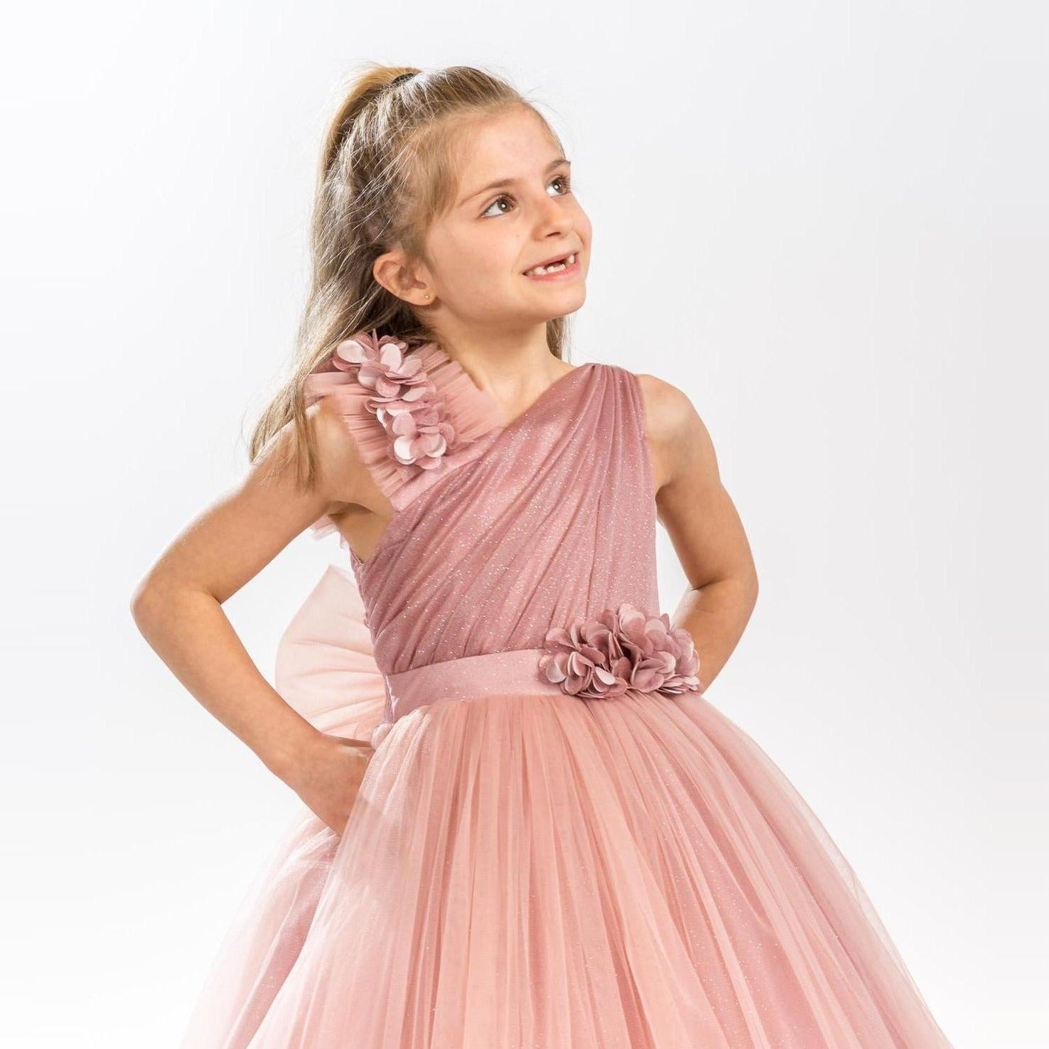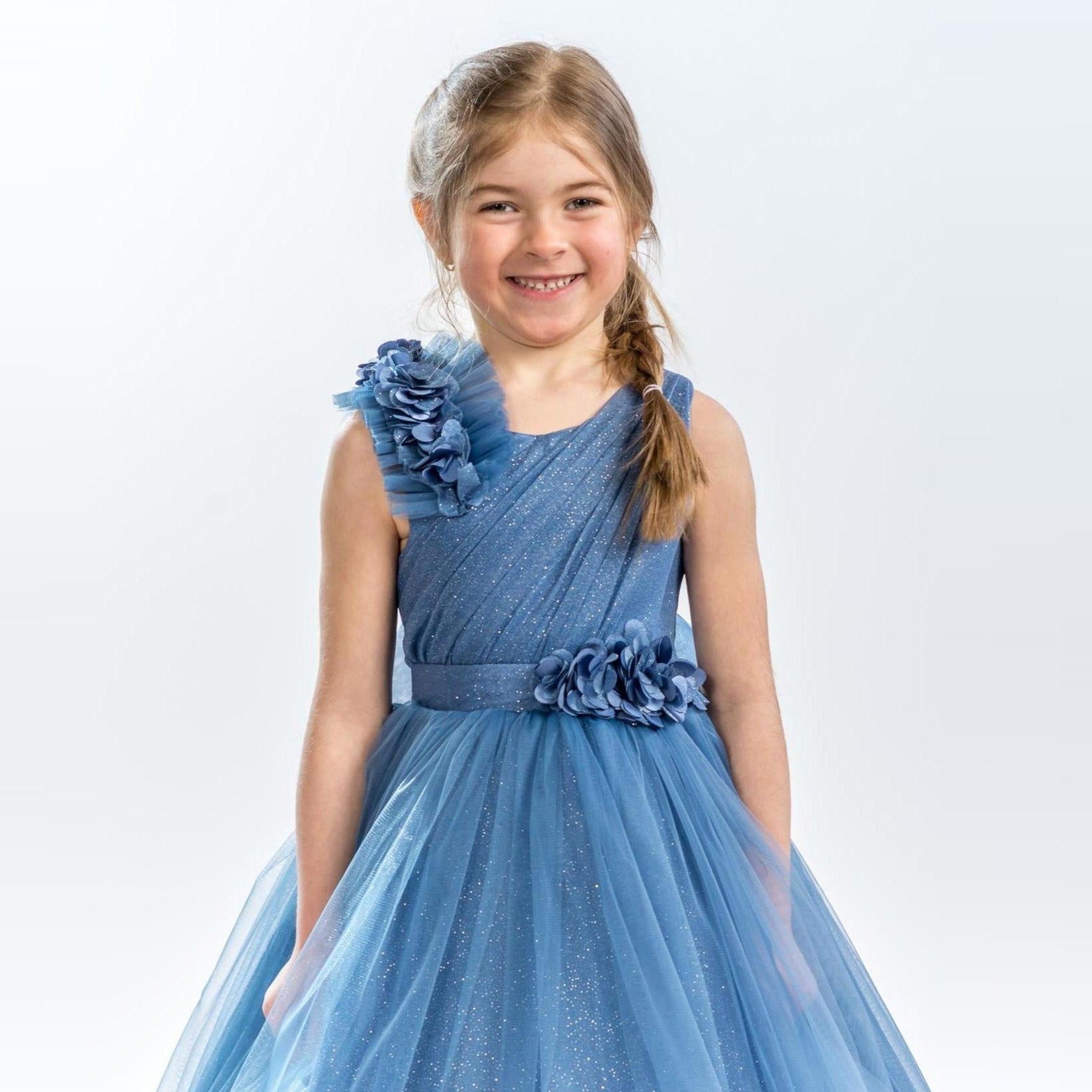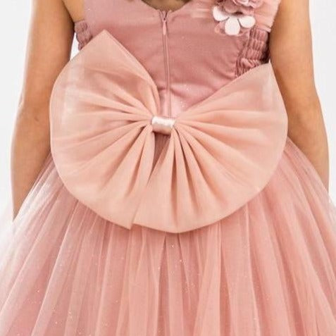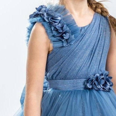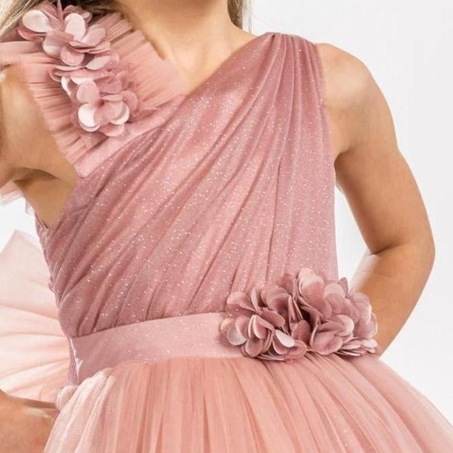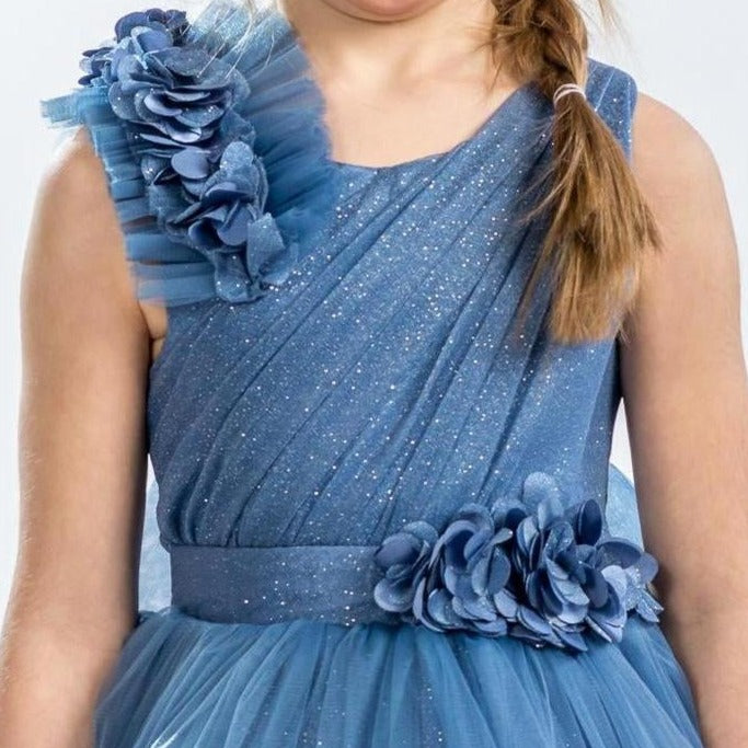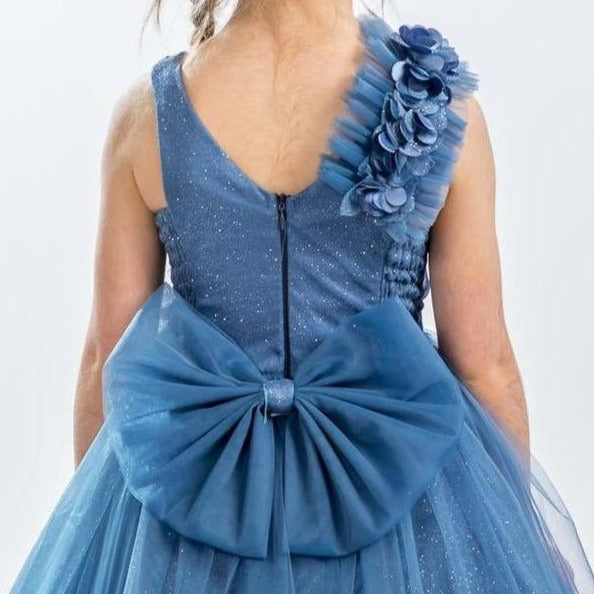 It's all in the details. Elegant, very poufy tulle dress with beautiful flowers on the shoulder and waistline, and a big removable bow in the back. An exclusive JuniorKids creation!