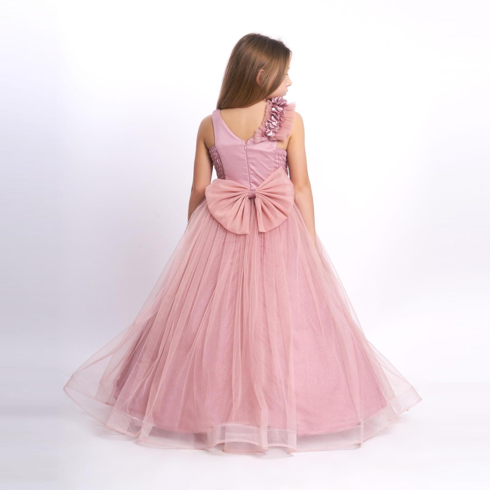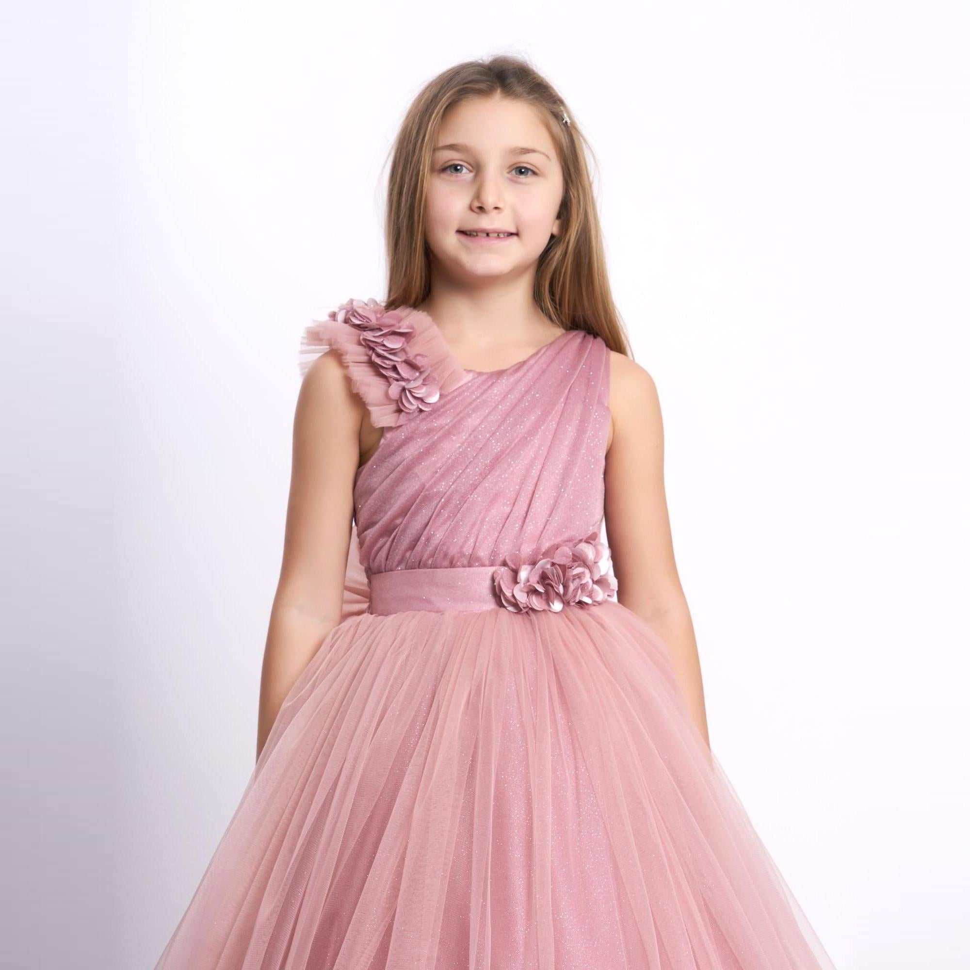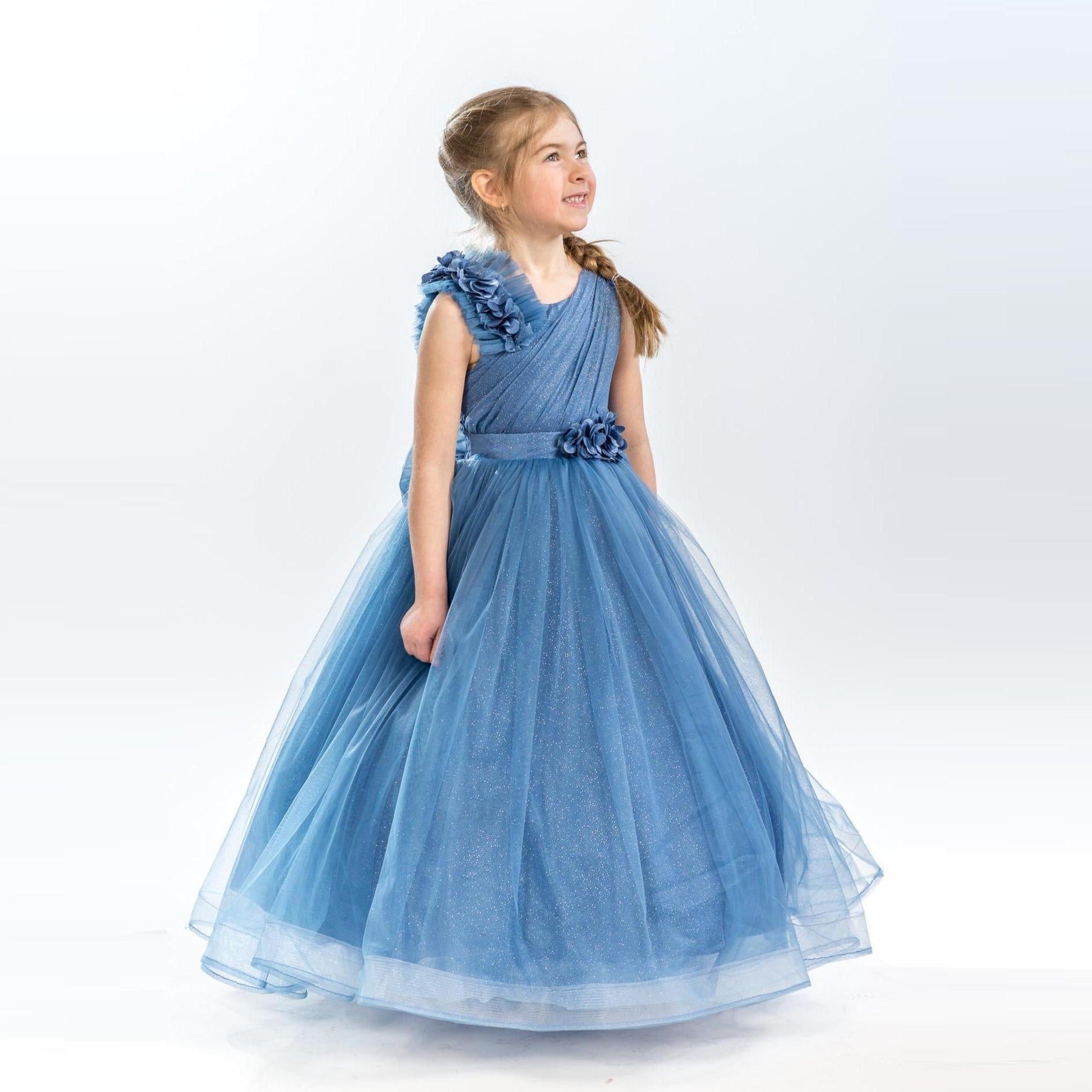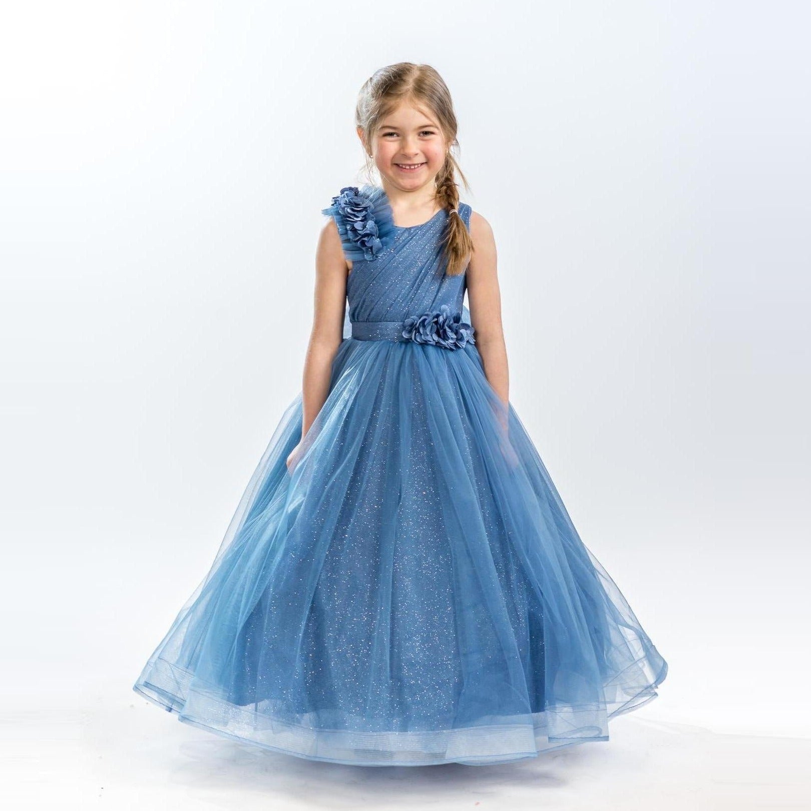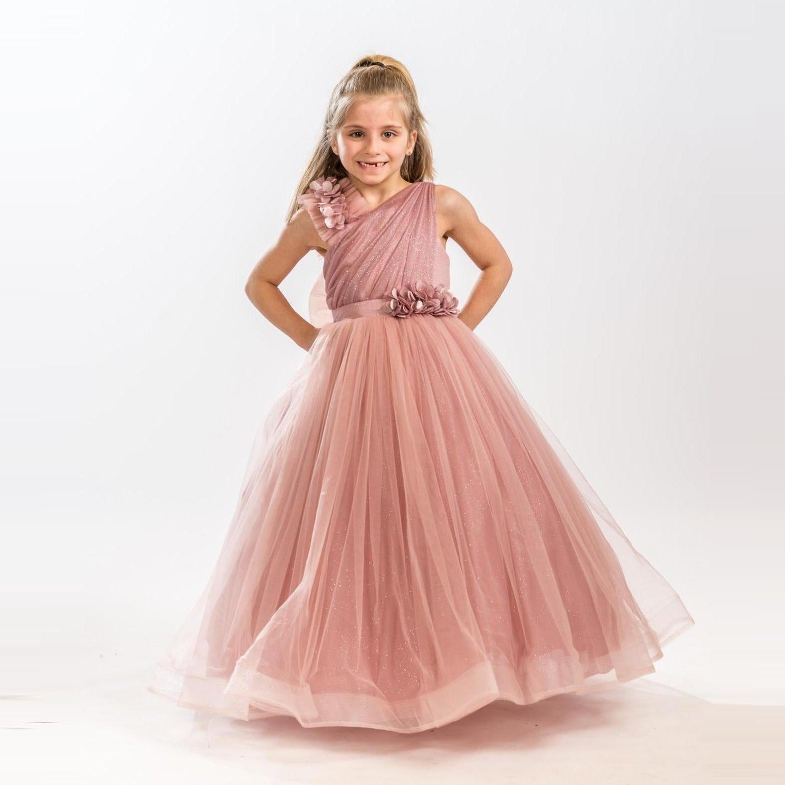 It's all in the details. Elegant, very poufy tulle dress with beautiful flowers on the shoulder and waistline, and a big removable bow in the back. An exclusive JuniorKids creation!