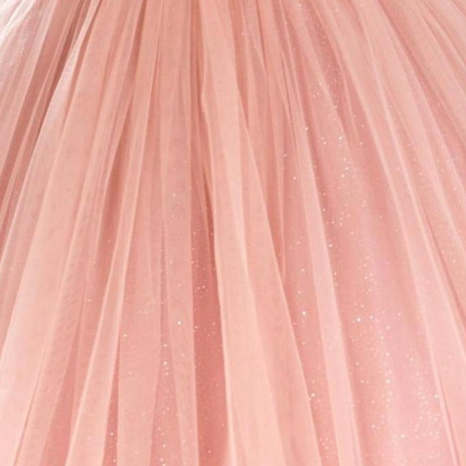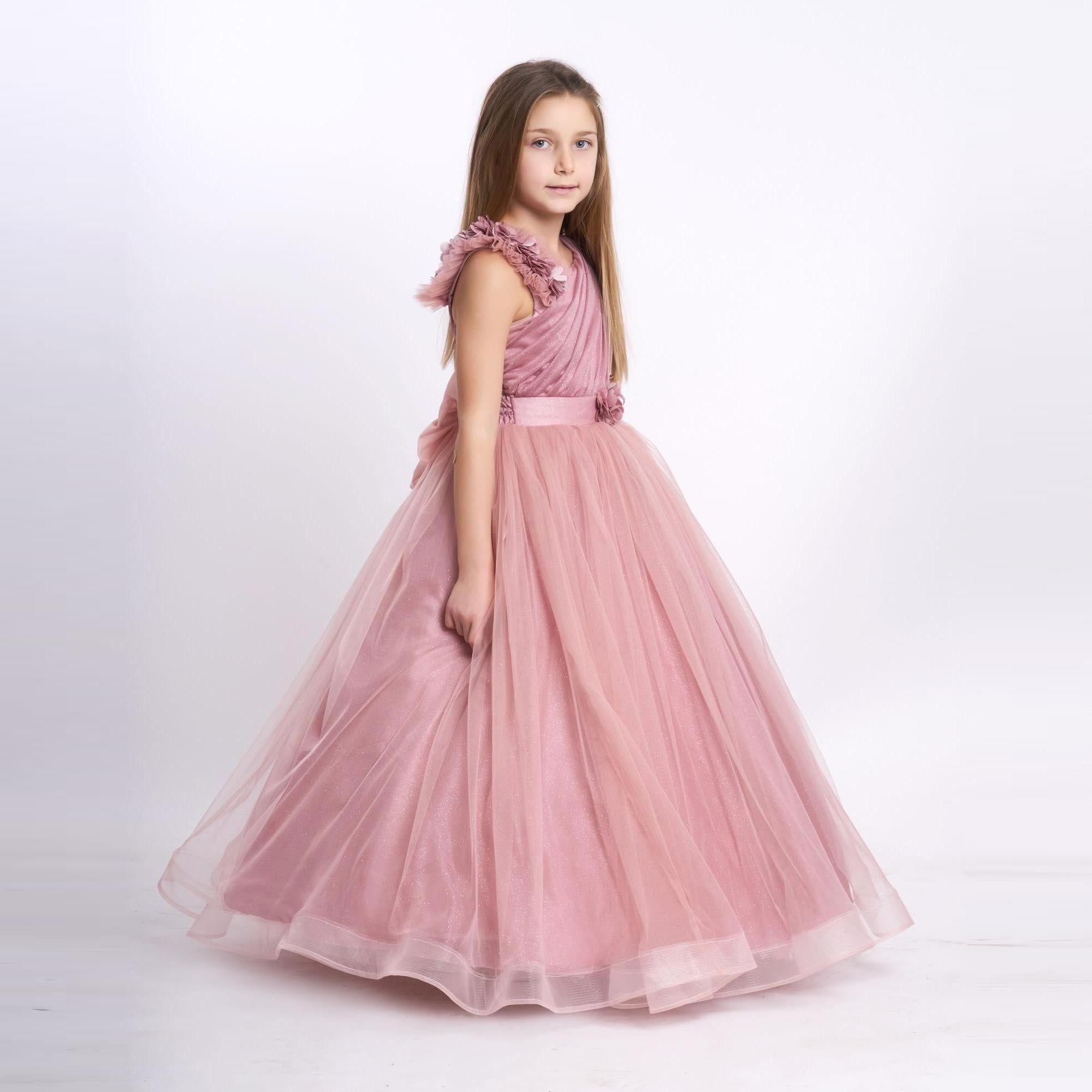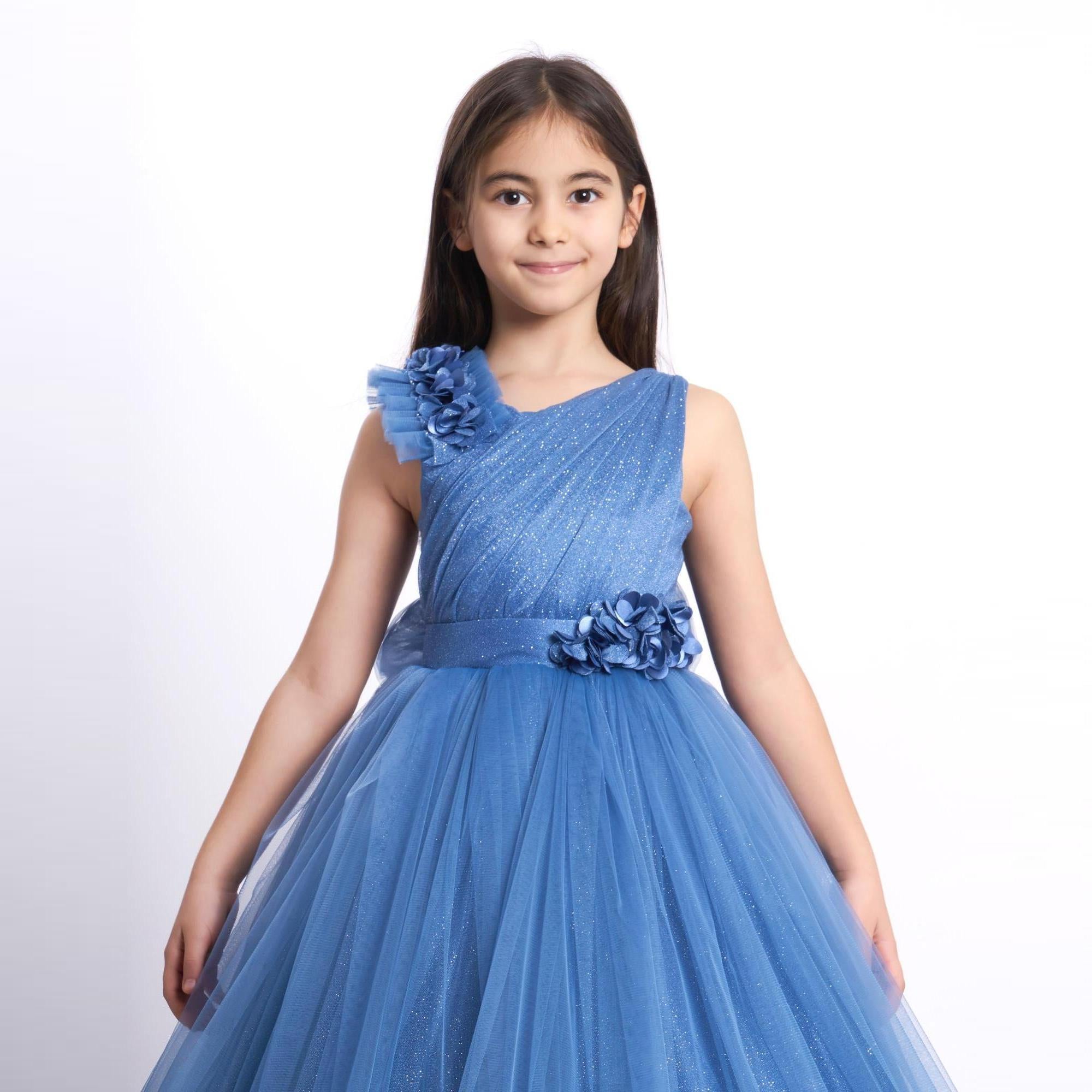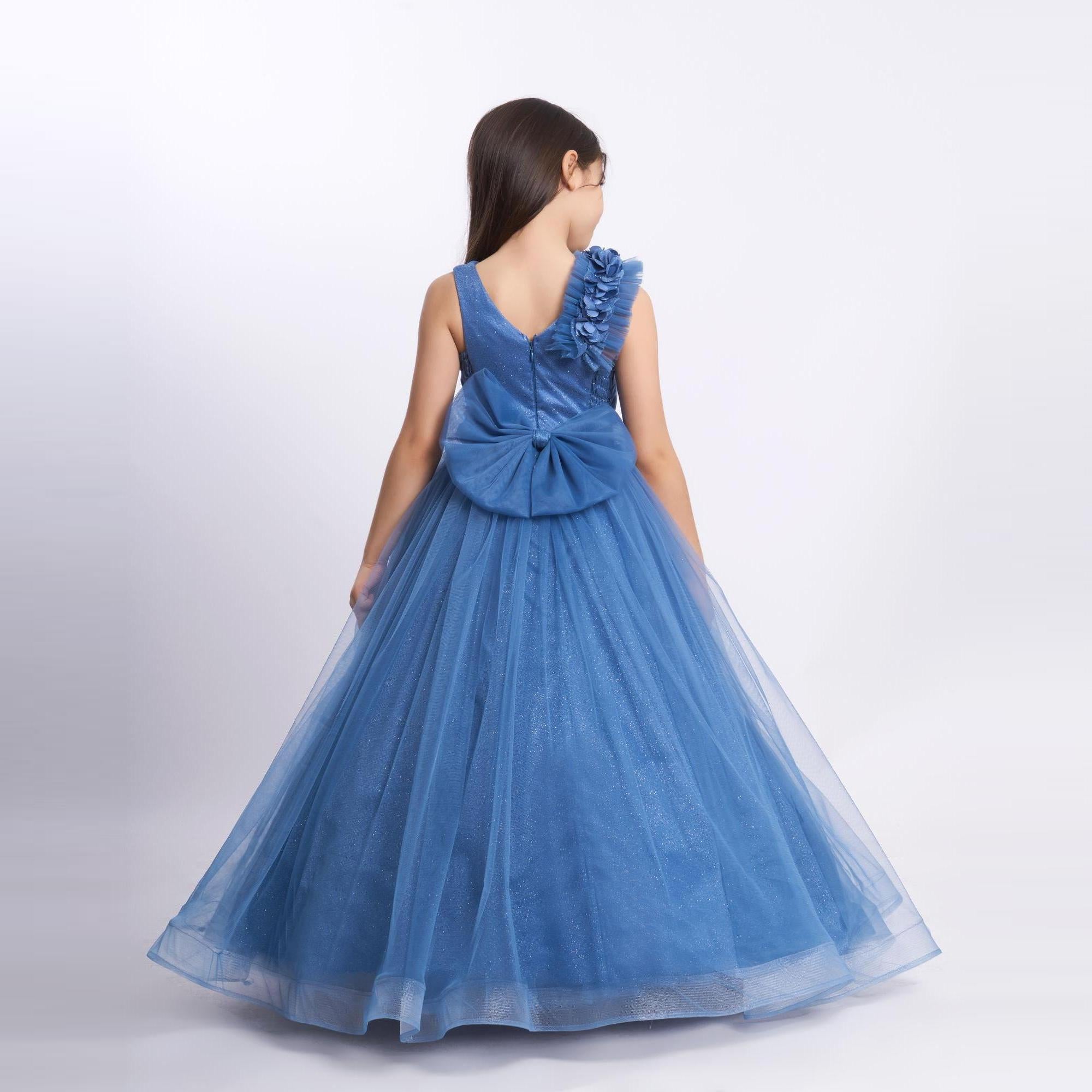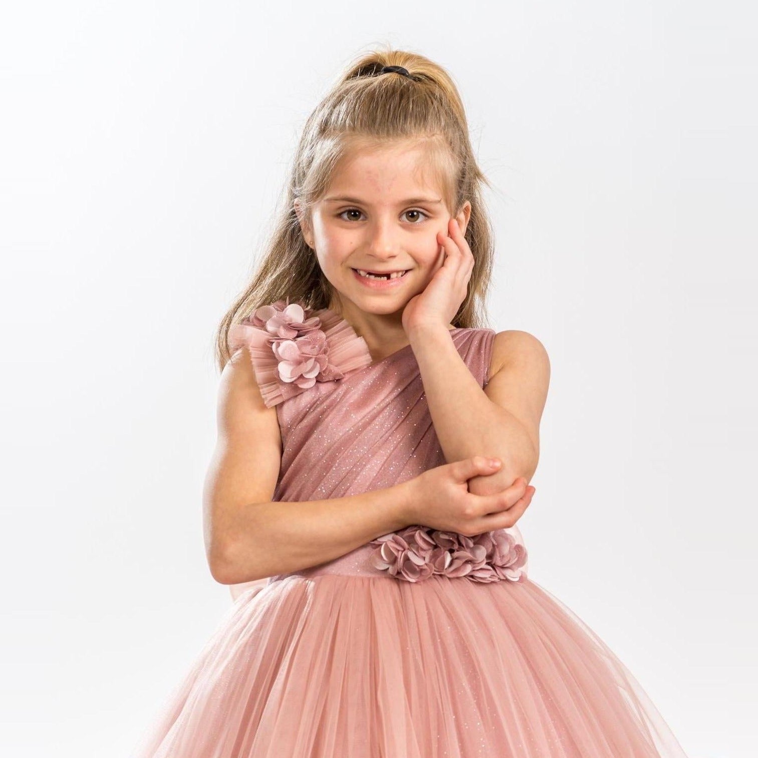 It's all in the details. Elegant, very poufy tulle dress with beautiful flowers on the shoulder and waistline, and a big removable bow in the back. An exclusive JuniorKids creation!