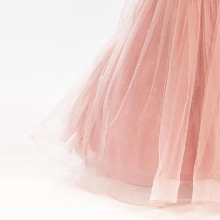 La beauté est dans les détails. Elégante robe en tulle très bouffante avec de belles fleurs sur les bretelles et sur la taille ainsi qu'un gros noeud amovible dans le dos. Un style unique en son genre, une création JuniorKids!