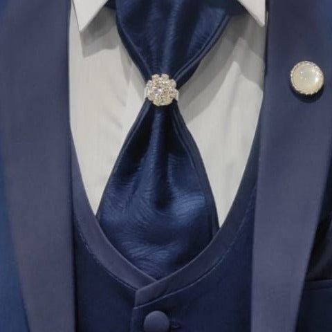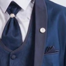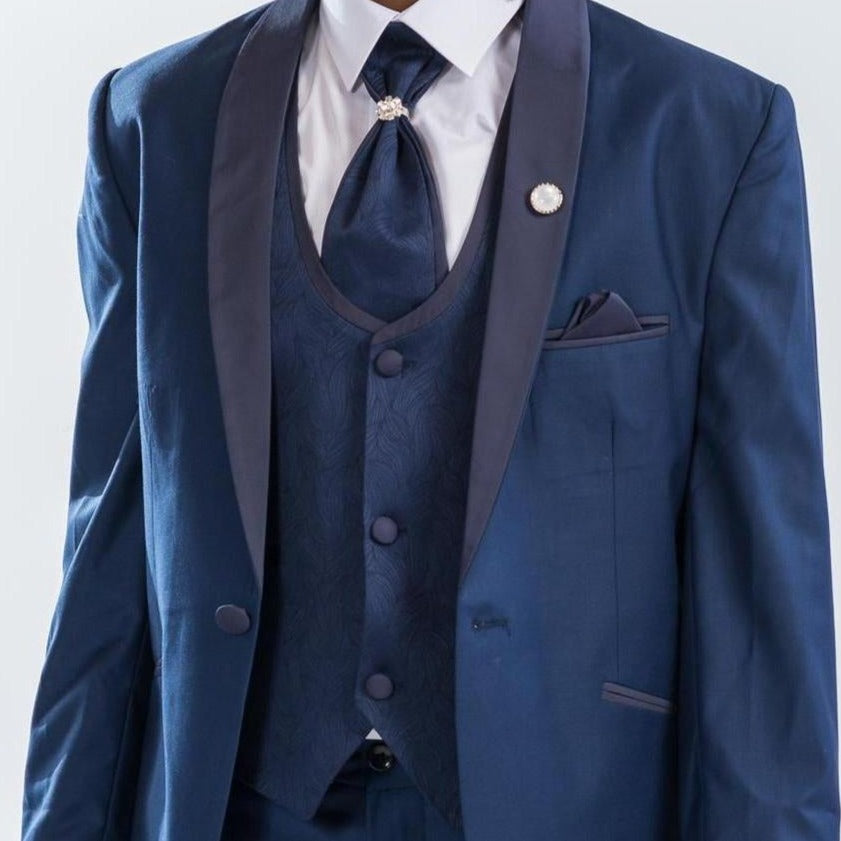 Royal Tie and Decorative Pin: The tuxedo is finished with a royal tie and a decorative pin, both adding extra flair and style. The royal blue tie perfectly complements the tuxedo, and the pin adds a final touch of elegance.