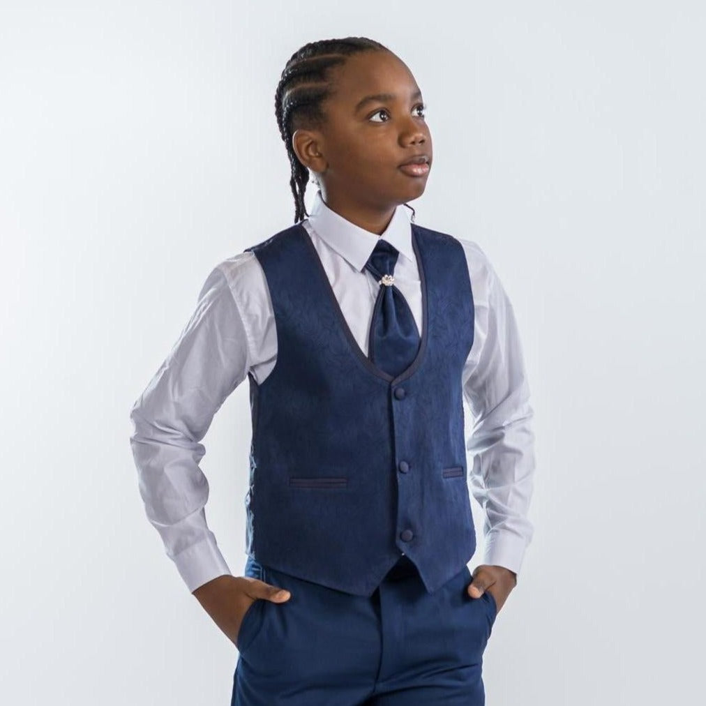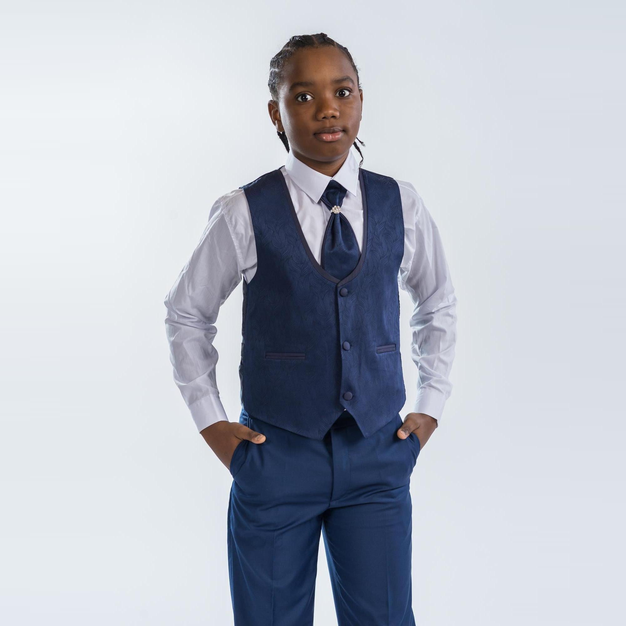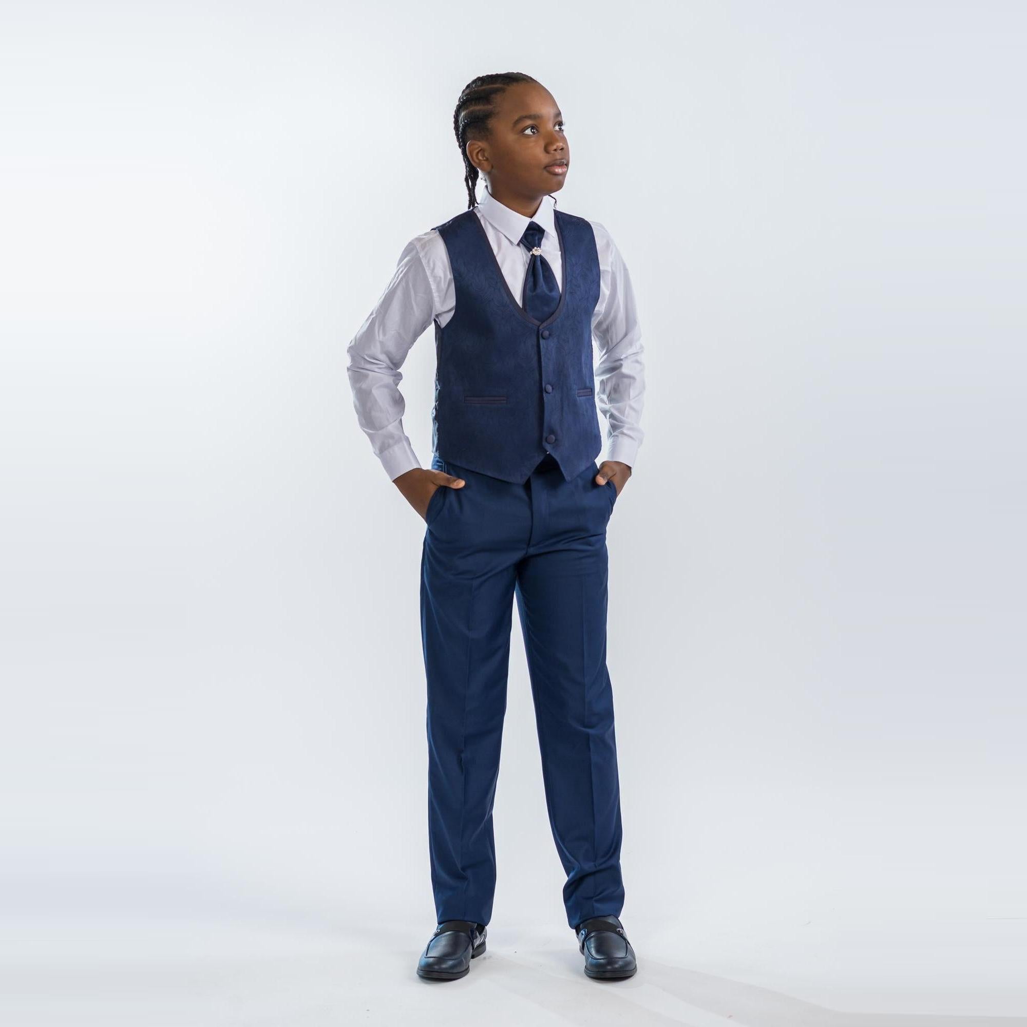 Adjustable Waist Pants: The matching pants are designed with an adjustable waist to ensure the perfect fit for growing kids. Crafted from the same 68% polyester / 32% viscose blend, the pants are slim-fitting for a sleek appearance, complementing the tailored jacket and vest.