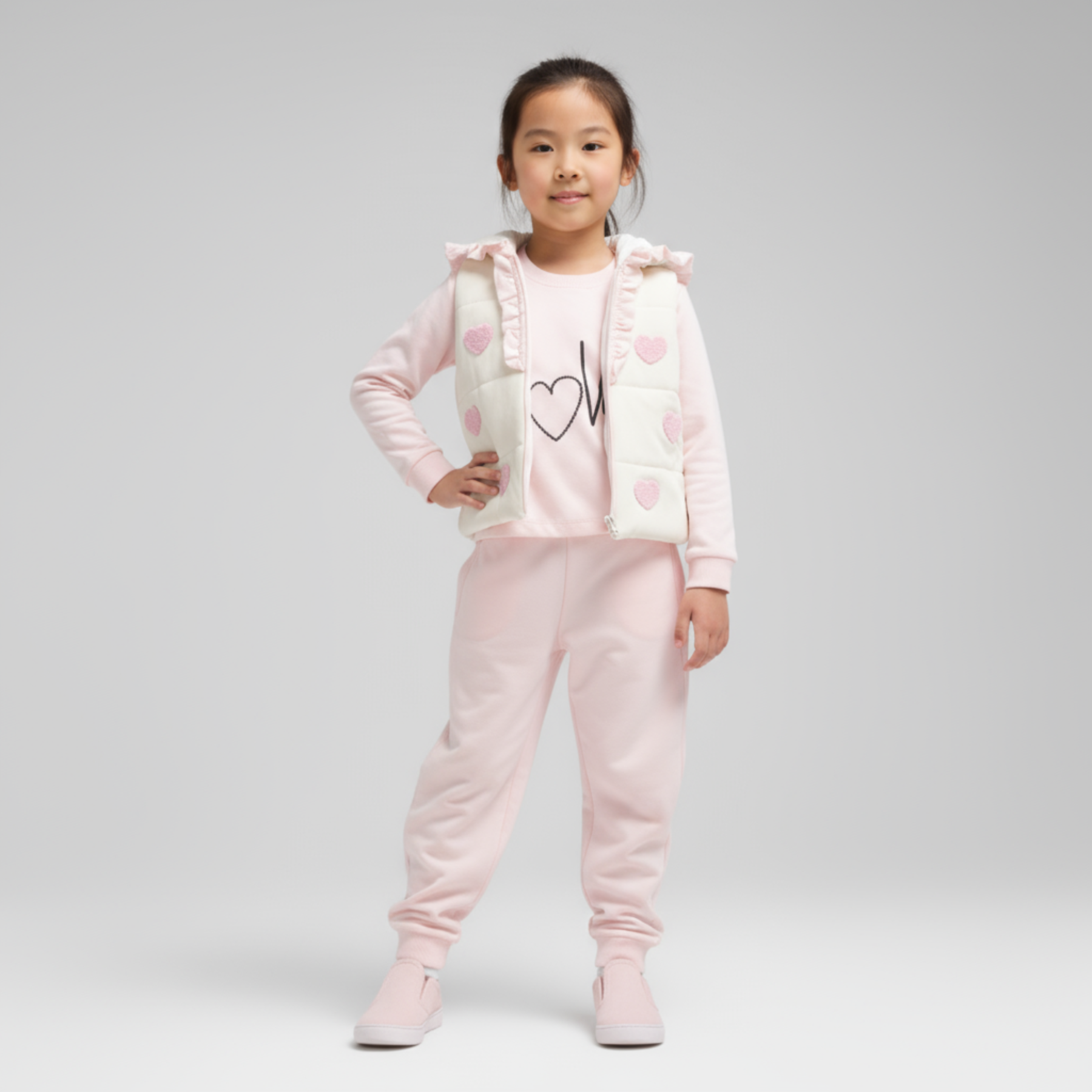 Quilted Hooded Vest – Sleeveless with a playful ruffle-trimmed hood and scattered heart appliqués for a touch of whimsy.