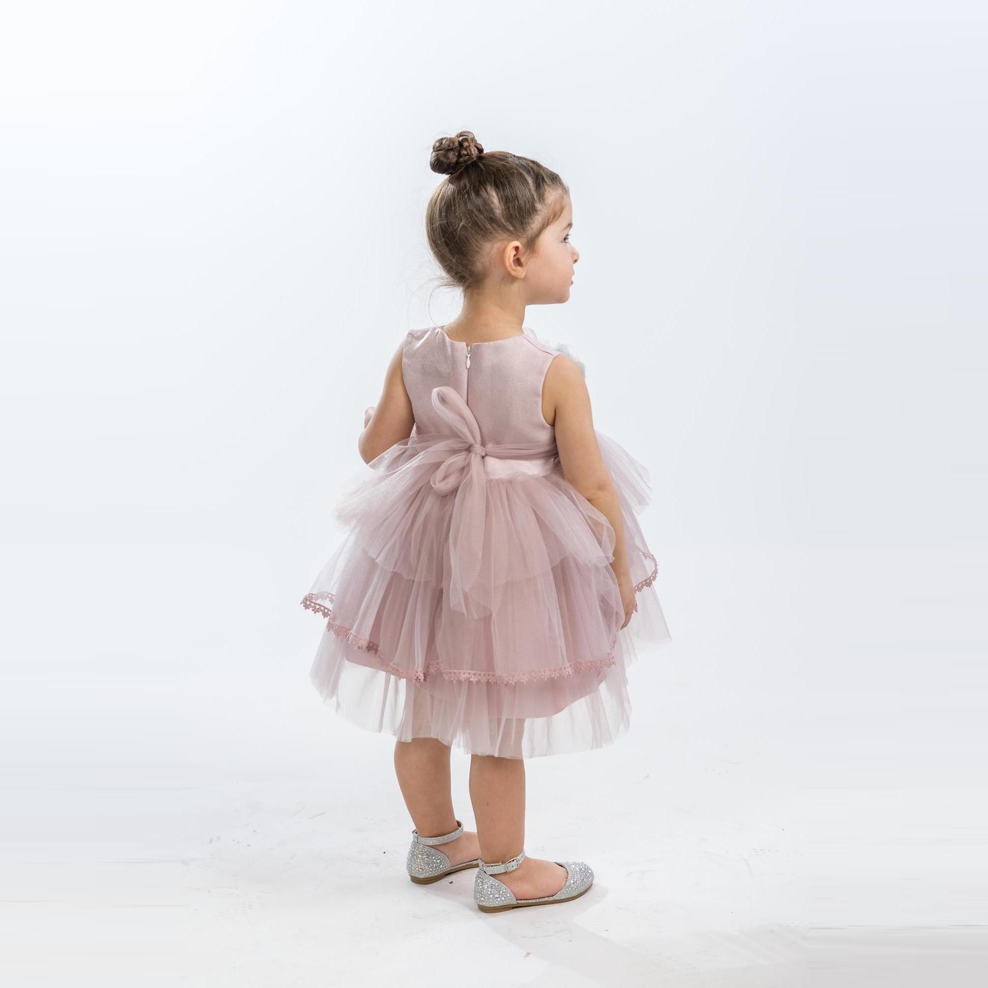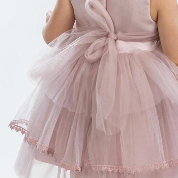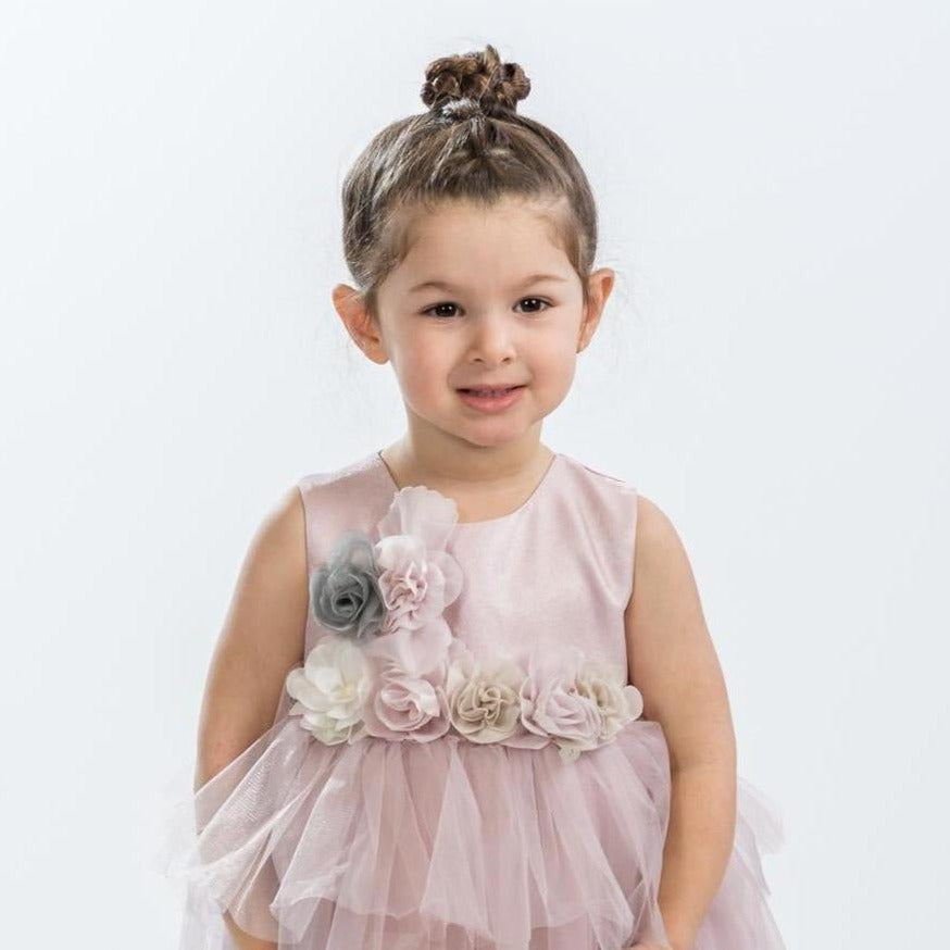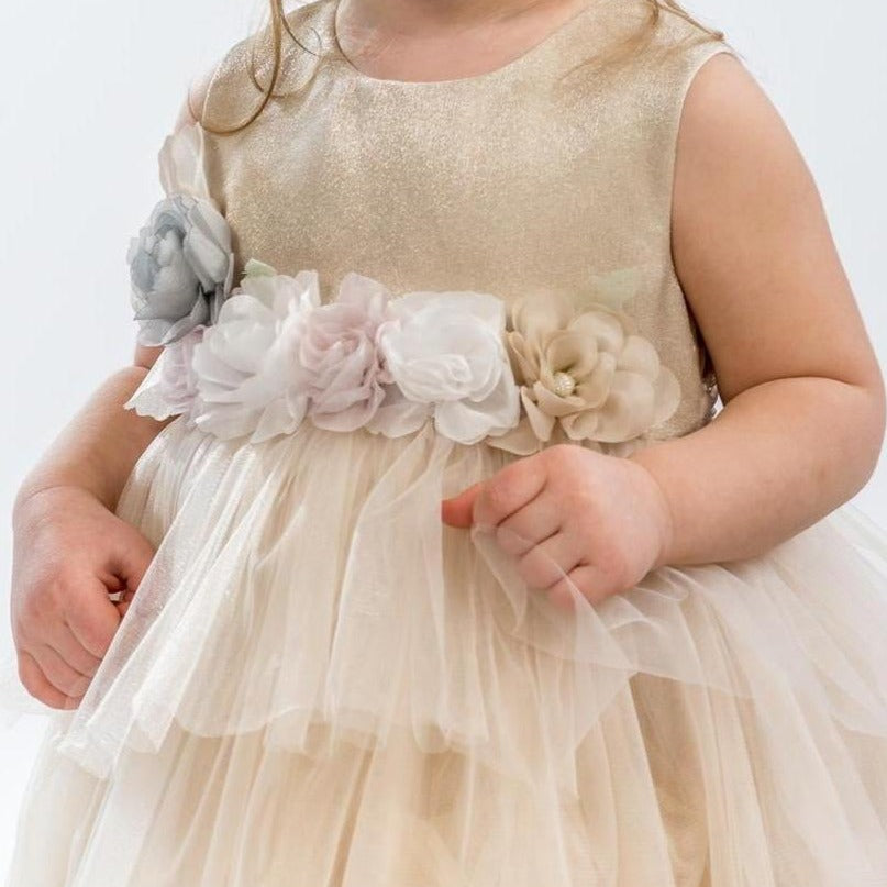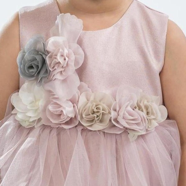L'élégance à son meilleur ! Belle robe brillante avec des fleurs à la taille et un ornement floral amovible sur le haut de l'épaule droite avec un bas en tulle à plusieurs niveaux avec une bordure en dentelle. Une exclusivité JuniorKids