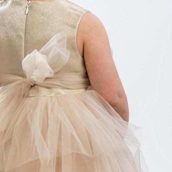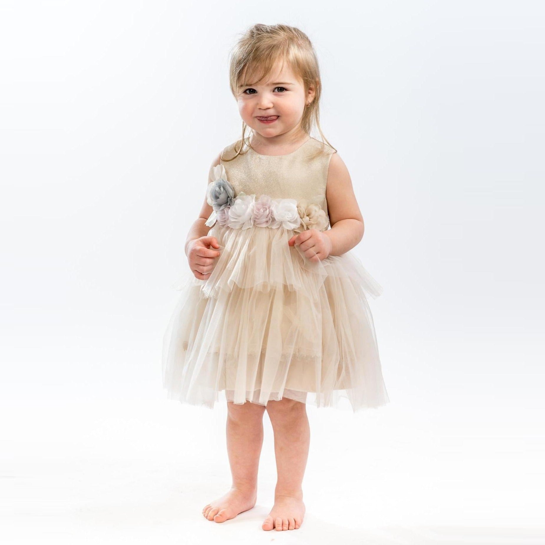 Elegance at its finest! Beautiful shiny soft top dress with flowers on the waistline and a removable flower ornament on the top of the right shoulder with a tiered tulle bottom with lace trim. A JuniorKids Luxury exclusivity!