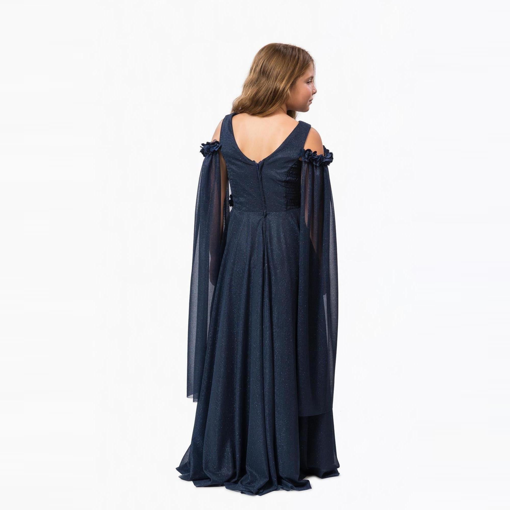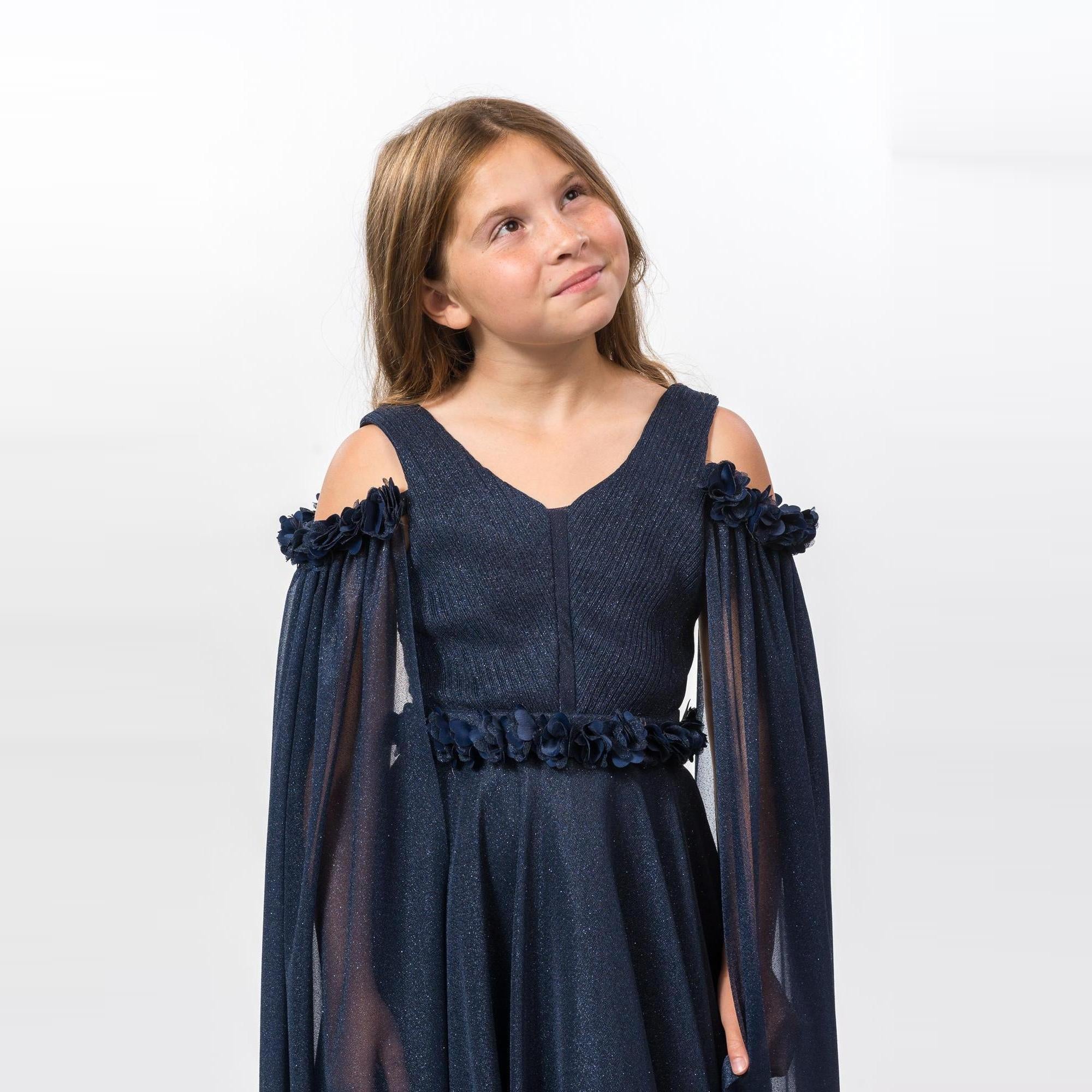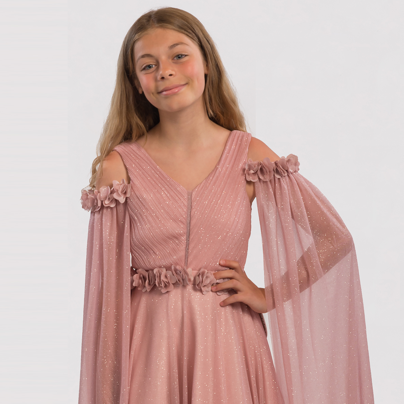 Definitely one of a kind, your tween will look stunning in this gorgeous sparkly tulle mini dress, with the dangling sleeves adorned with flowers. A creation of JuniorKids Luxury!