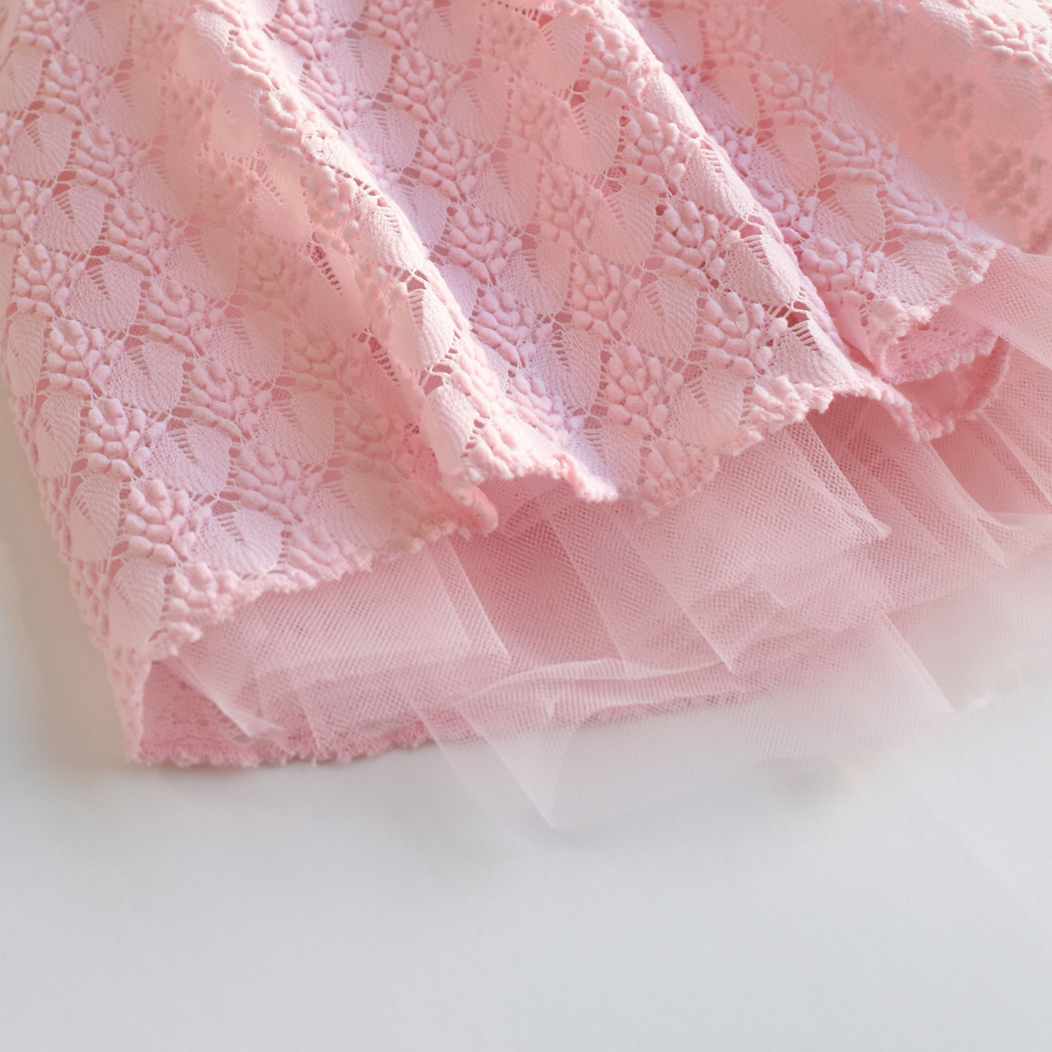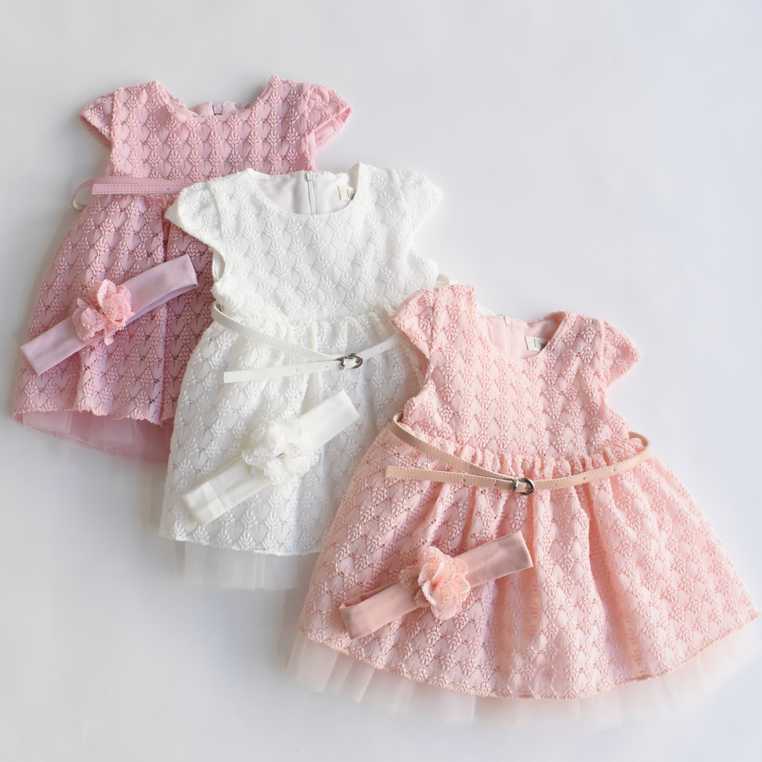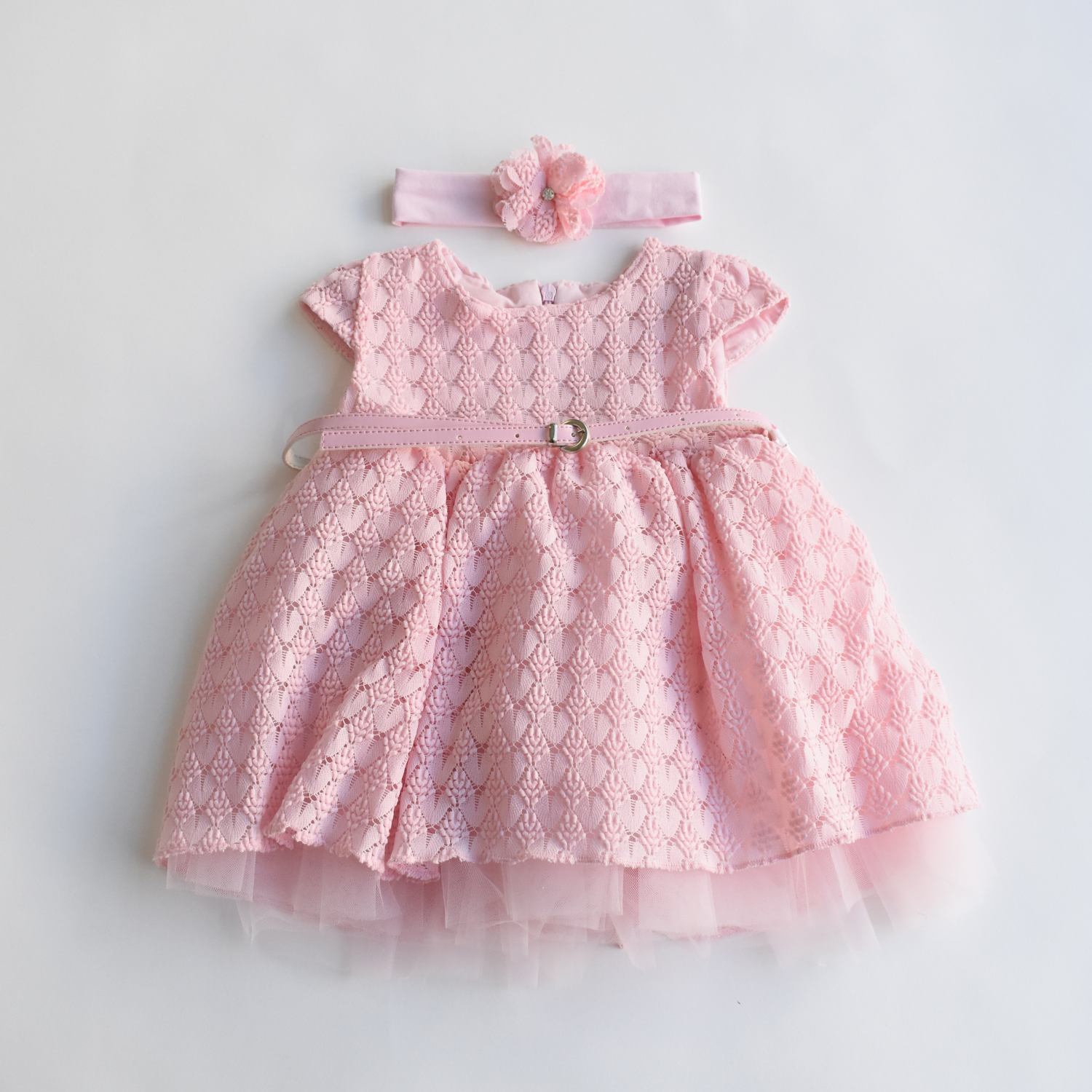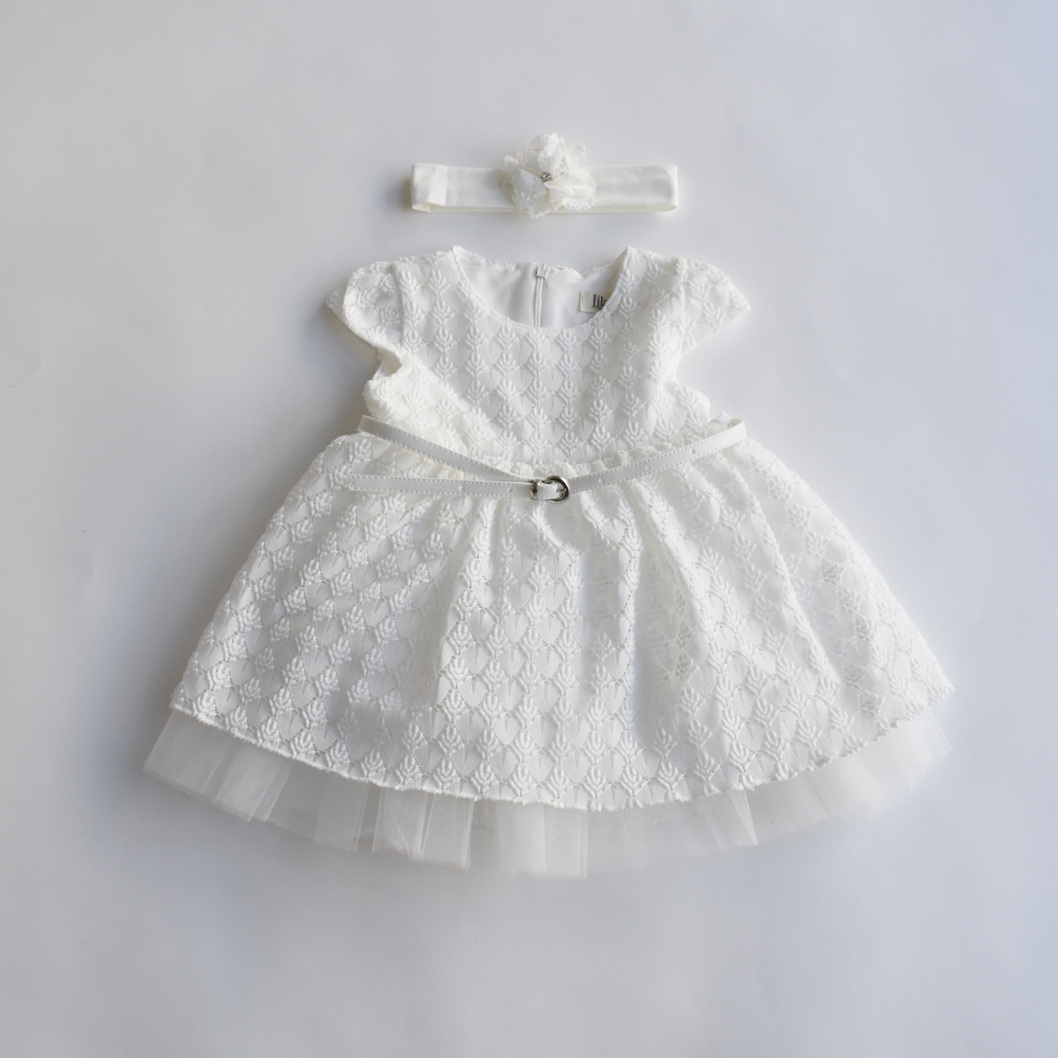 Empower your little girl's charm with our lace dress featuring cap sleeves. This delightful dress has a soft cotton lining, a waist belt, and a matching flower headband, making it the perfect outfit for any special occasion.