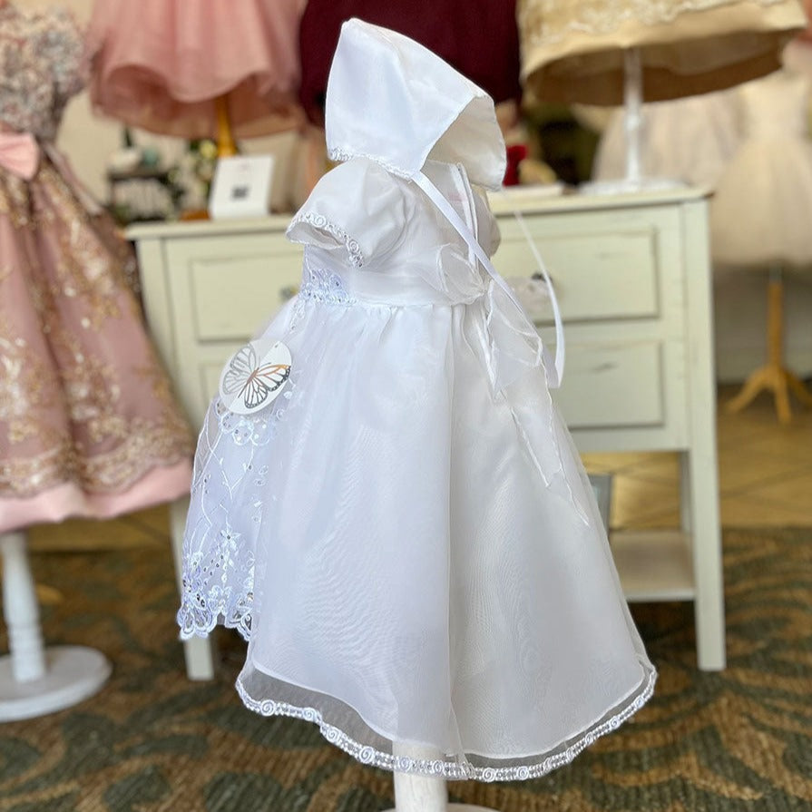 Beautiful baptism dress, organza with lace and matching hat. This baptism dress in white is a flattering style for your sweet girl.