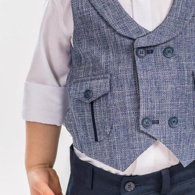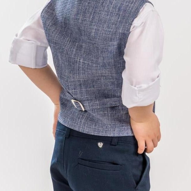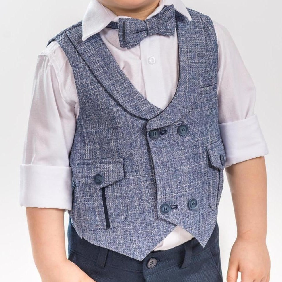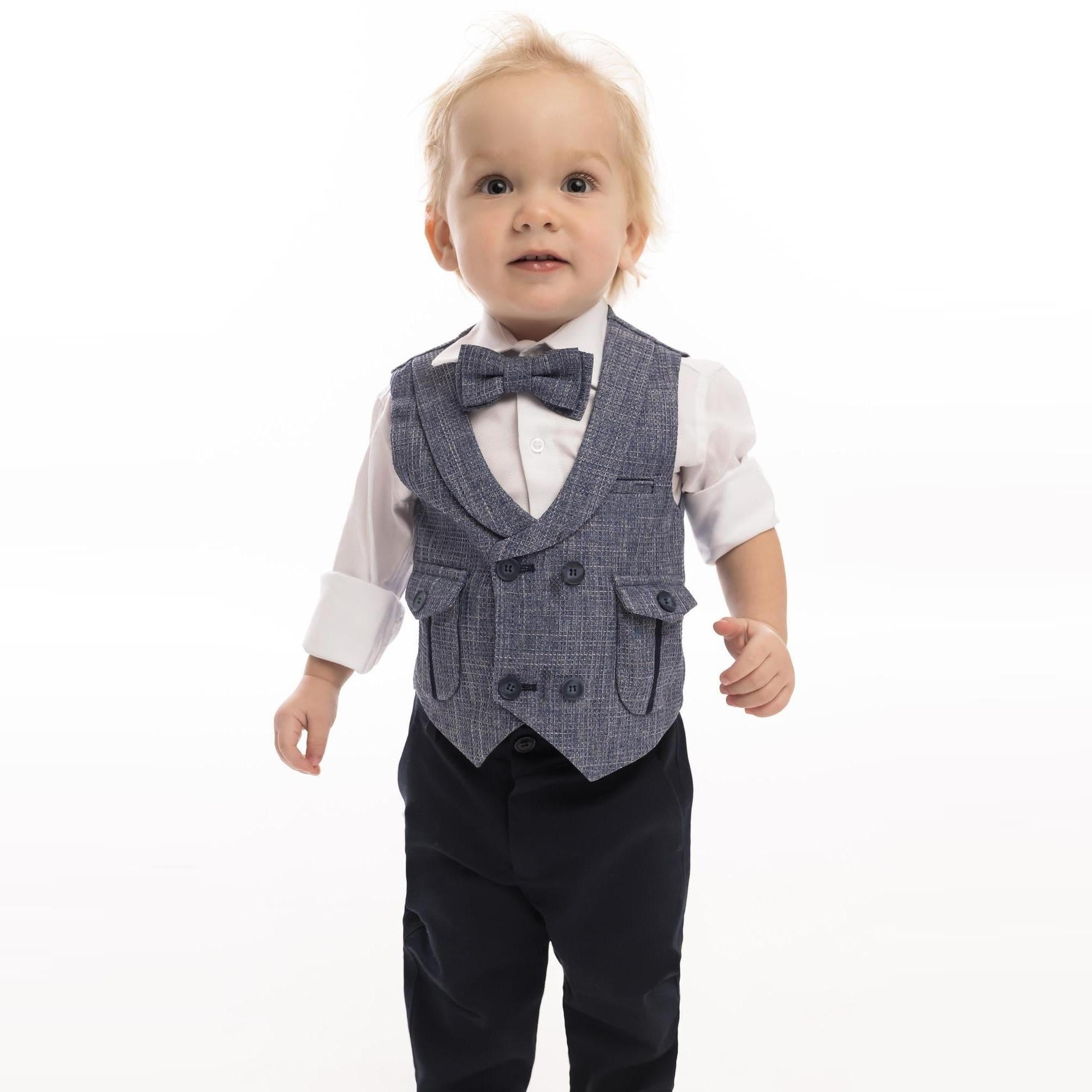 Formal vest set with U-shaped lapel, patterned cotton shirt, matching adjustable skinny navy pants and bowtie. A JuniorKids exclusive creation!