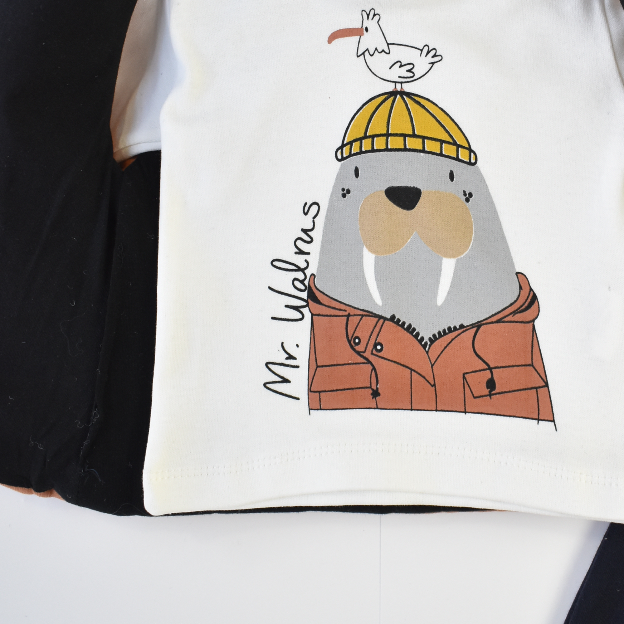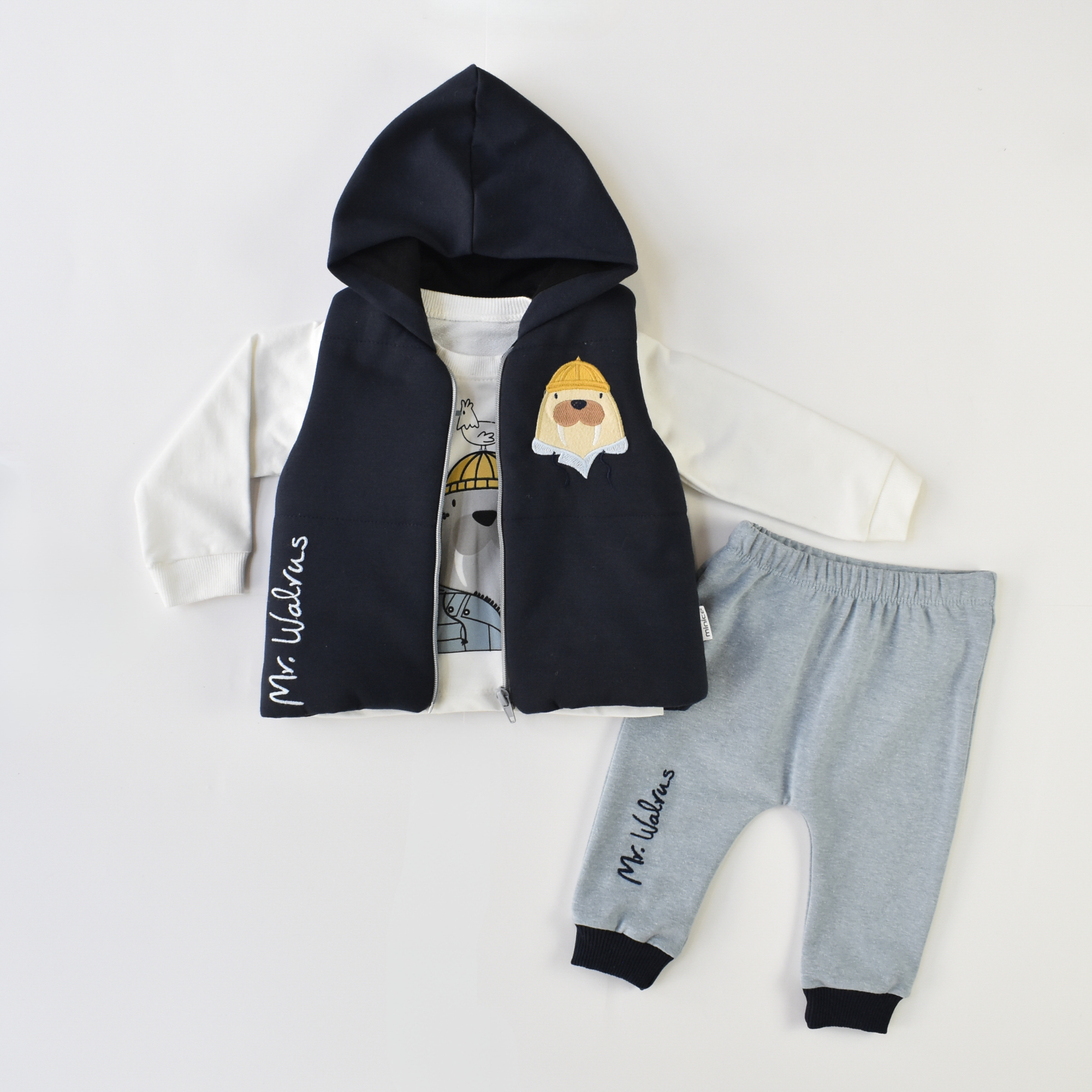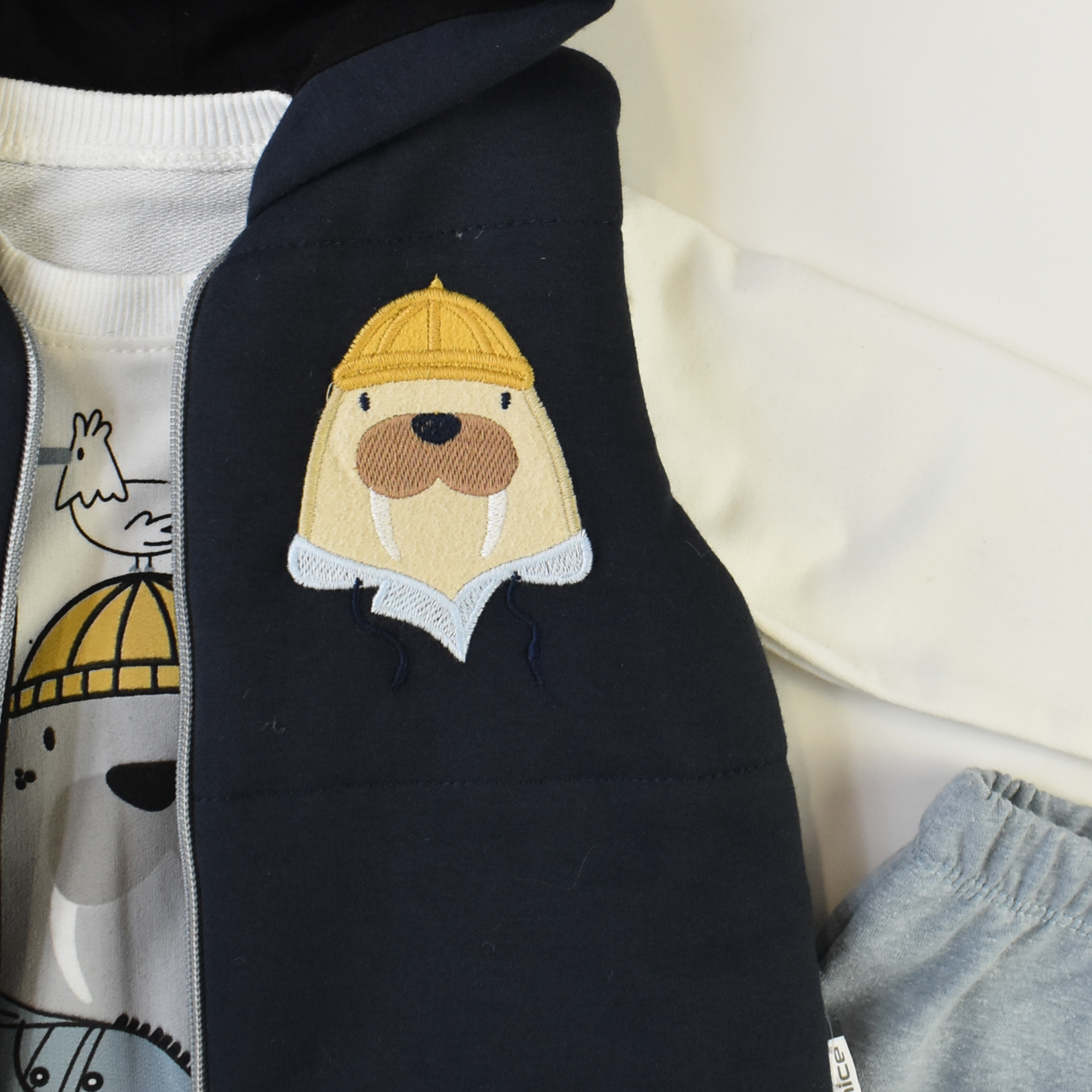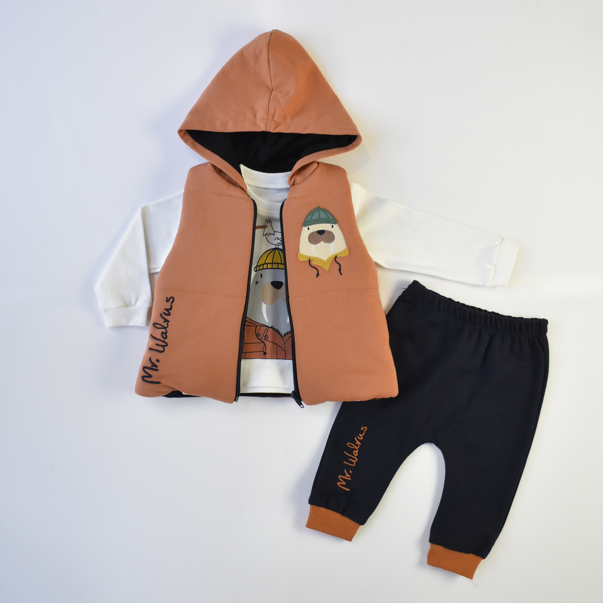 Boost your casual jogger outfit with this chic combination of a sleeveless padded puffer hooded vest, a printed long-sleeve shirt, and matching cozy cotton pants - all made from 100% cotton for your fashionable little one.