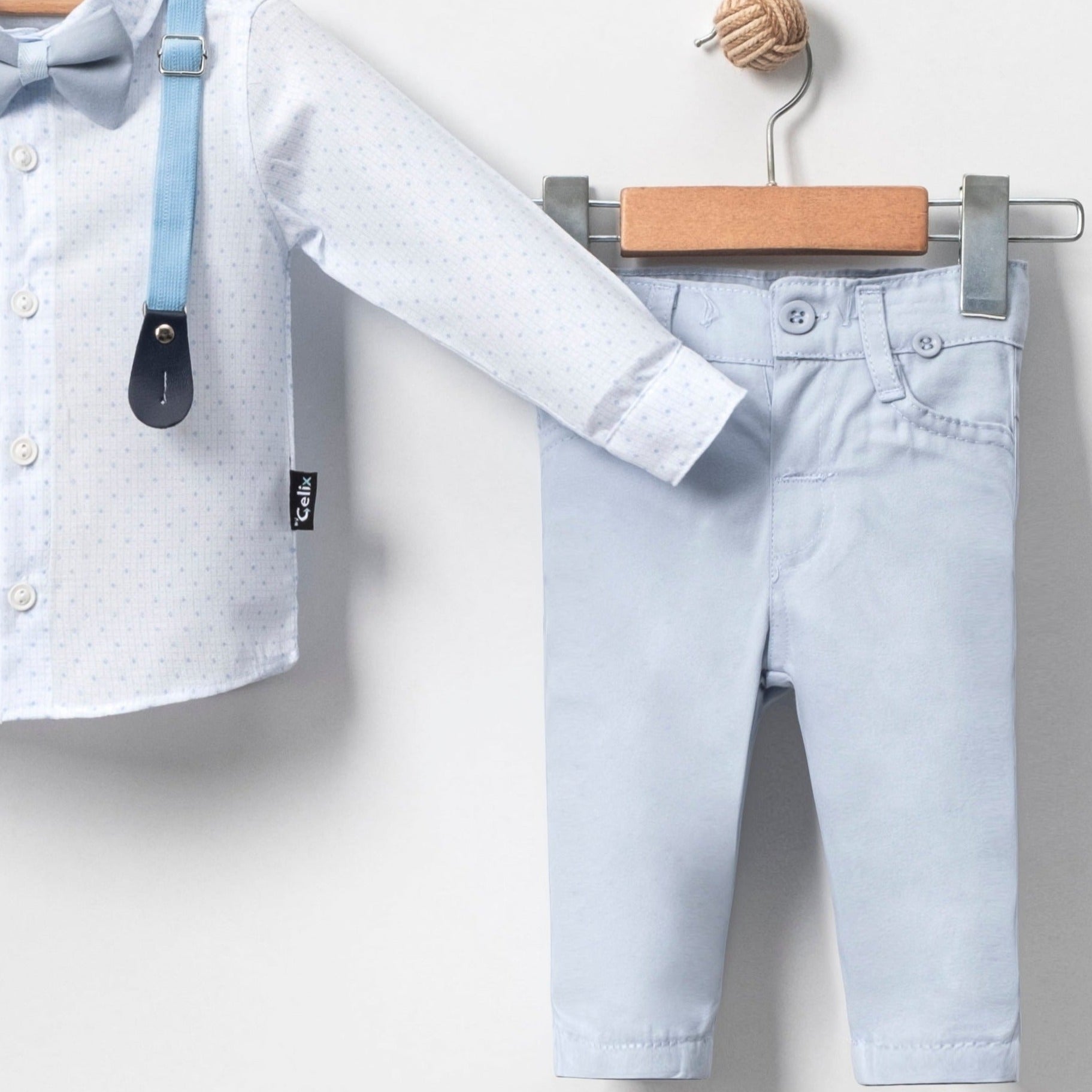 Discover our contemporary style, combining cotton and timeless chic. Our soft, clean cotton shirt highlights the figure. Discreet suspenders add a touch of originality, cotton pants offer optimal comfort and a matching bow tie.