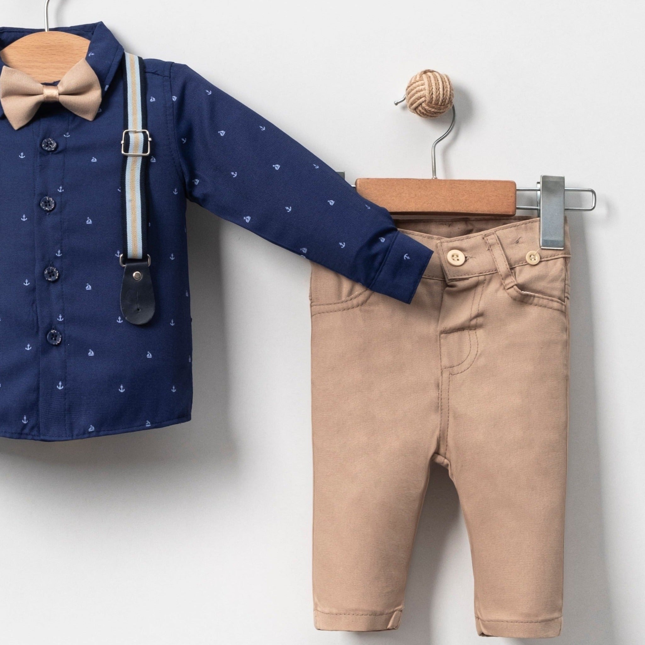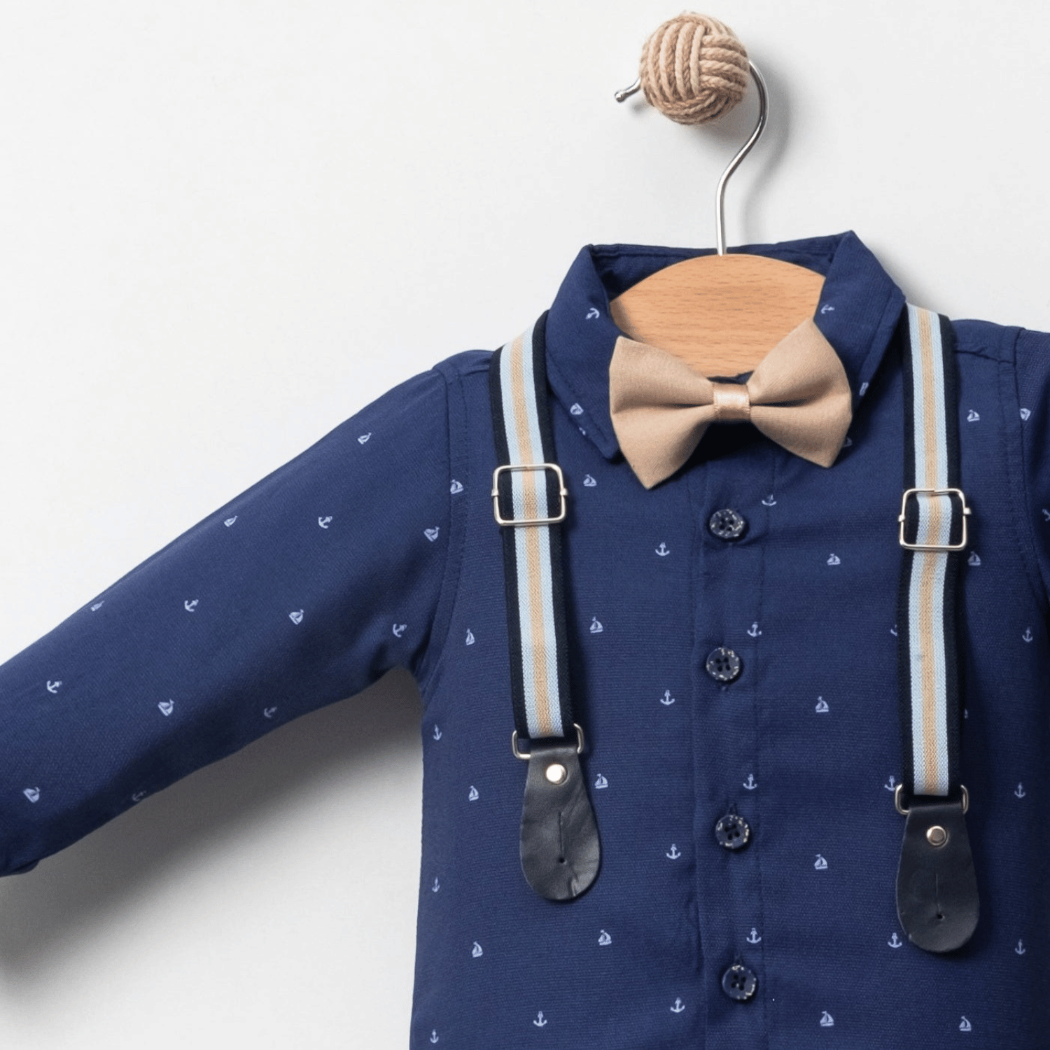Discover our contemporary style, combining cotton and timeless chic. Our soft, clean cotton shirt highlights the figure. Discreet suspenders add a touch of originality, cotton pants offer optimal comfort and a matching bow tie.