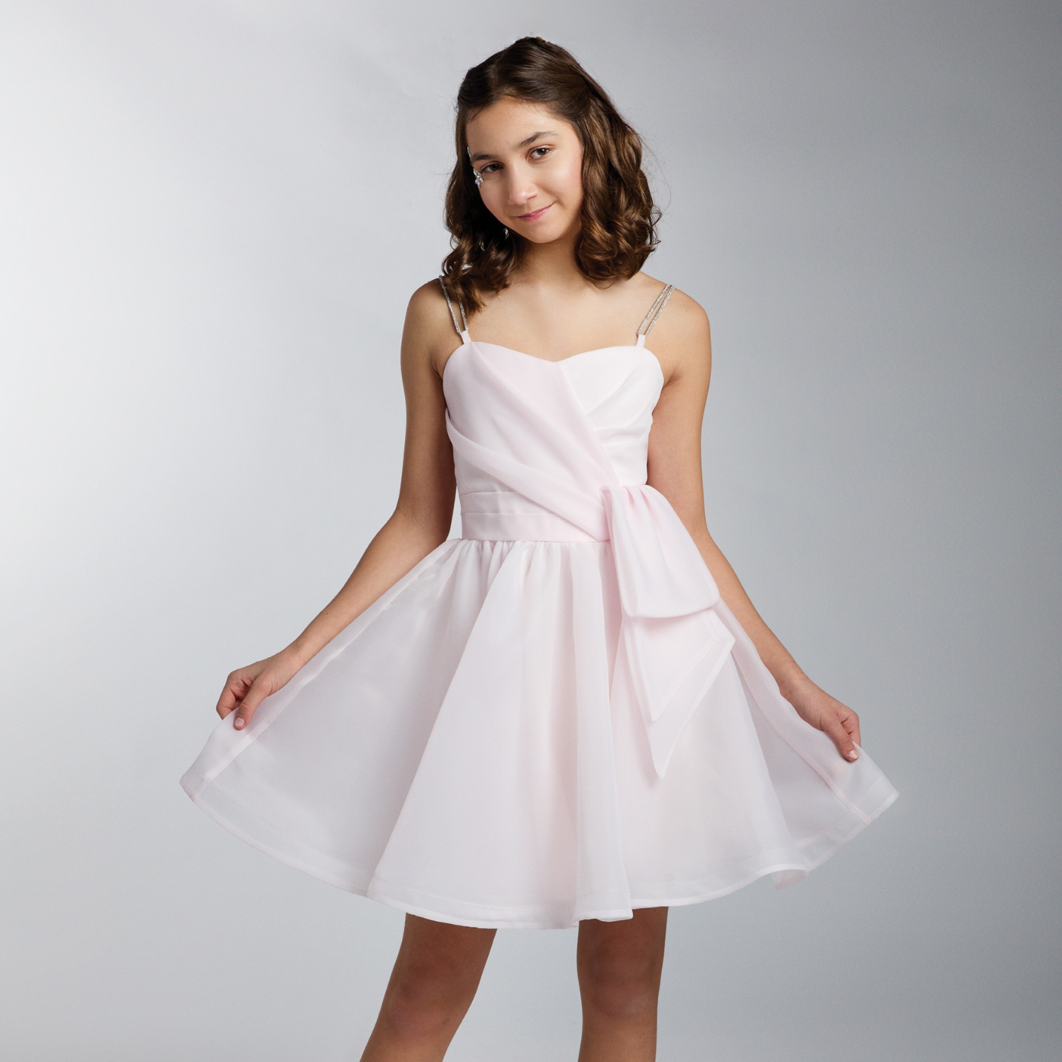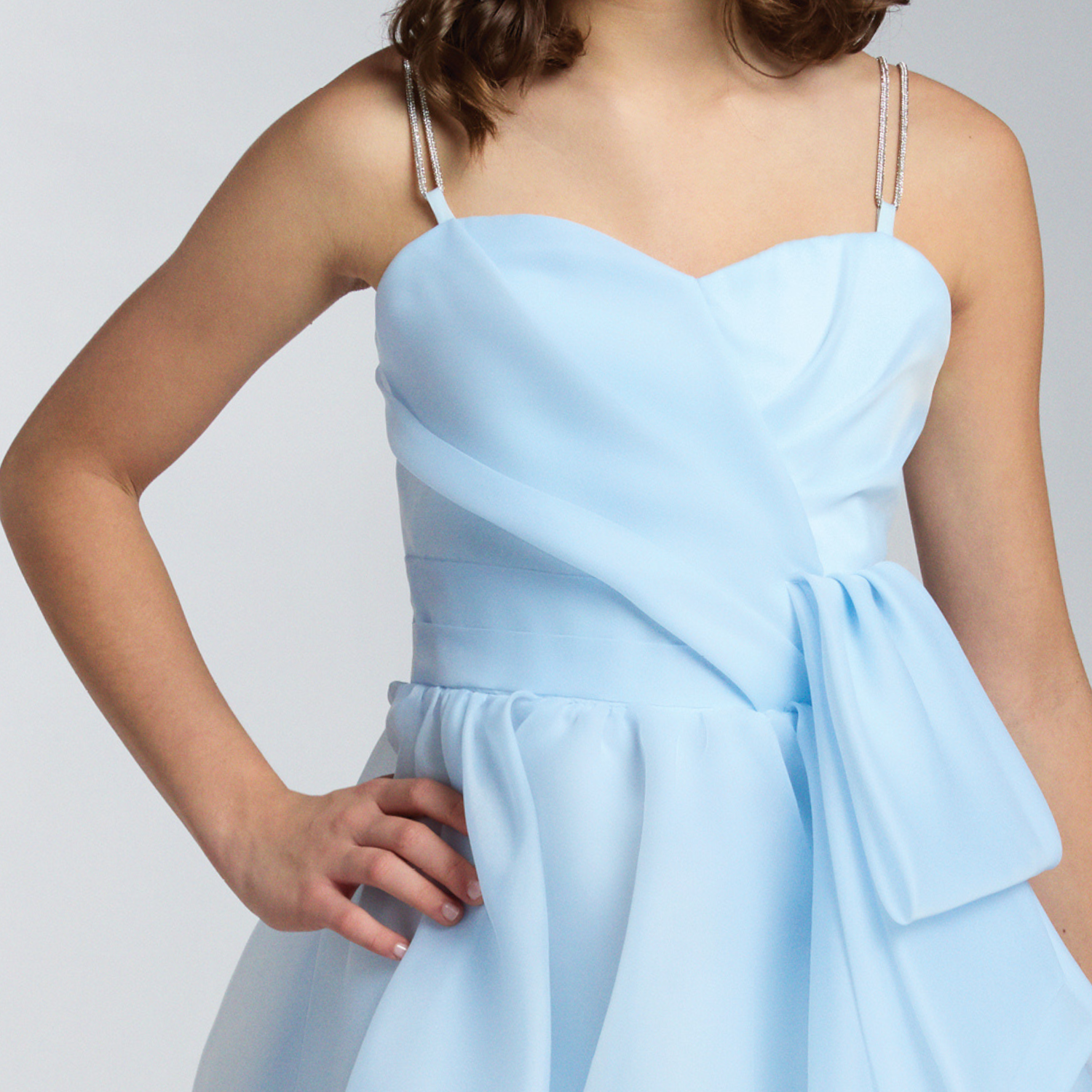 A stunning A-line dress with a knee-length cut, designed to enhance elegance and grace. The bodice features a subtle pleated detail that forms a chic knot, adding a sophisticated touch. Delicate straps adorned with shimmering embellishments provide a hint of sparkle, while the airy, flowing fabric ensures comfort and movement. Perfect for graduations and special occasions.