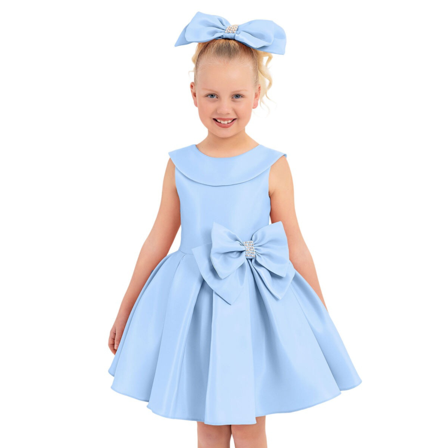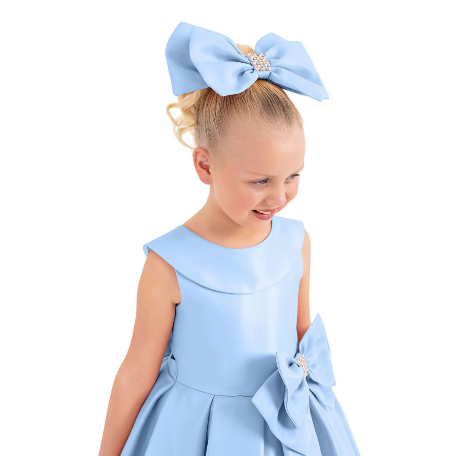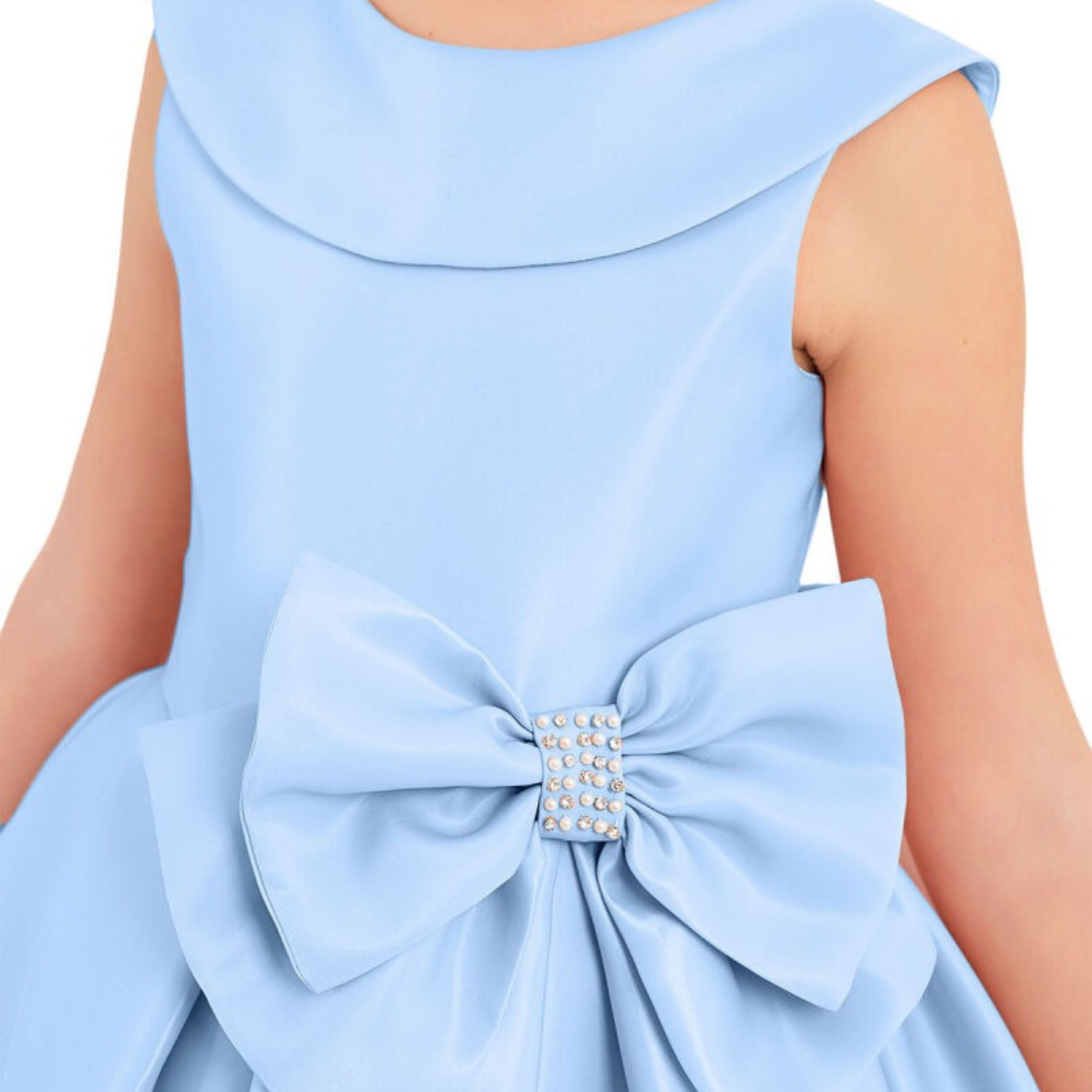 Let your little one shine in this stunning sleeveless dress! Designed with a sophisticated collar and fitted bodice, this dress enhances elegance with a double bow at the waist, beautifully embroidered with pearls and stones.