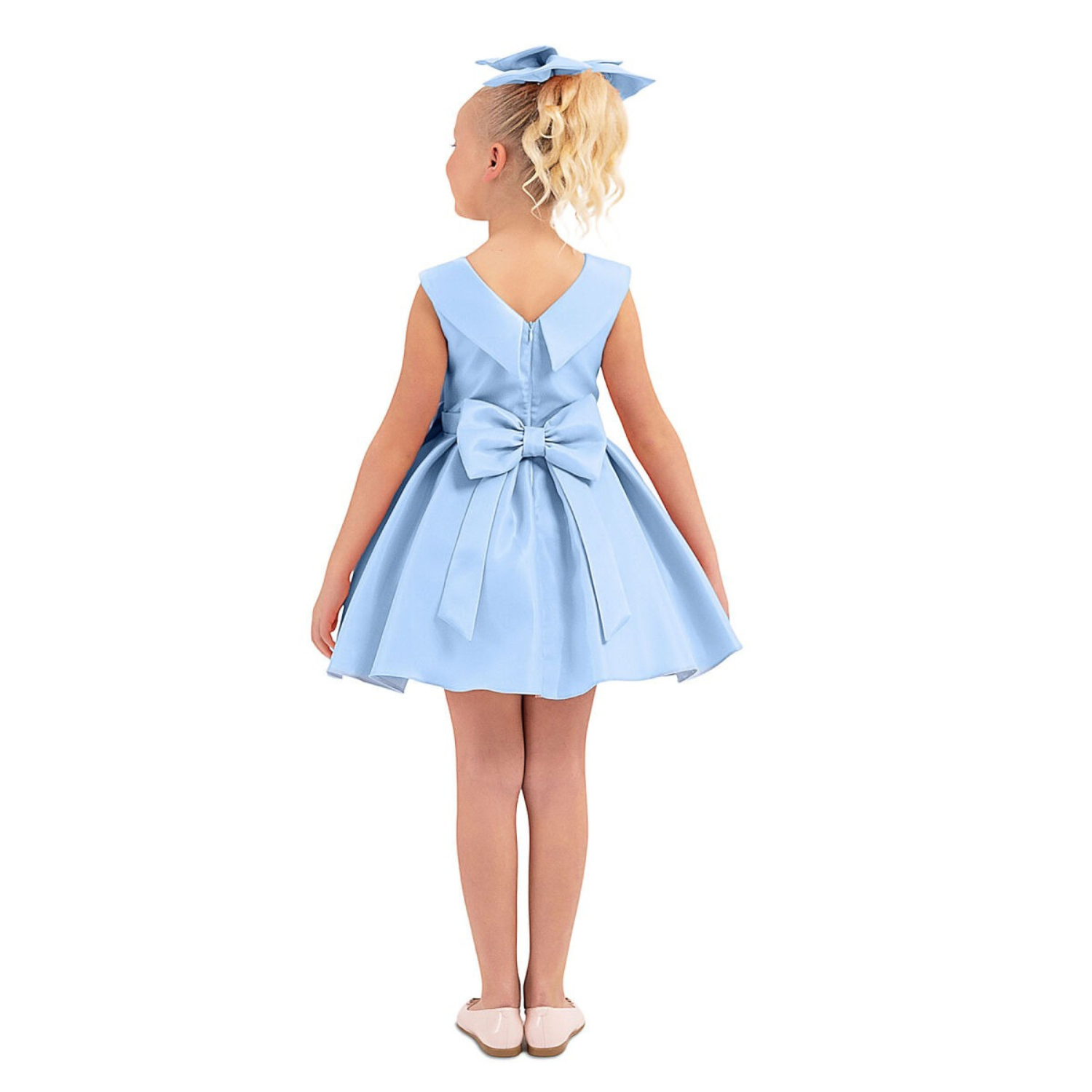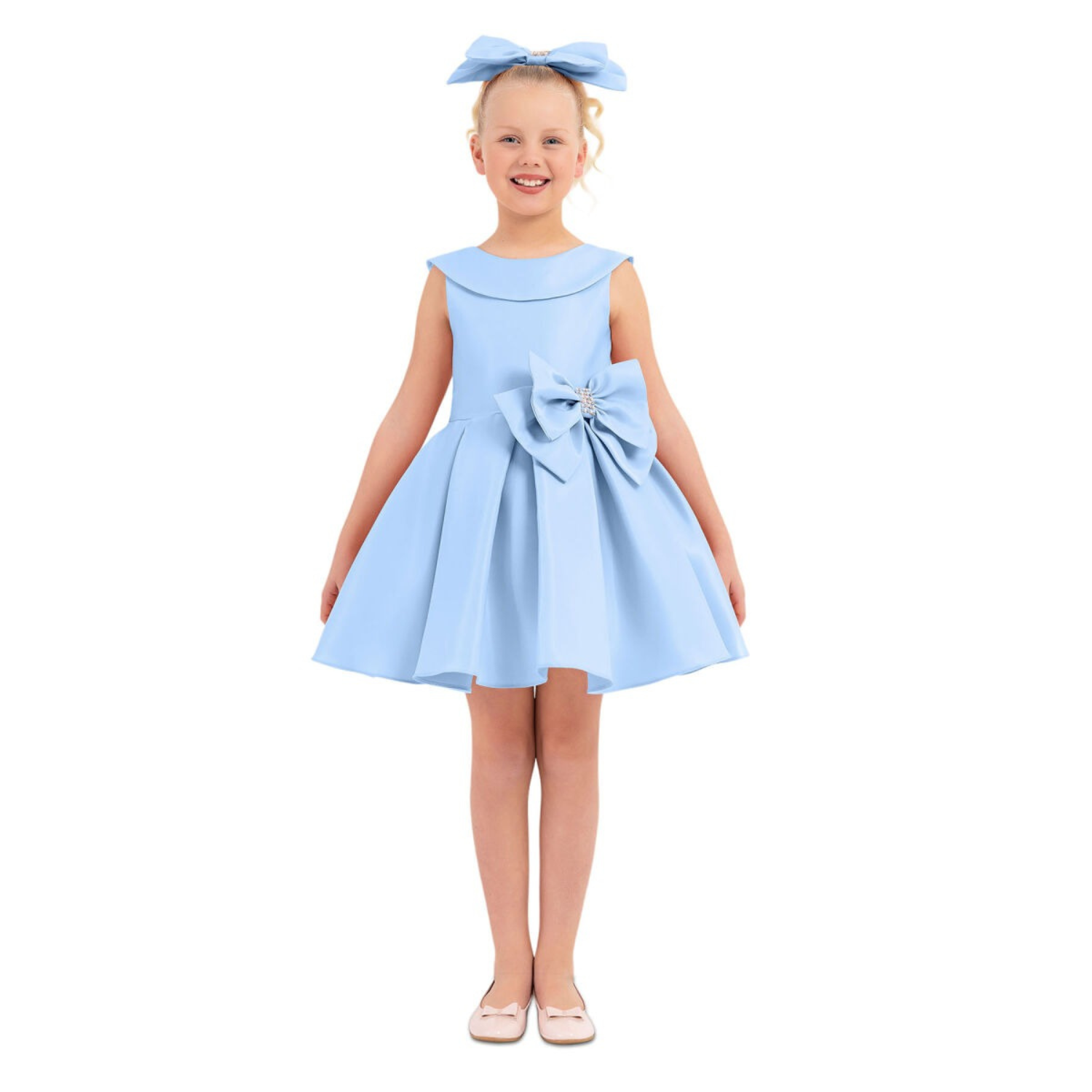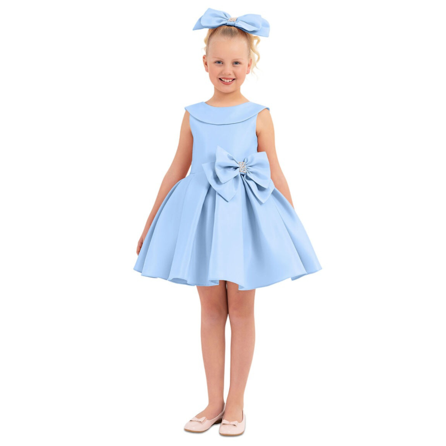 Let your little one shine in this stunning sleeveless dress! Designed with a sophisticated collar and fitted bodice, this dress enhances elegance with a double bow at the waist, beautifully embroidered with pearls and stones.