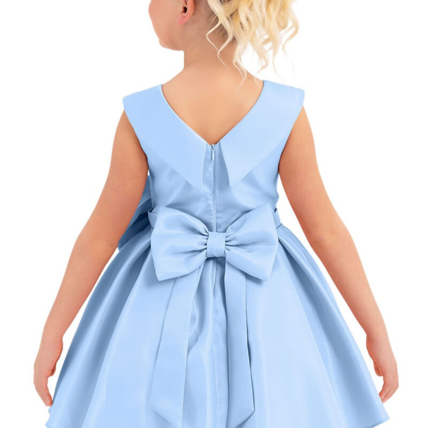 The voluminous inverted pleated skirt, made from shimmering satin-organza fabric, creates a graceful and luxurious silhouette. The V-shaped back neckline and large bow detail add an extra touch of charm.
