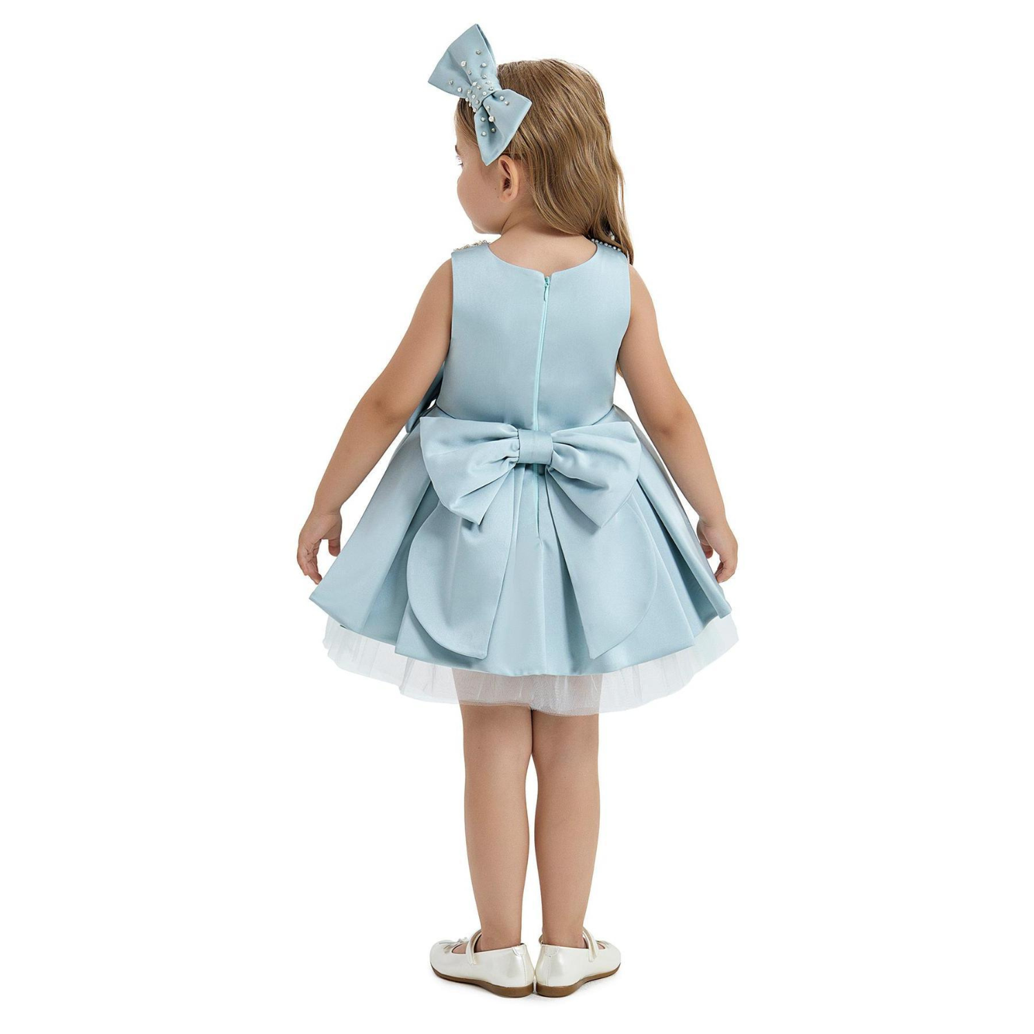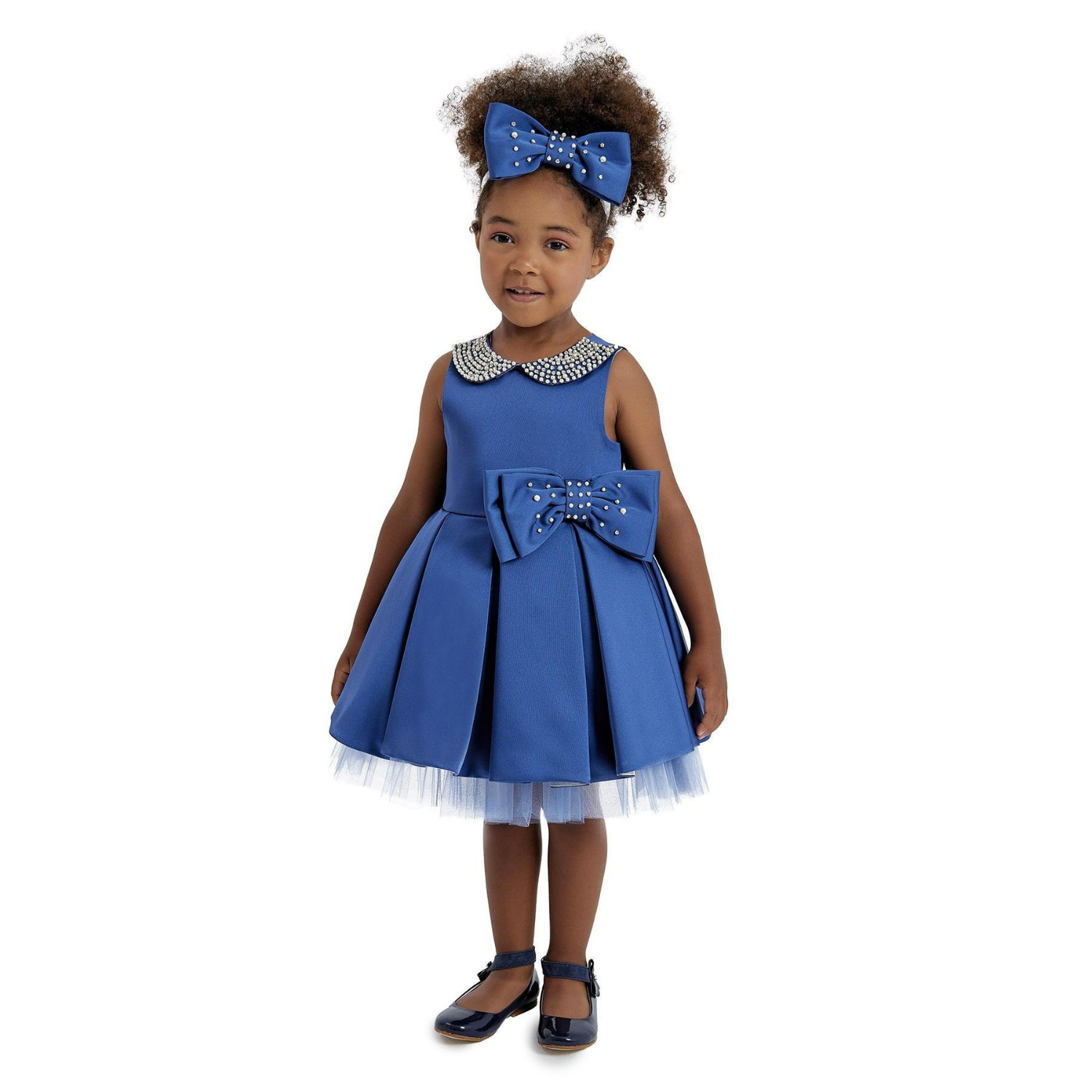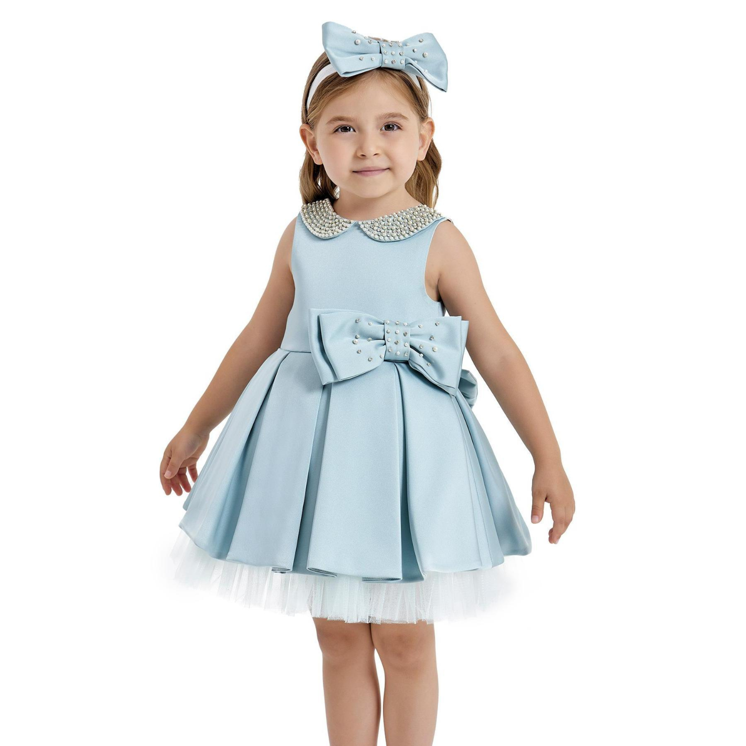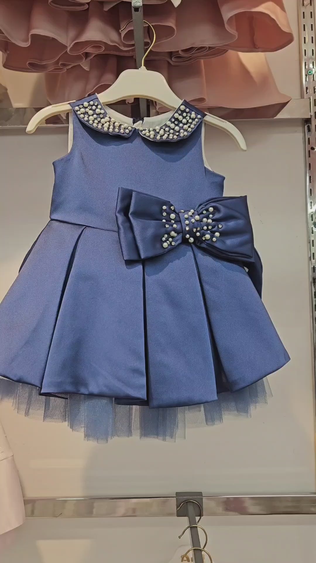 Truly original and stunning soft satin, sleeveless pleated dress full of pearls and rhinestones on its handmade noble english collar. The dress has two cute bows on the front and removable one in the back and is lined with soft cotton for a comfortable fit. Another exclusive creation by JuniorKids Luxury!