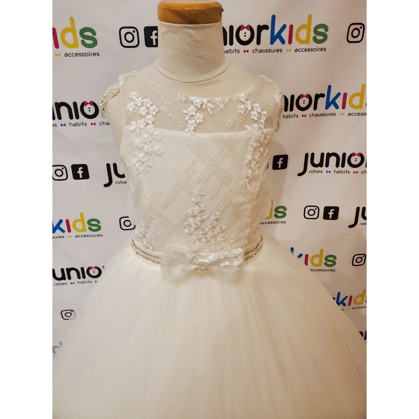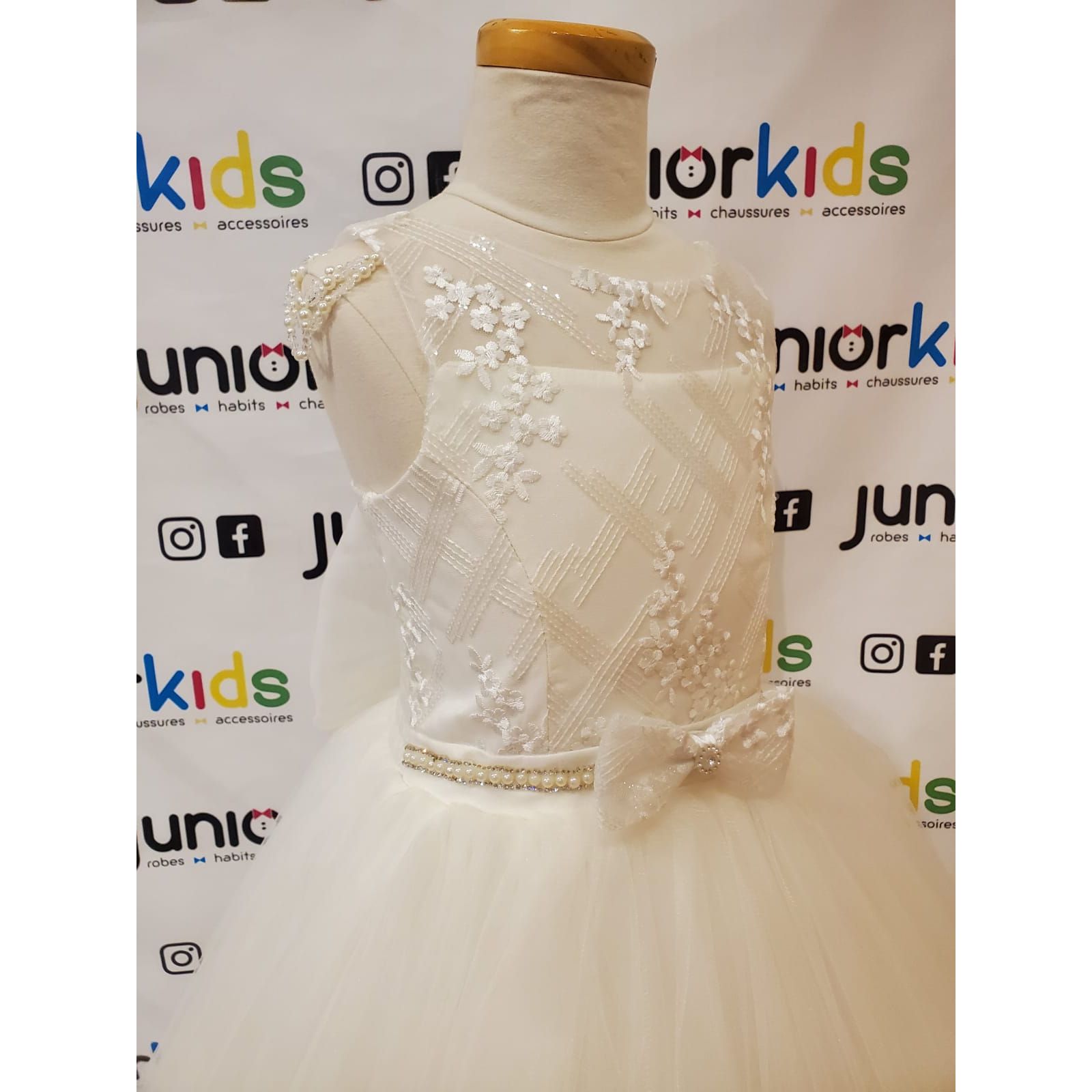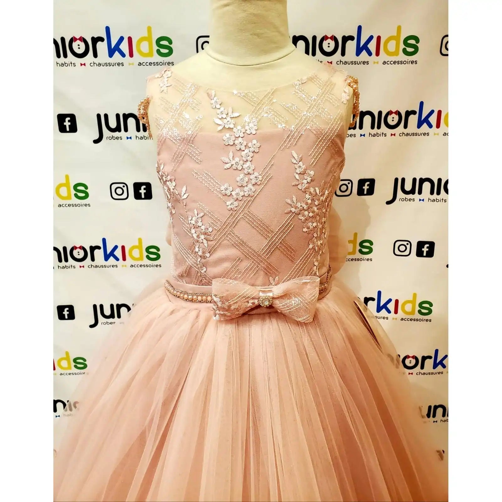 Une vraie robe de princesse à broder avec des perles sur les épaules, un fond en tulle et un gros arc assorti. Un modèle juniorkids exclusif!
