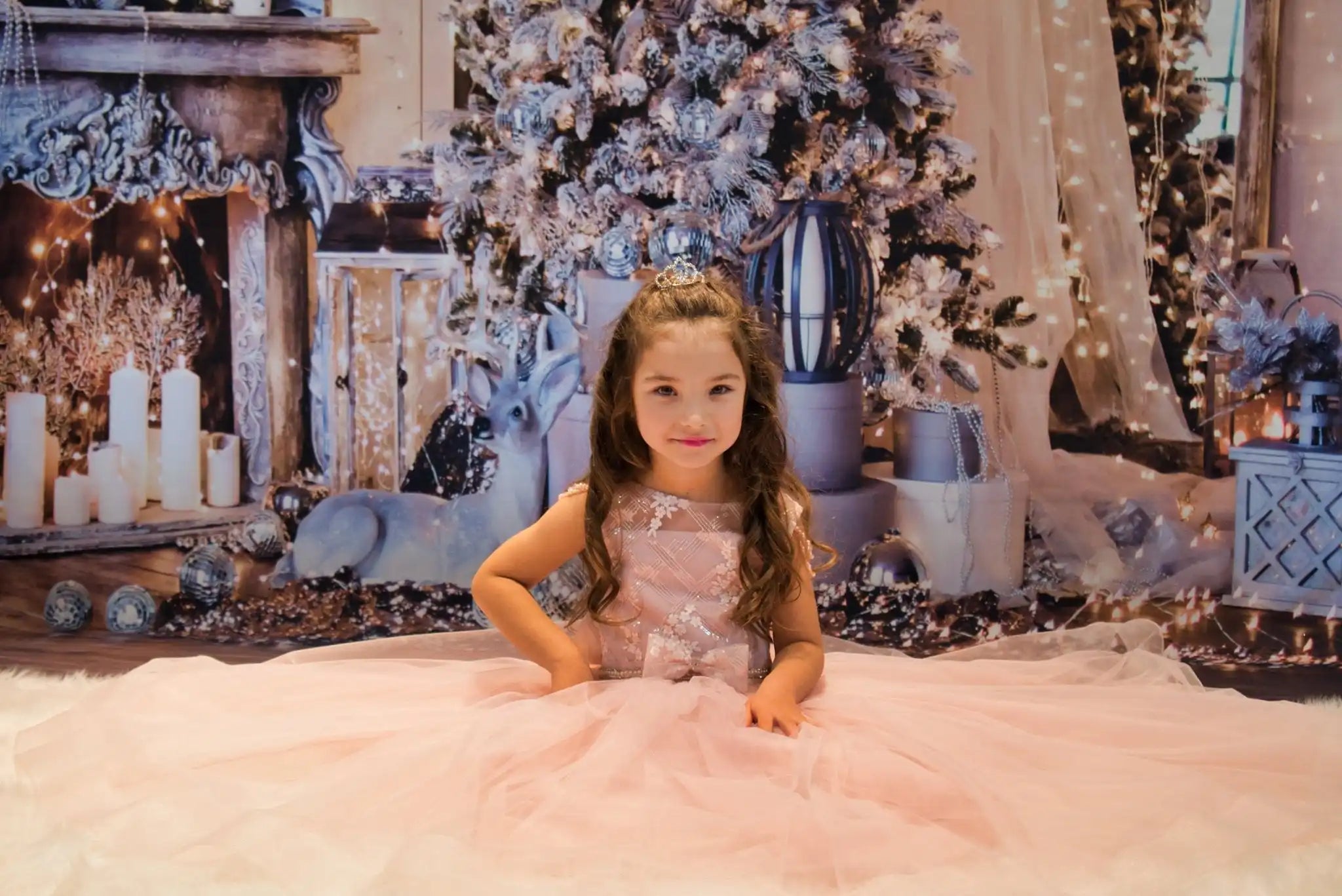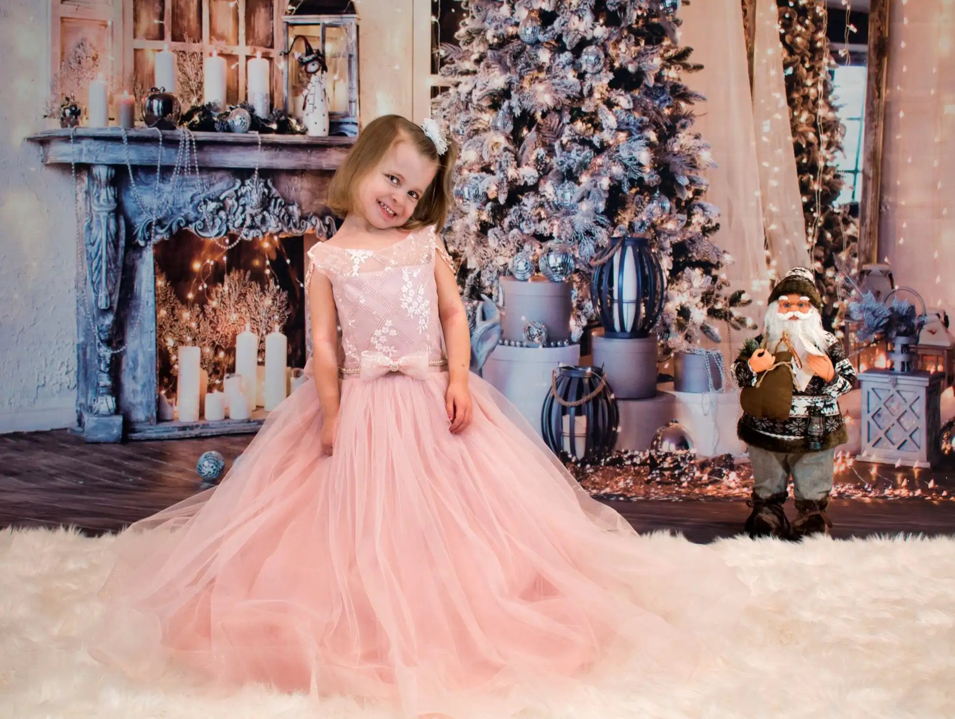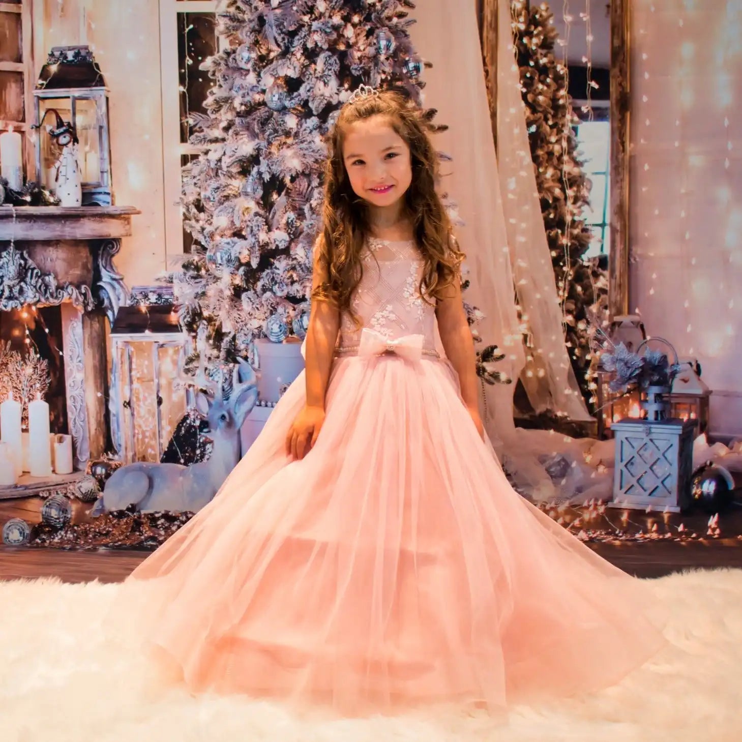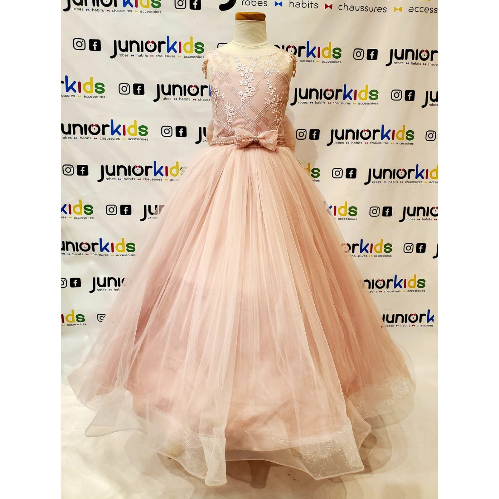 Une vraie robe de princesse à broder avec des perles sur les épaules, un fond en tulle et un gros arc assorti. Un modèle juniorkids exclusif!