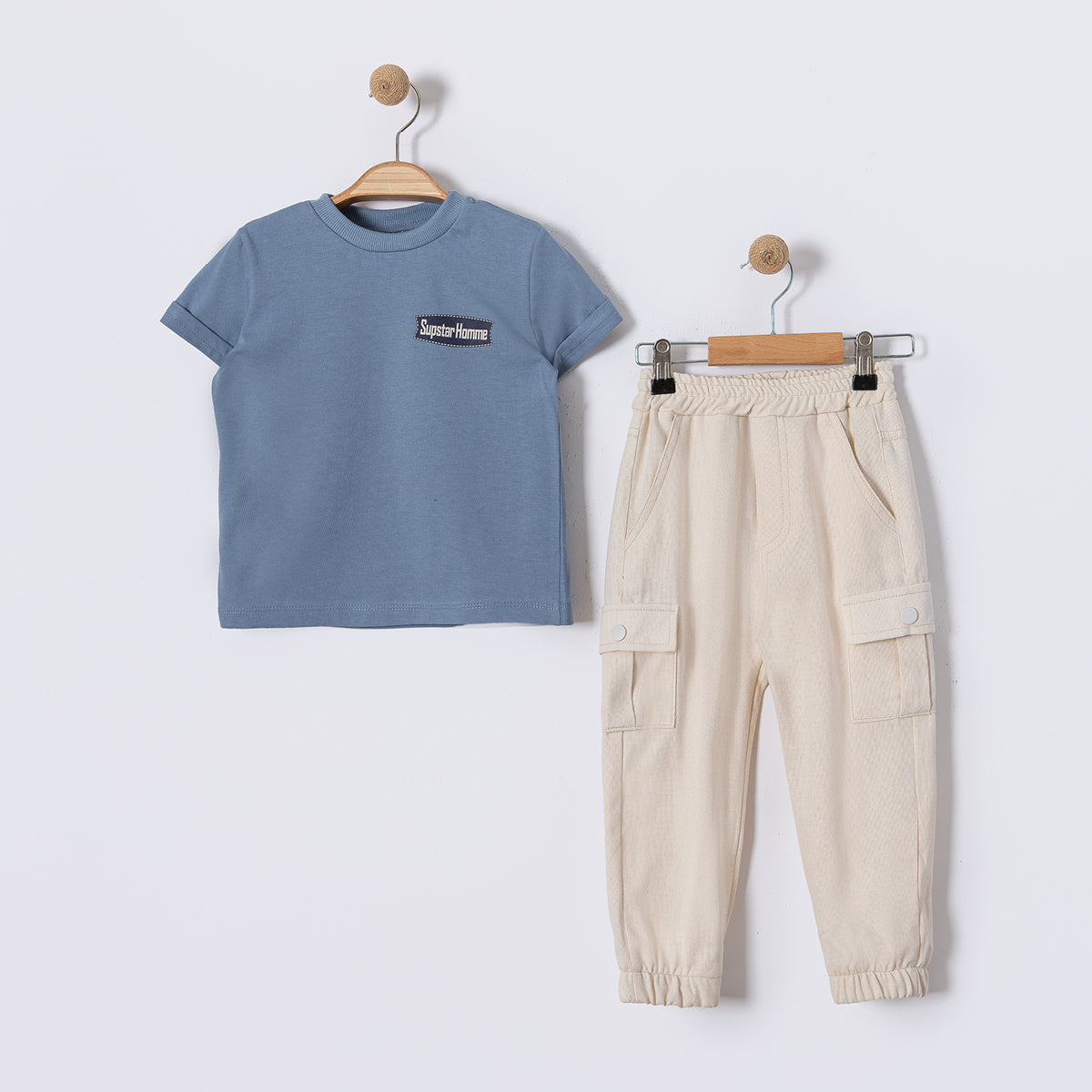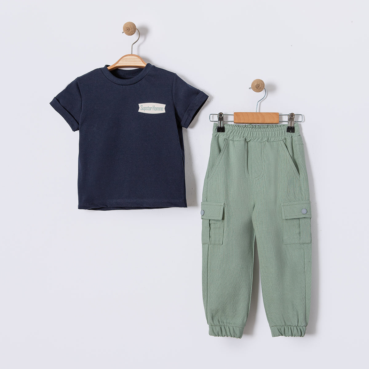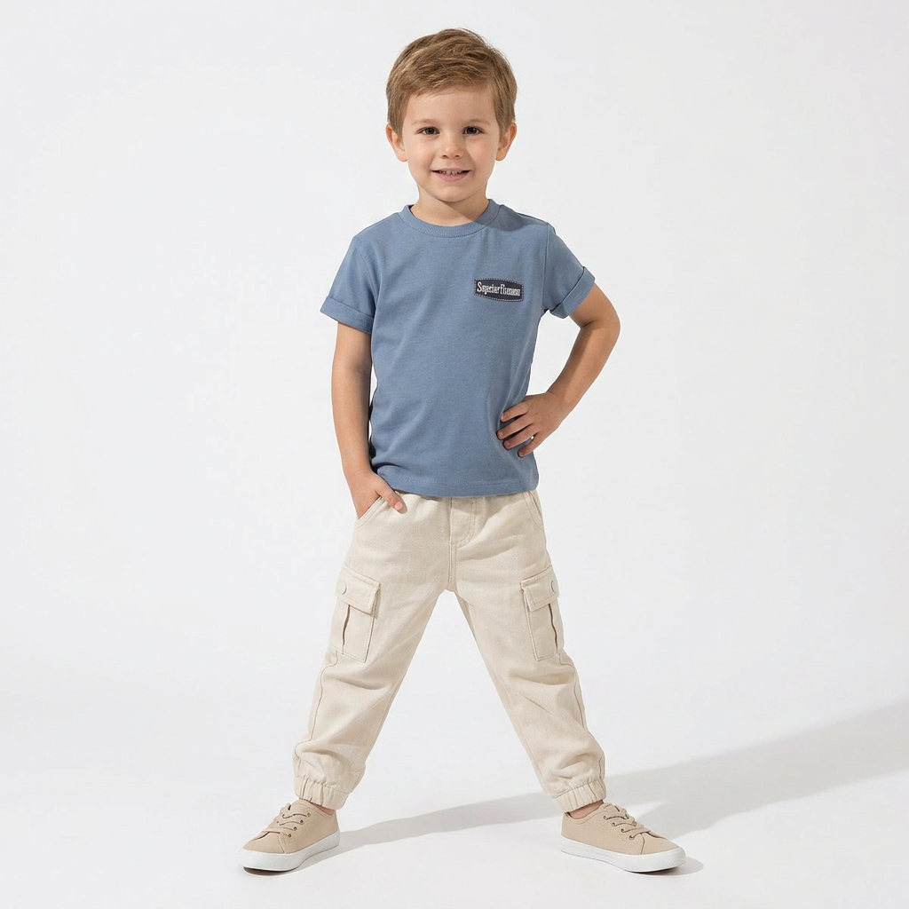 Adventure awaits in this versatile t-shirt and cargo pant set! The classic tee features a fun graphic detail, while the cargo pants offer functional pockets and an elastic waistband with adjustable drawstring for all-day comfort. Tapered ankles with elastic cuffs keep him ready for action. Perfect for playground adventures, family outings, or everyday wear.