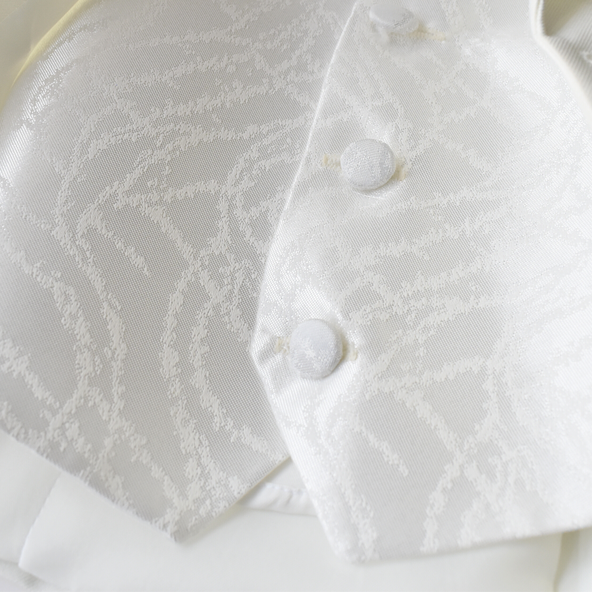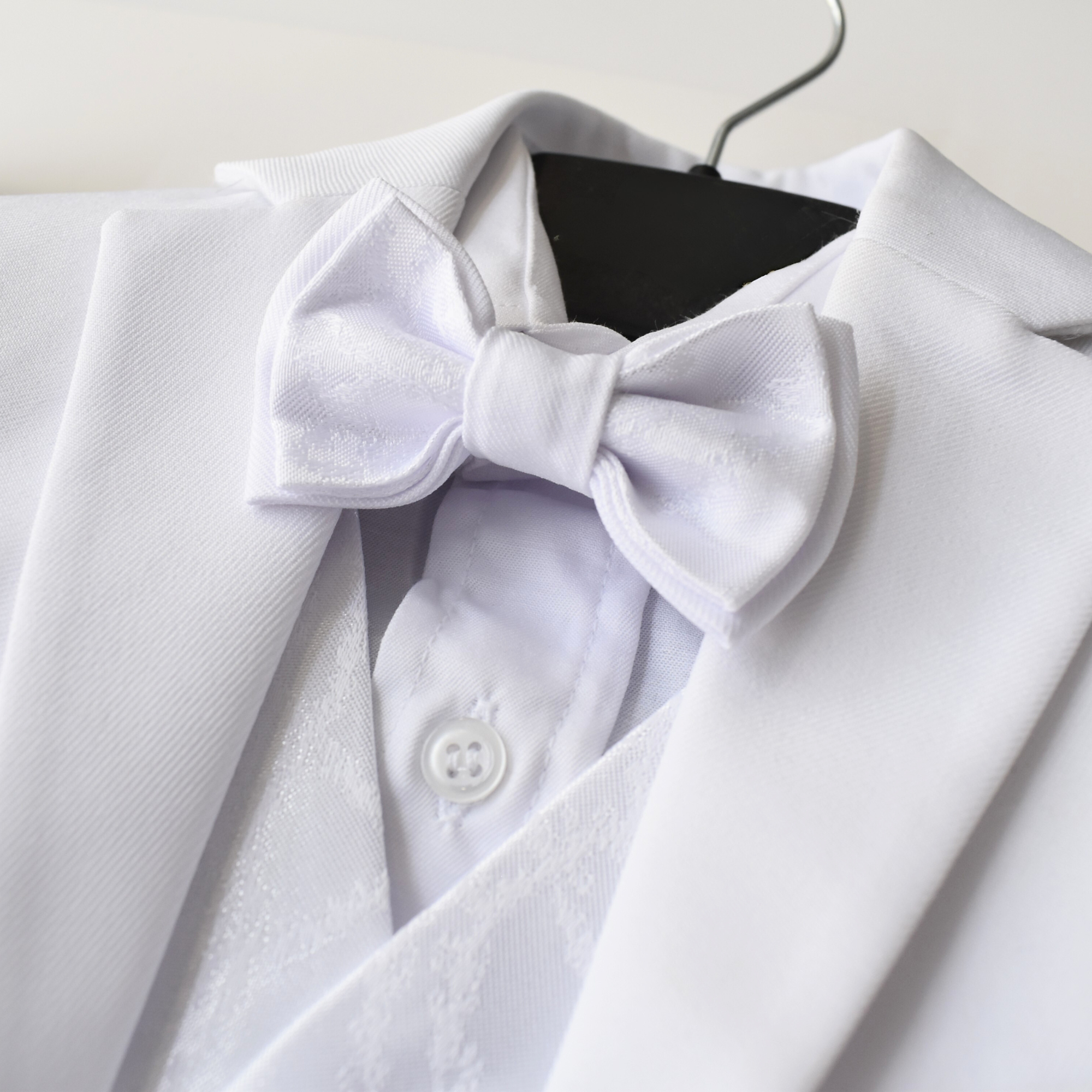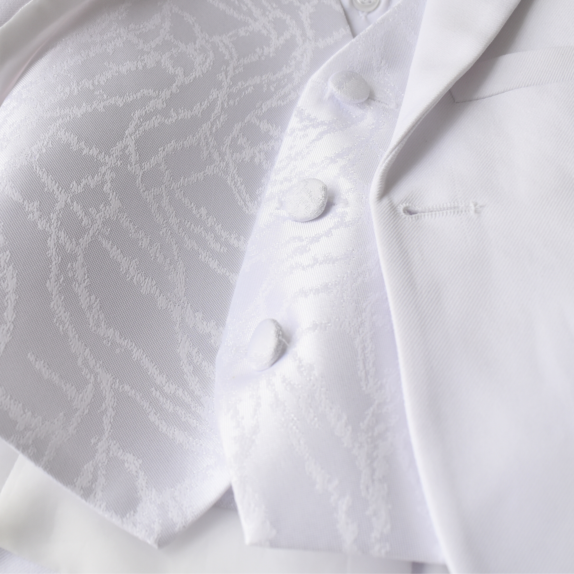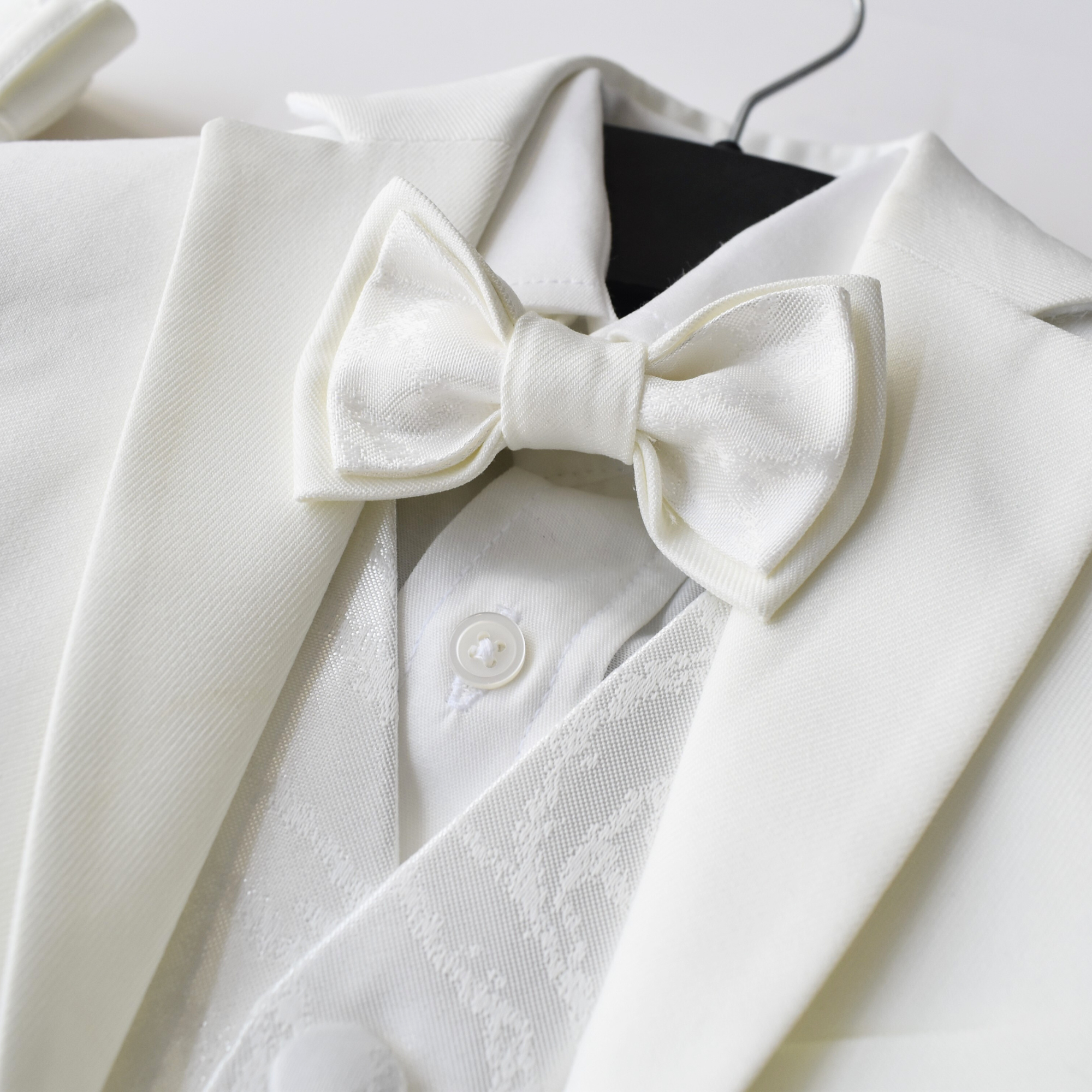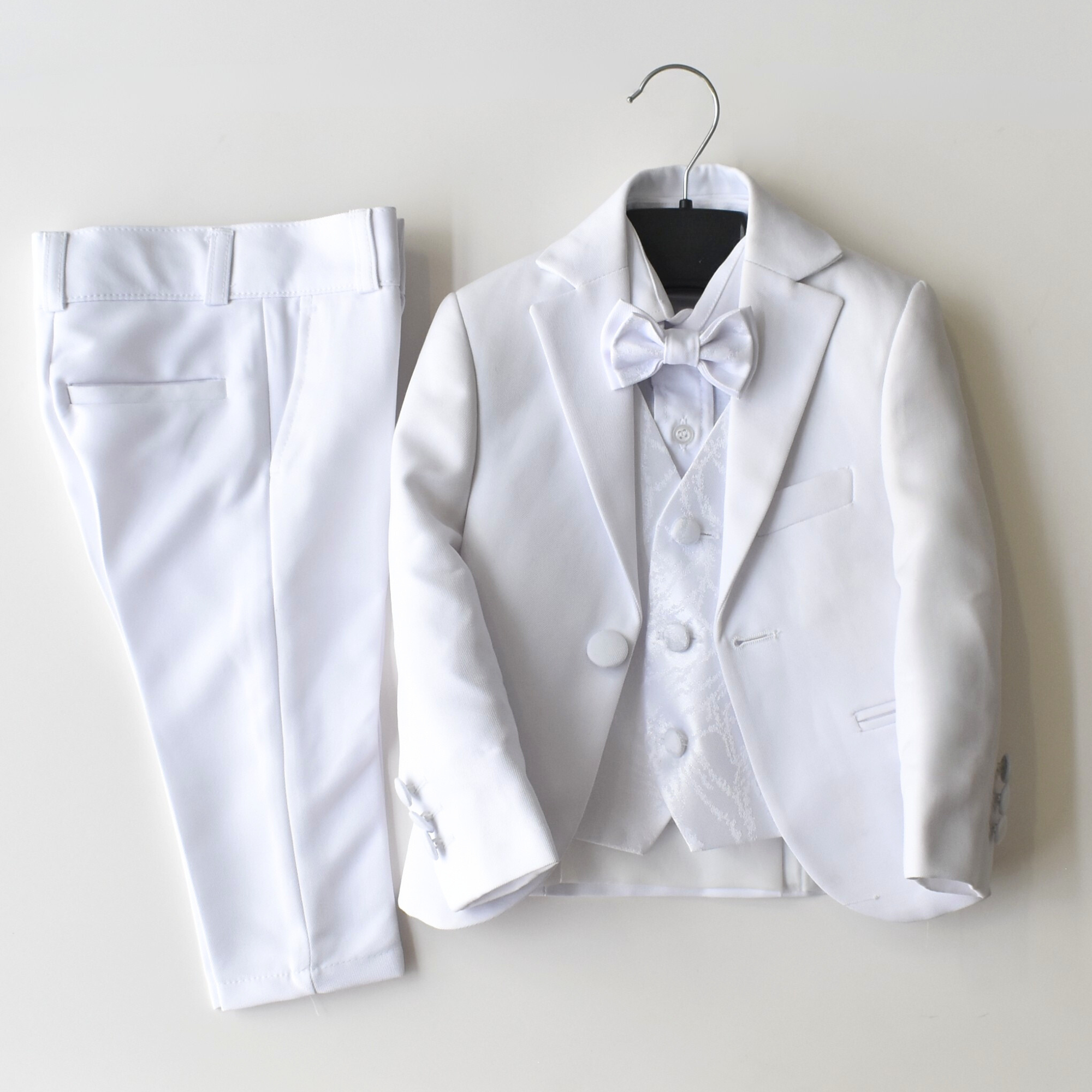 The white suit is carefully crafted to offer a modern, polished appearance with a tailored fit that will make your child stand out. The entire ensemble comes together seamlessly, providing everything your little one needs for a sharp and stylish look.