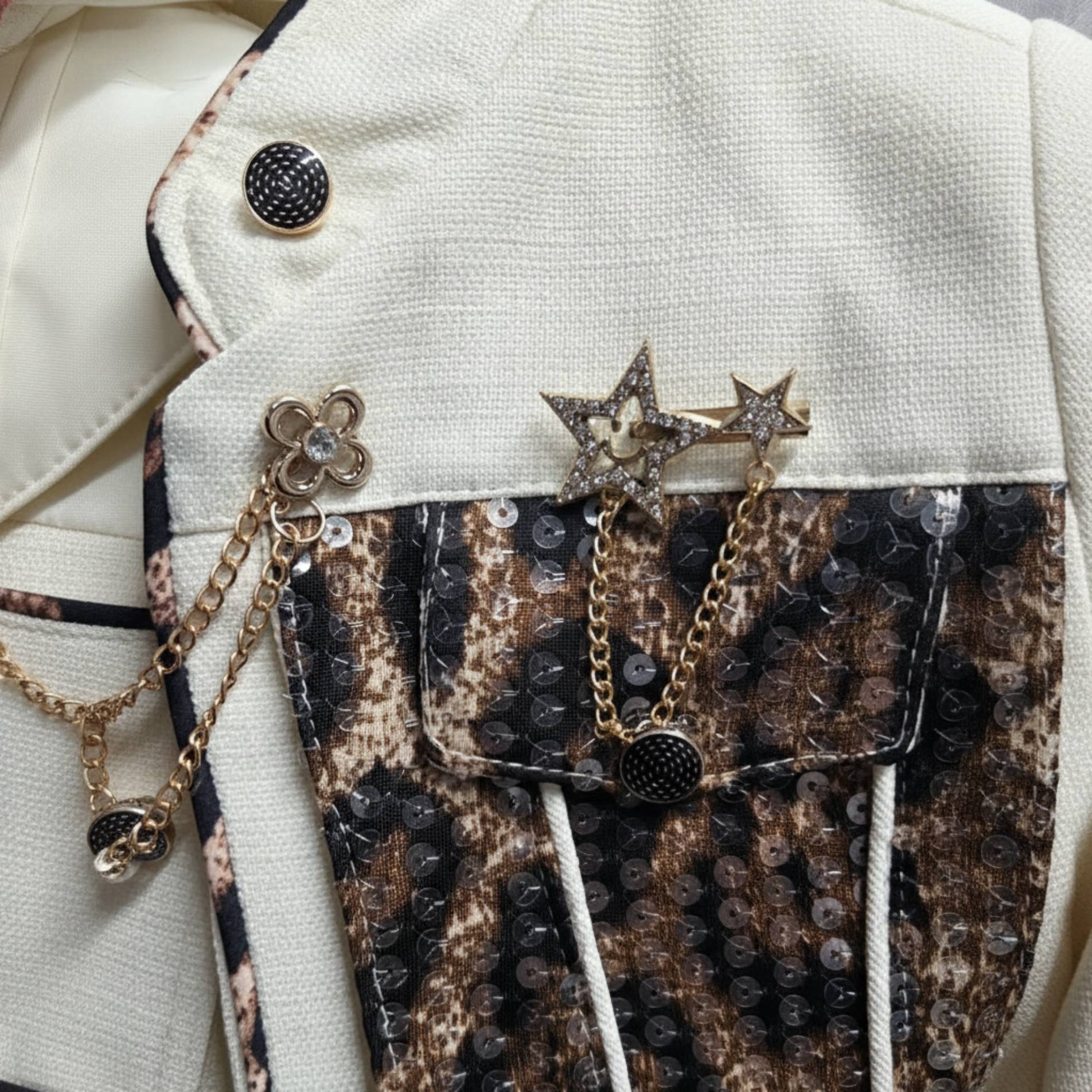 A refined and standout two-piece set featuring a structured cropped jacket adorned with bold leopard-sequin panels for a touch of glamour. The clean, tailored neckline and contrasting details add sophistication, while the front bow accent brings a soft, feminine charm. The pleated A-line skirt offers graceful movement and timeless elegance, creating a perfectly balanced silhouette. Ideal for special occasions where style, confidence, and uniqueness truly shine.