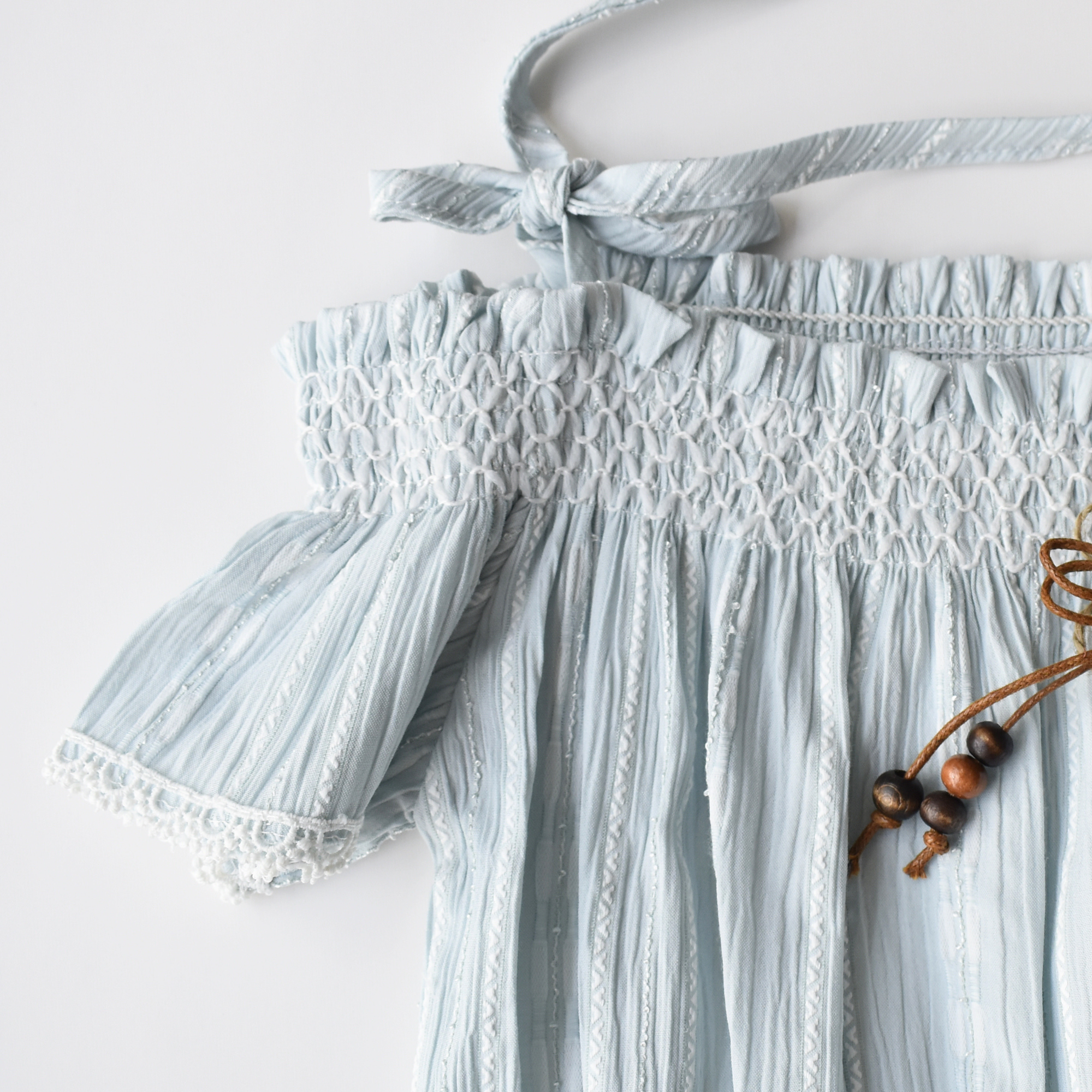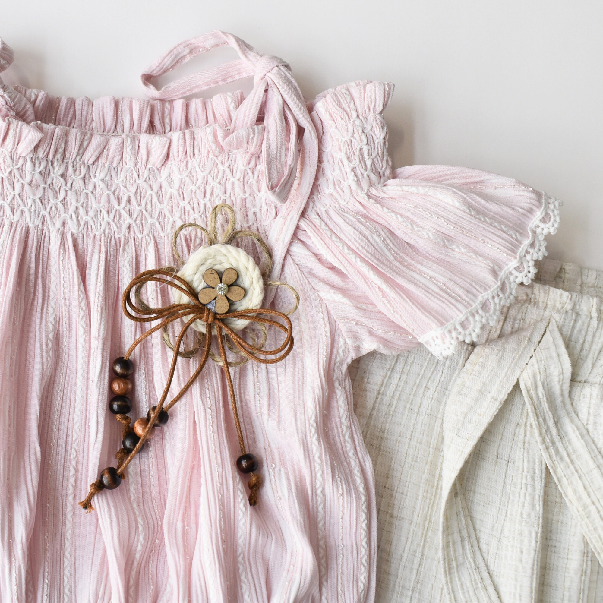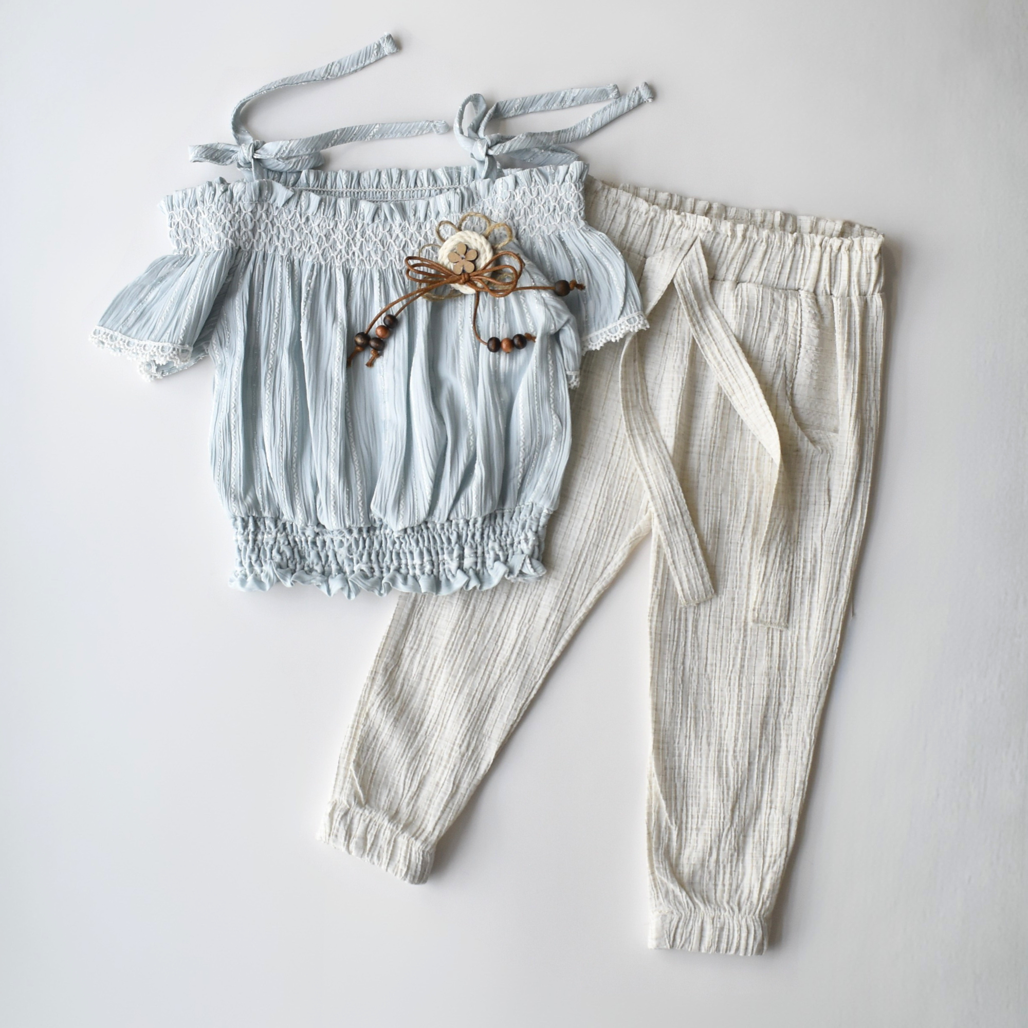 This charming two-piece set is the perfect blend of style and comfort. Featuring a beautifully smocked, off-shoulder top with delicate lace details and breathable linen pants, this outfit is ideal for warm weather. Available in two soft pastel shades—baby blue and blush pink—it’s a must-have for summer outings, family gatherings, or vacations.