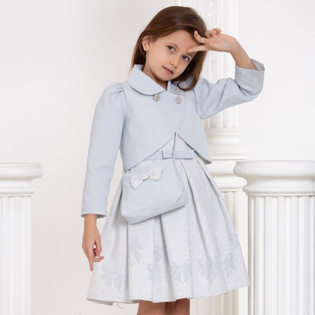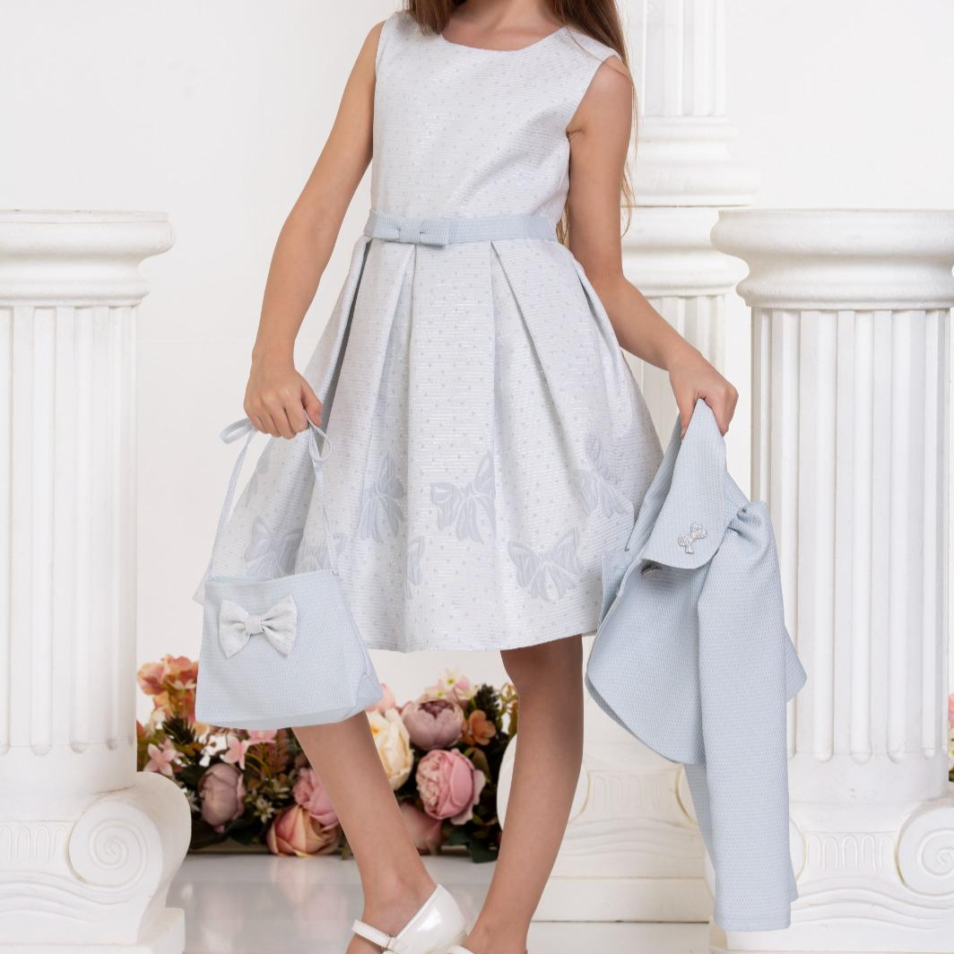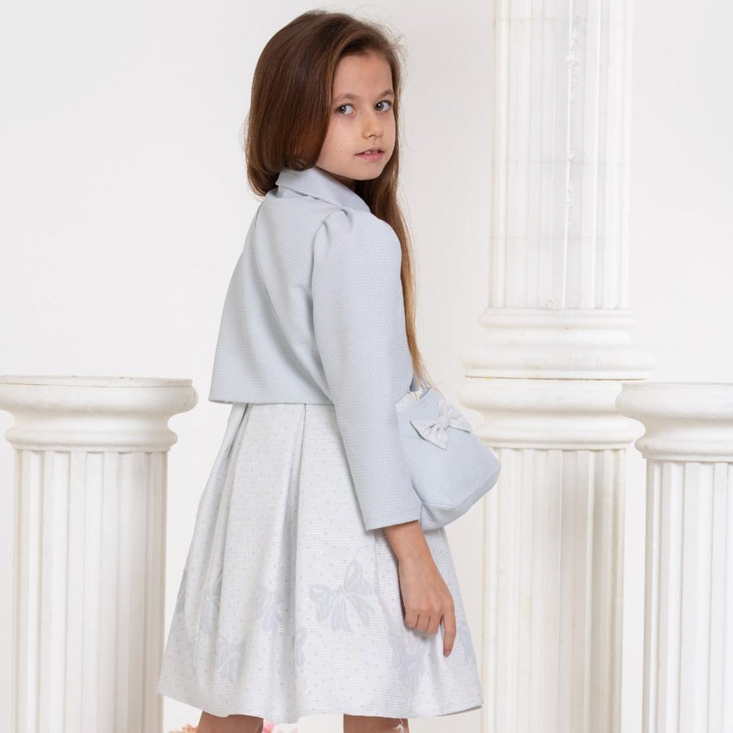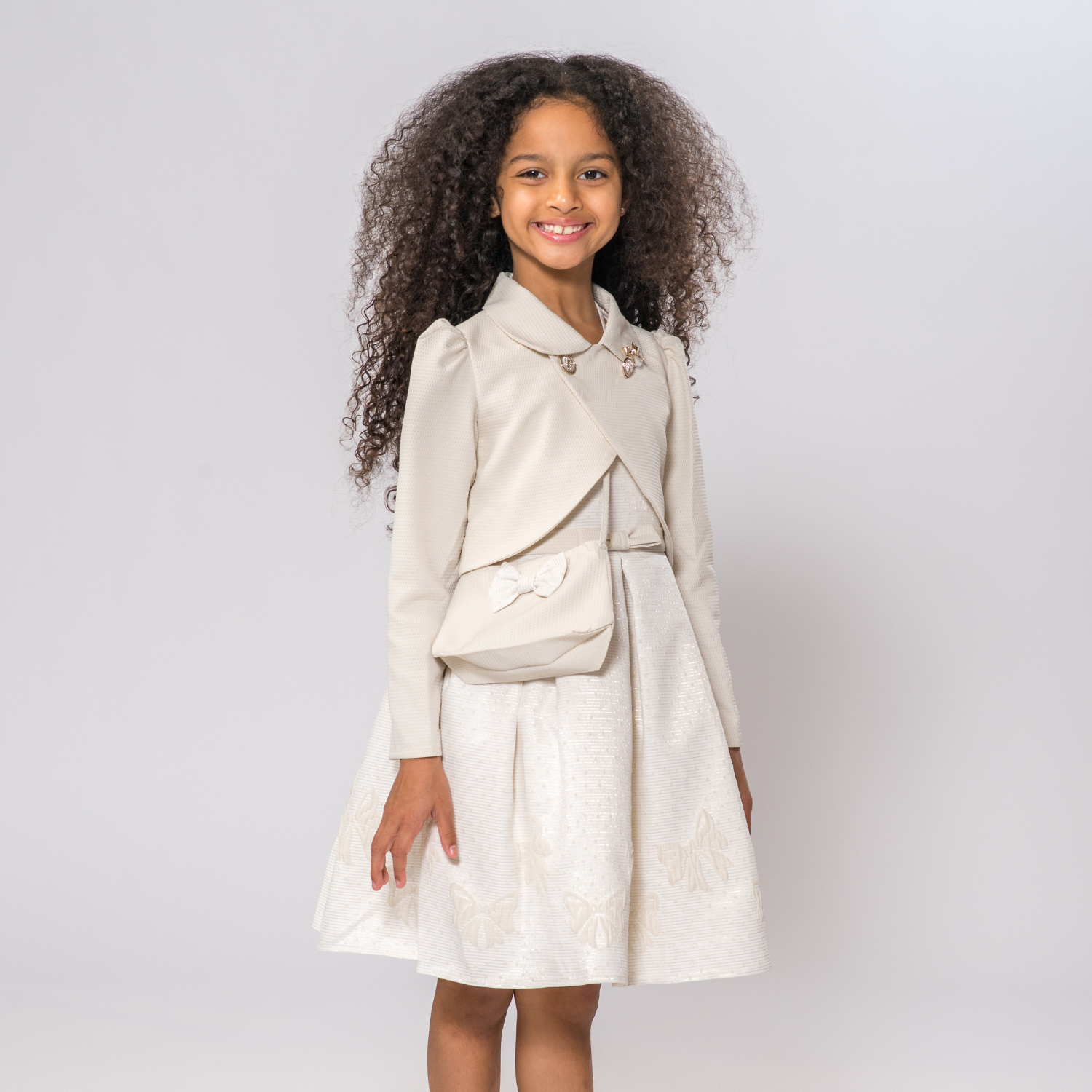 Dress your little girl in fashion with this lovely dress for girls! The dress is short and sleeveless, accompanied by a matching cross-cardigan and purse, making it perfect for any special event. The jacquard fabric and soft cotton lining provide a luxurious appearance and cozy feel.