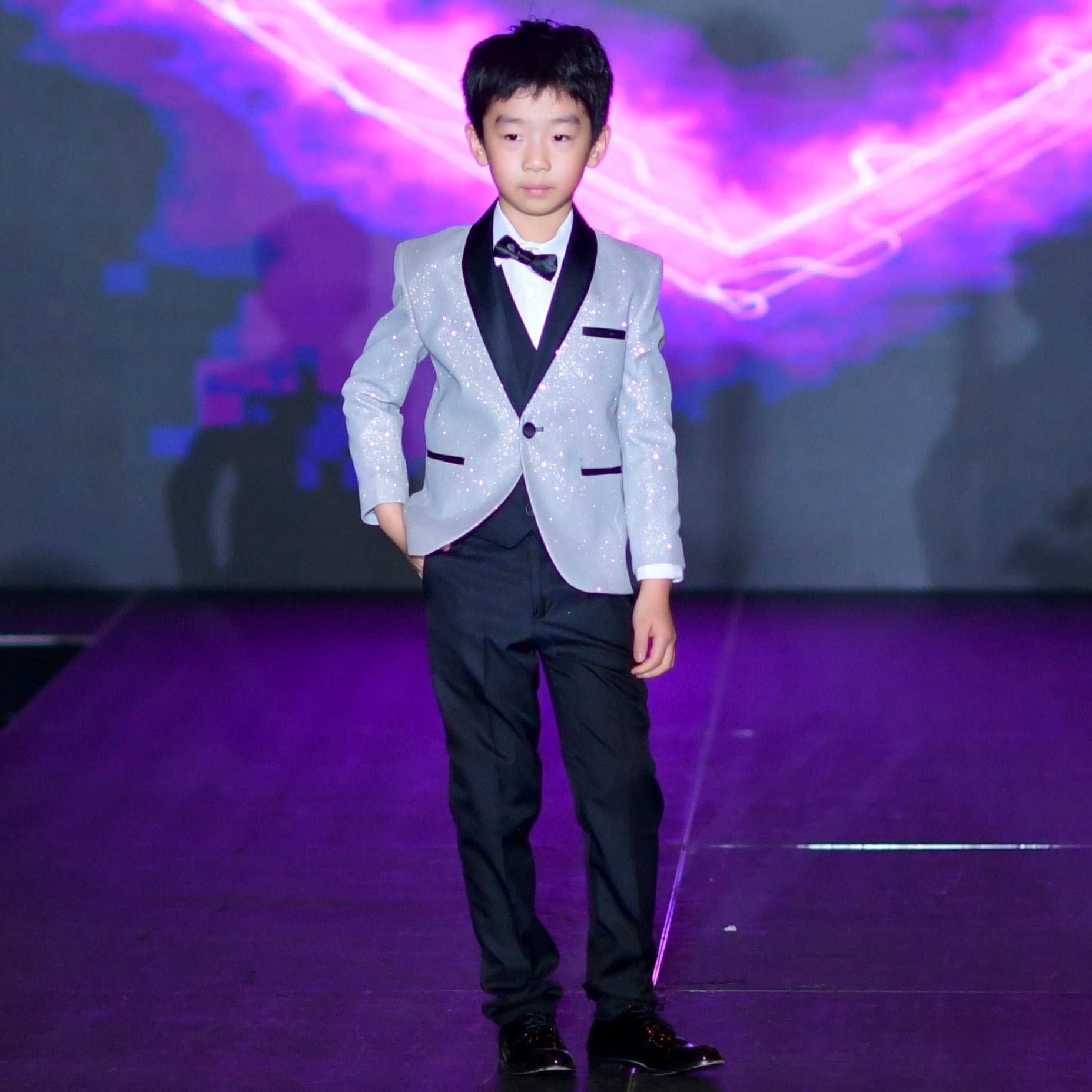 Designed for the fashion-forward young gentleman, this slim fit tuxedo offers a refined, polished look with all the style and comfort your child needs. Every element, from the jacquard fabric to the classic bowtie, has been thoughtfully crafted to create an exclusive, high-end ensemble that radiates sophistication.