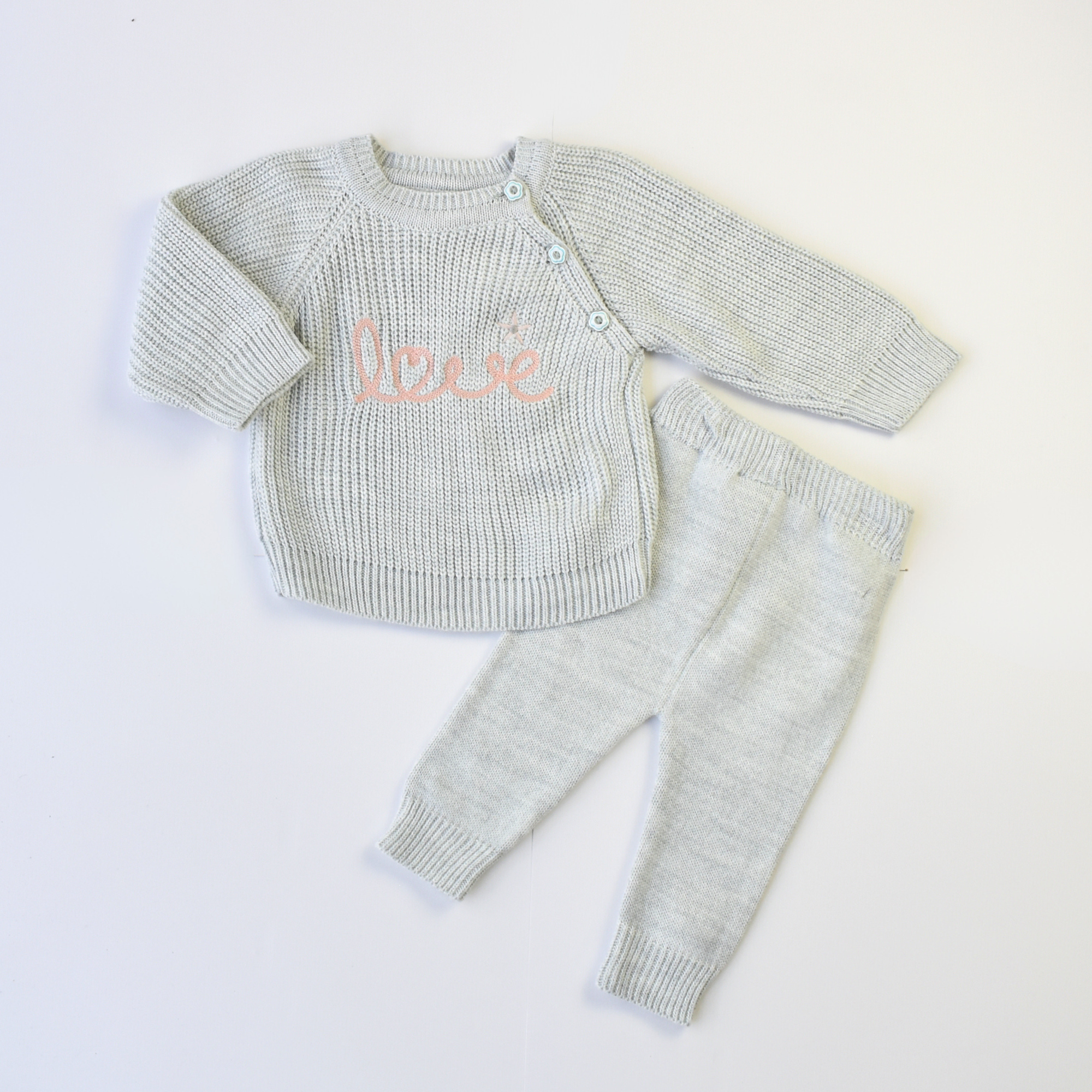 Experience the beauty and comfort of our matching knit set, complete with a long-sleeved knit sweater (100% Cotton) and elasticated bottom knit pants. Keep your little one stylish and warm all day long with 100% Cotton fibers.