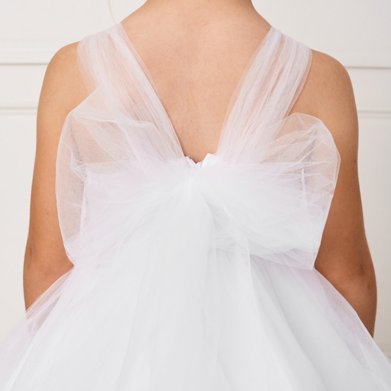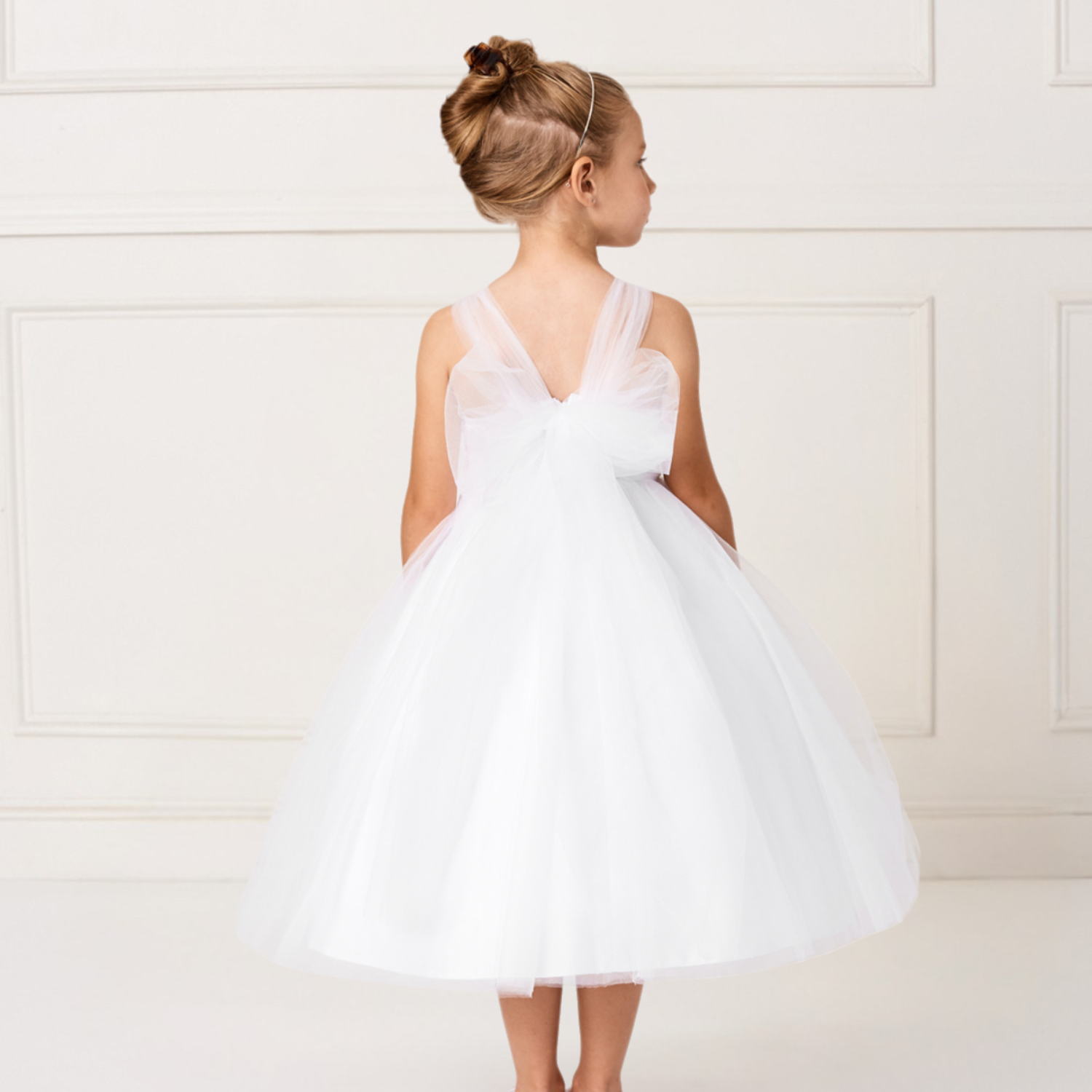 Elevate your little one’s special occasion look with this enchanting girls' dress, designed to make her feel like a princess. Featuring a delicate illusion neckline and a beautifully intricate lace applique bodice, this dress exudes elegance and charm. The full tulle skirt adds a dreamy touch, perfect for twirling at weddings, parties, or any memorable event. A statement bow at the back completes the look, adding a touch of whimsy and sophistication. Crafted with comfort and style in mind, this dress is as delightful to wear as it is to admire.