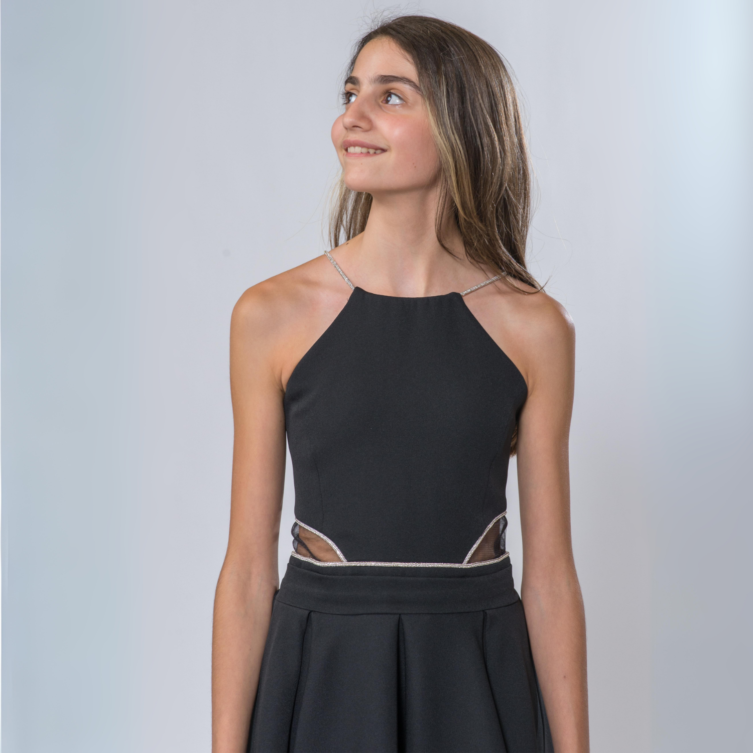 This sleeveless dress has a curved neckline adorned with sparkling rhinestones and a matching waistline ornament, adding a touch of sophistication to any wardrobe. Perfect for any occasion, this dress seamlessly blends comfort and style.