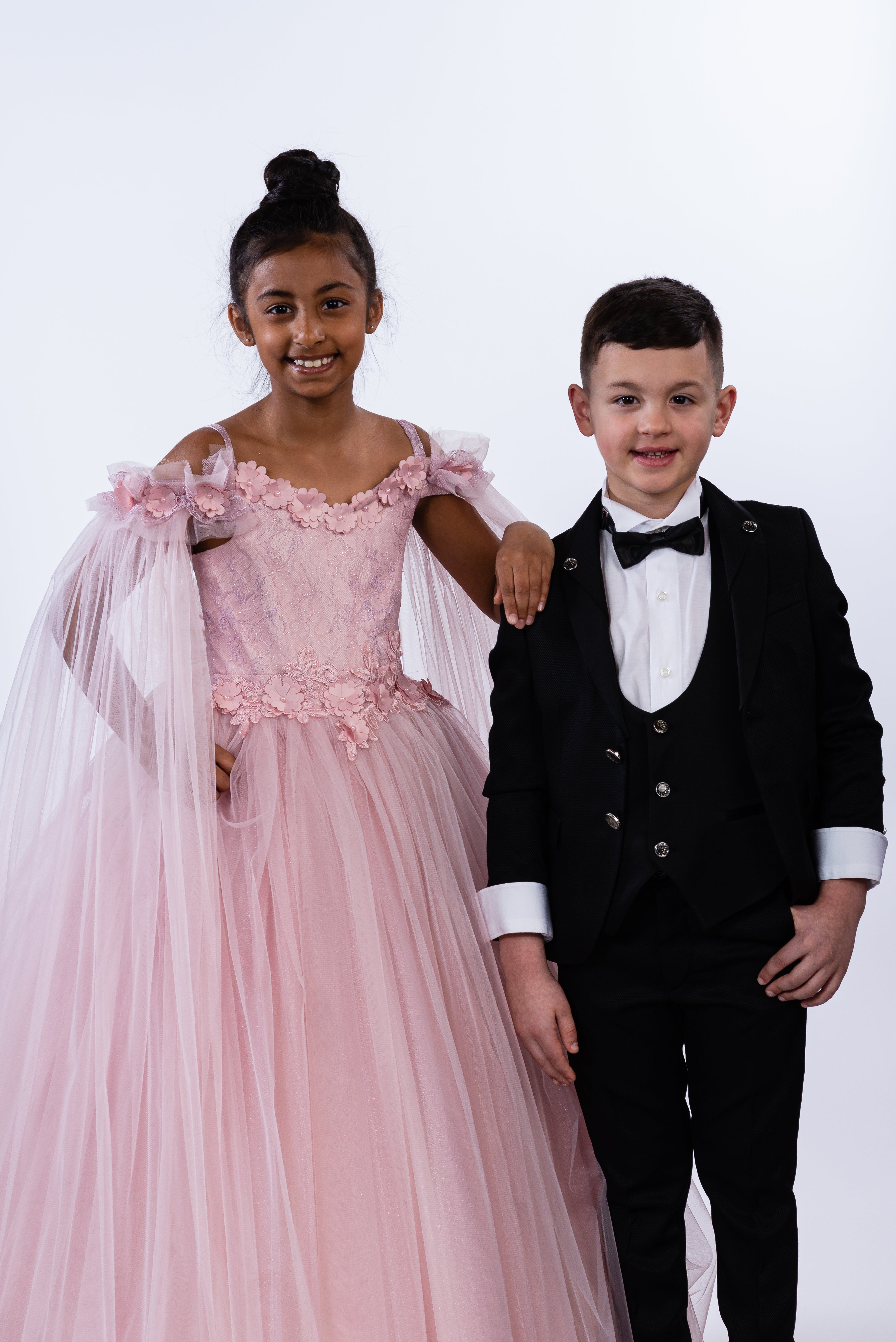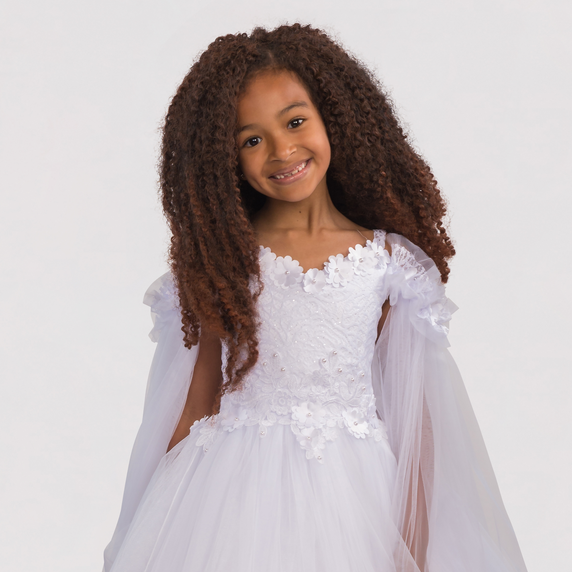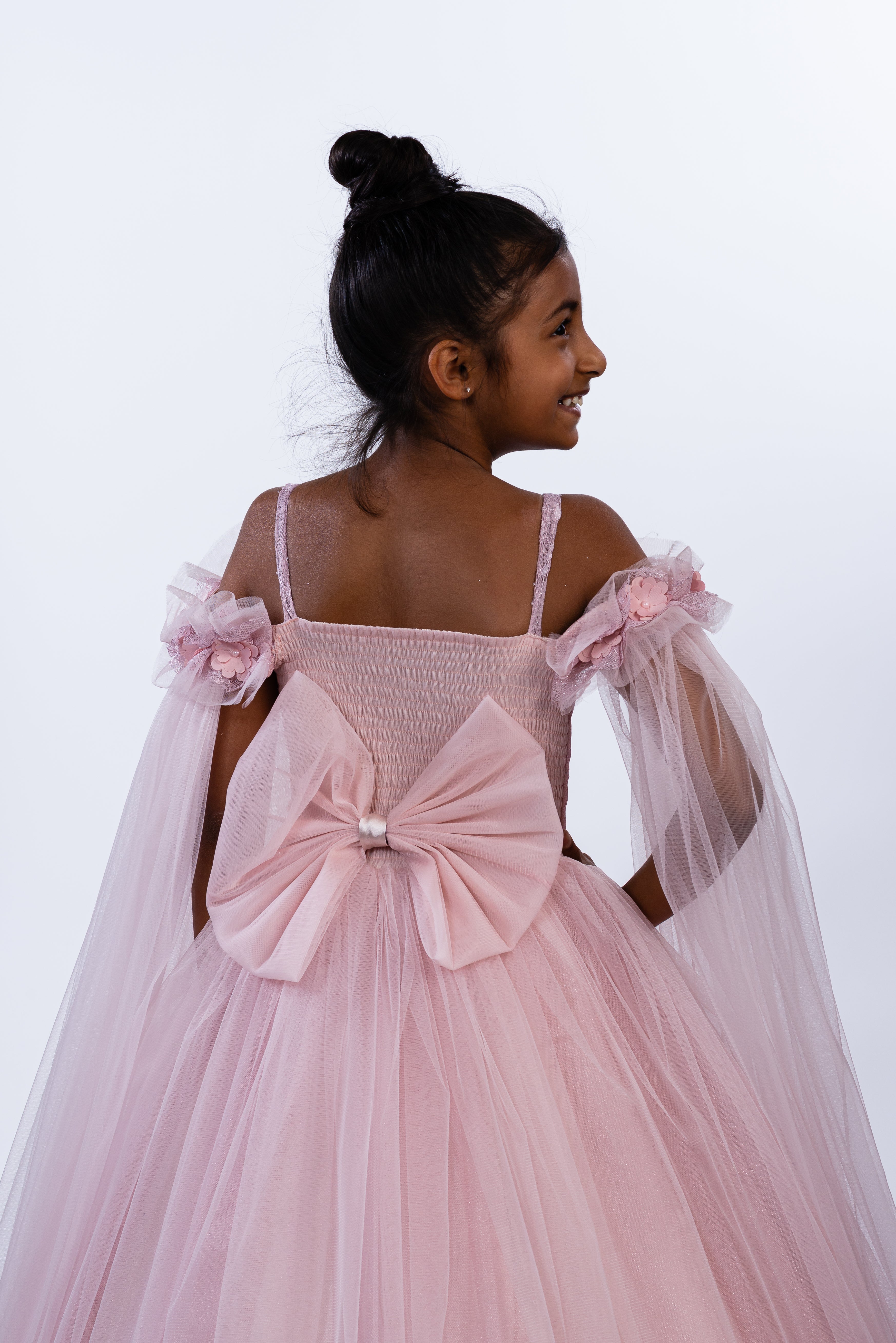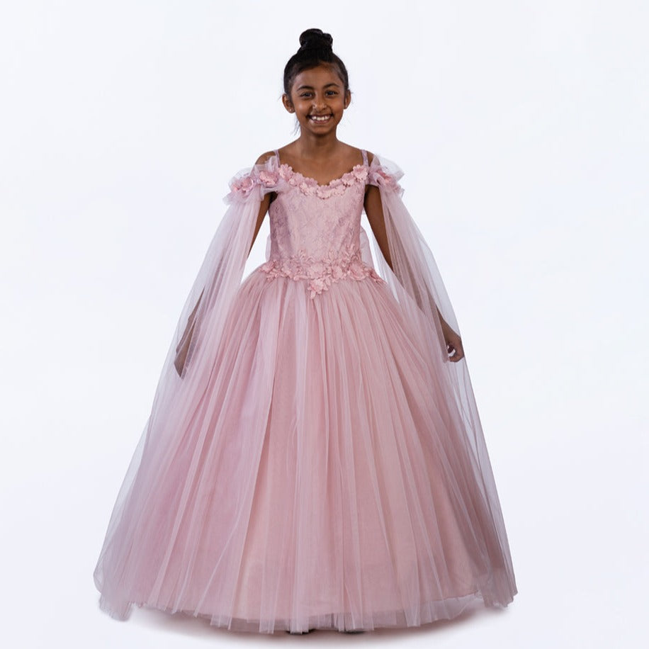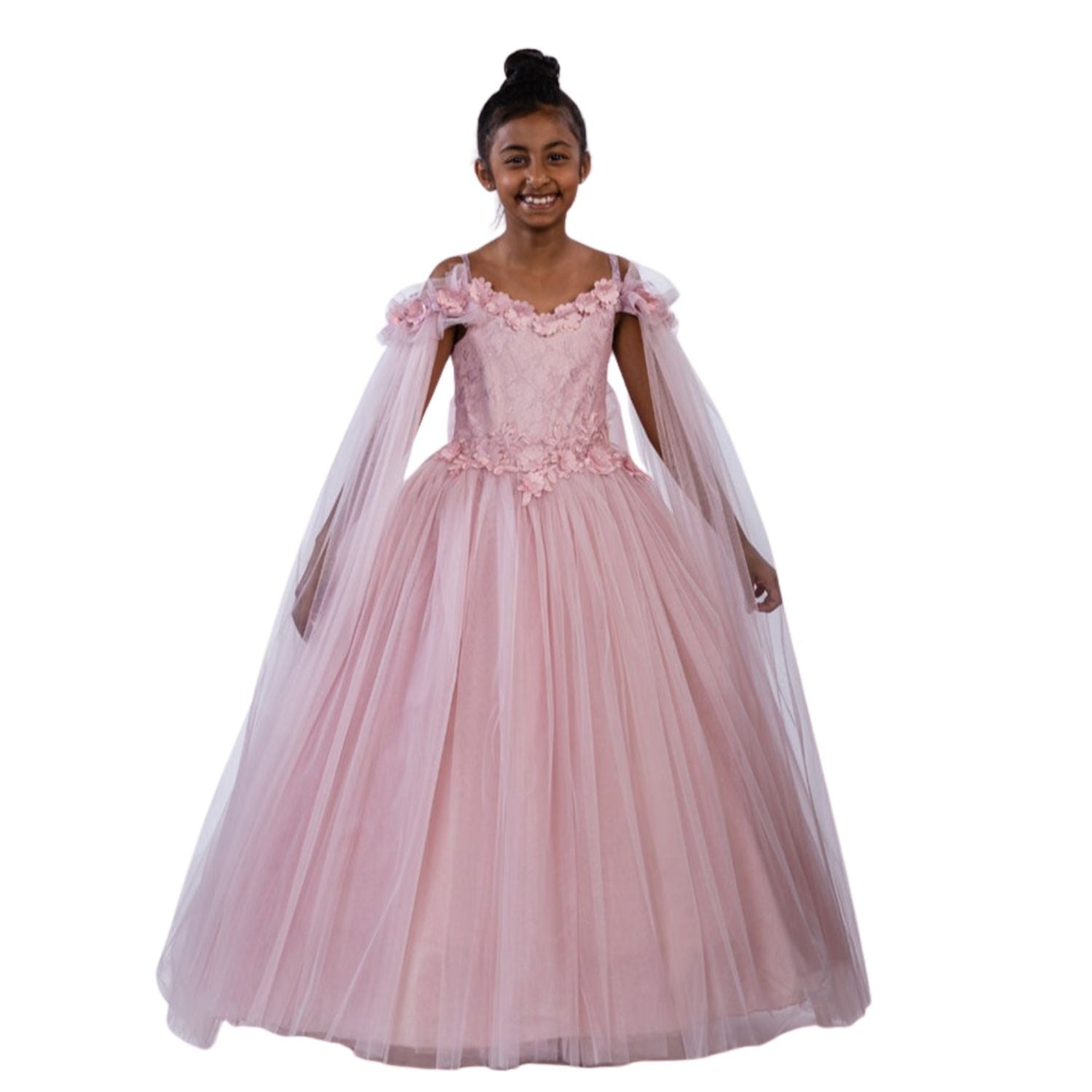 Attention to detail is key. A graceful princess tulle dress, luxuriously fluffy with off-shoulder sheer mock sleeves, adorned with 3D floral embroidery on the chest, and featuring a sizable removable bow on the elasticized back. This exclusive design is brought to you by JuniorKids!