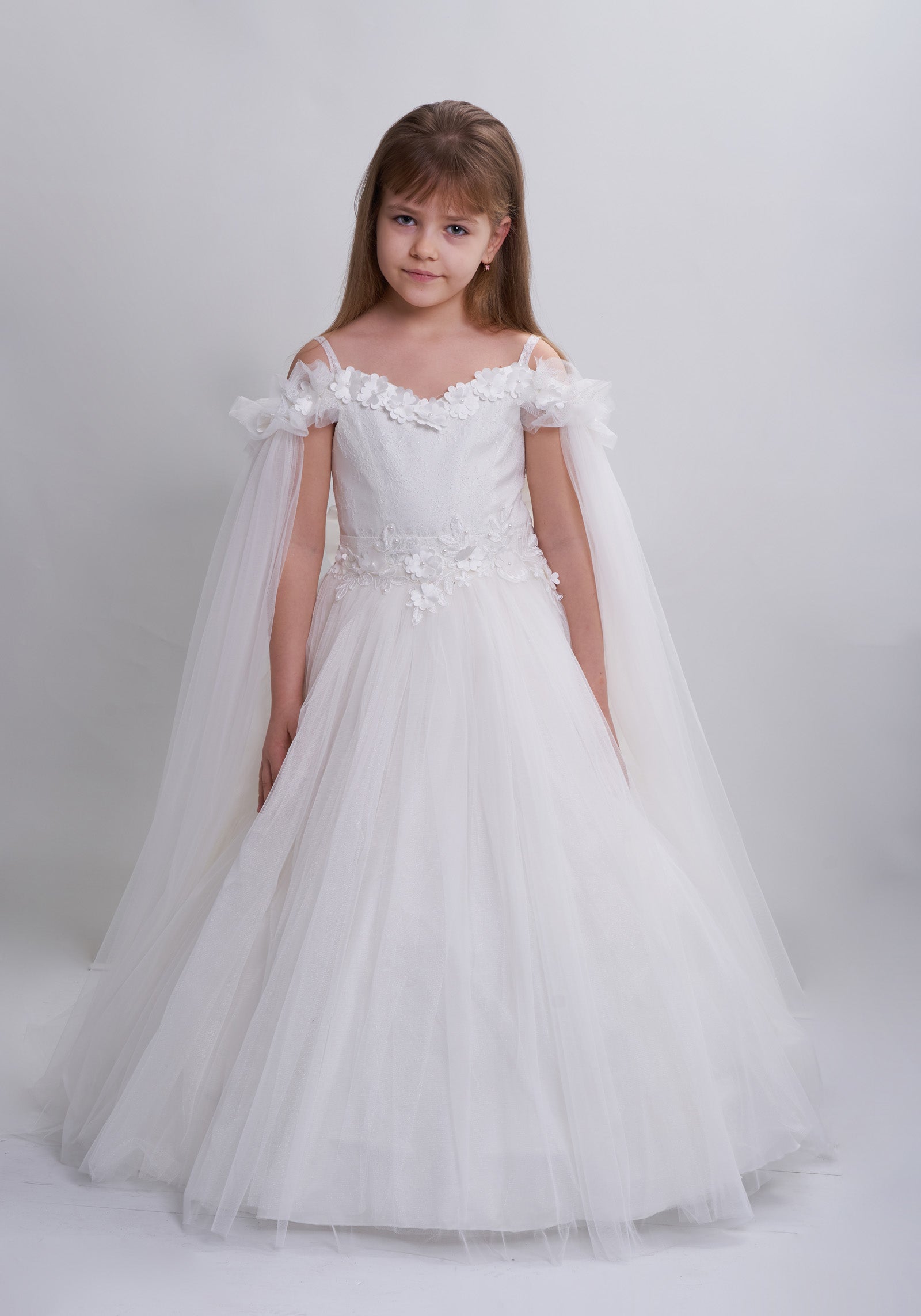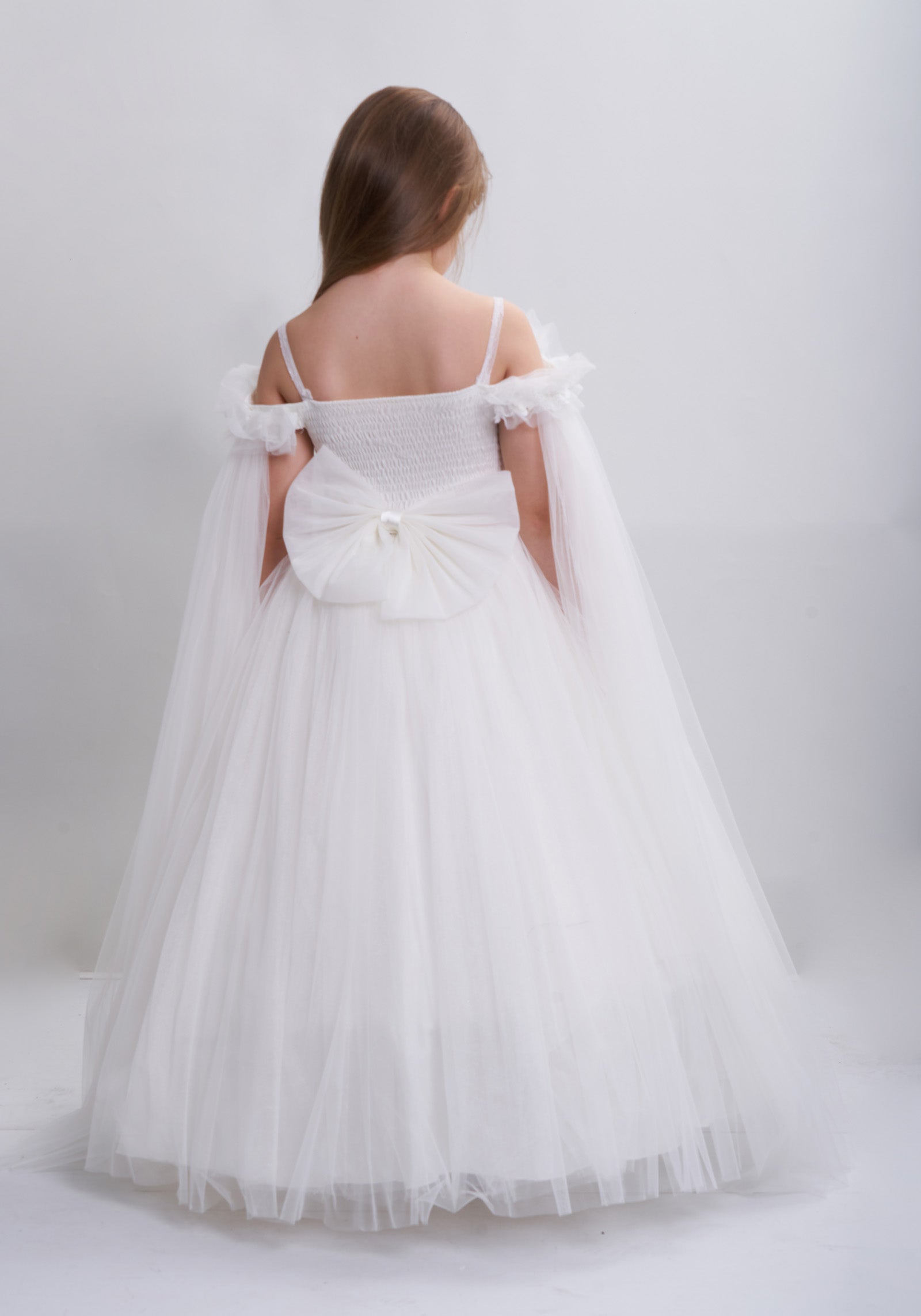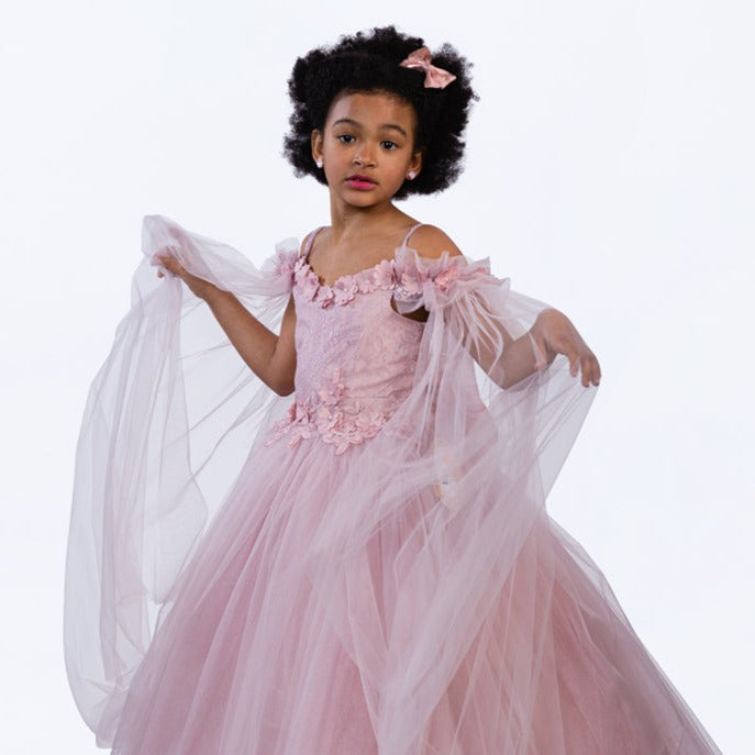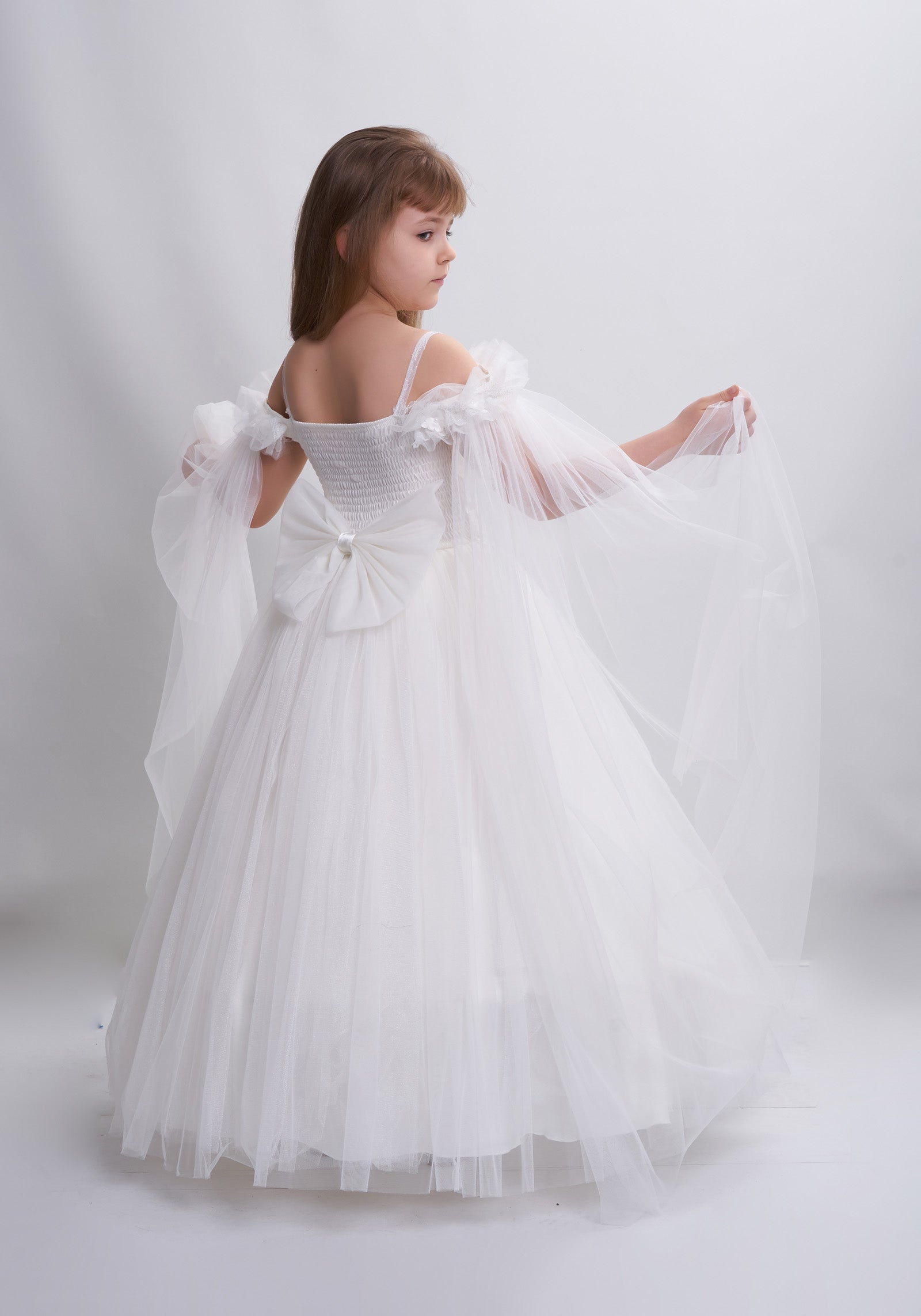 Tout est dans les détails. Robe de princesse en tulle élégante, très bouffante avec des manches transparentes épaules dénudées, broderie florale en 3D sur la poitrine, un grand nœud amovible sur le dos élastique. Une création exclusive de JuniorKids!