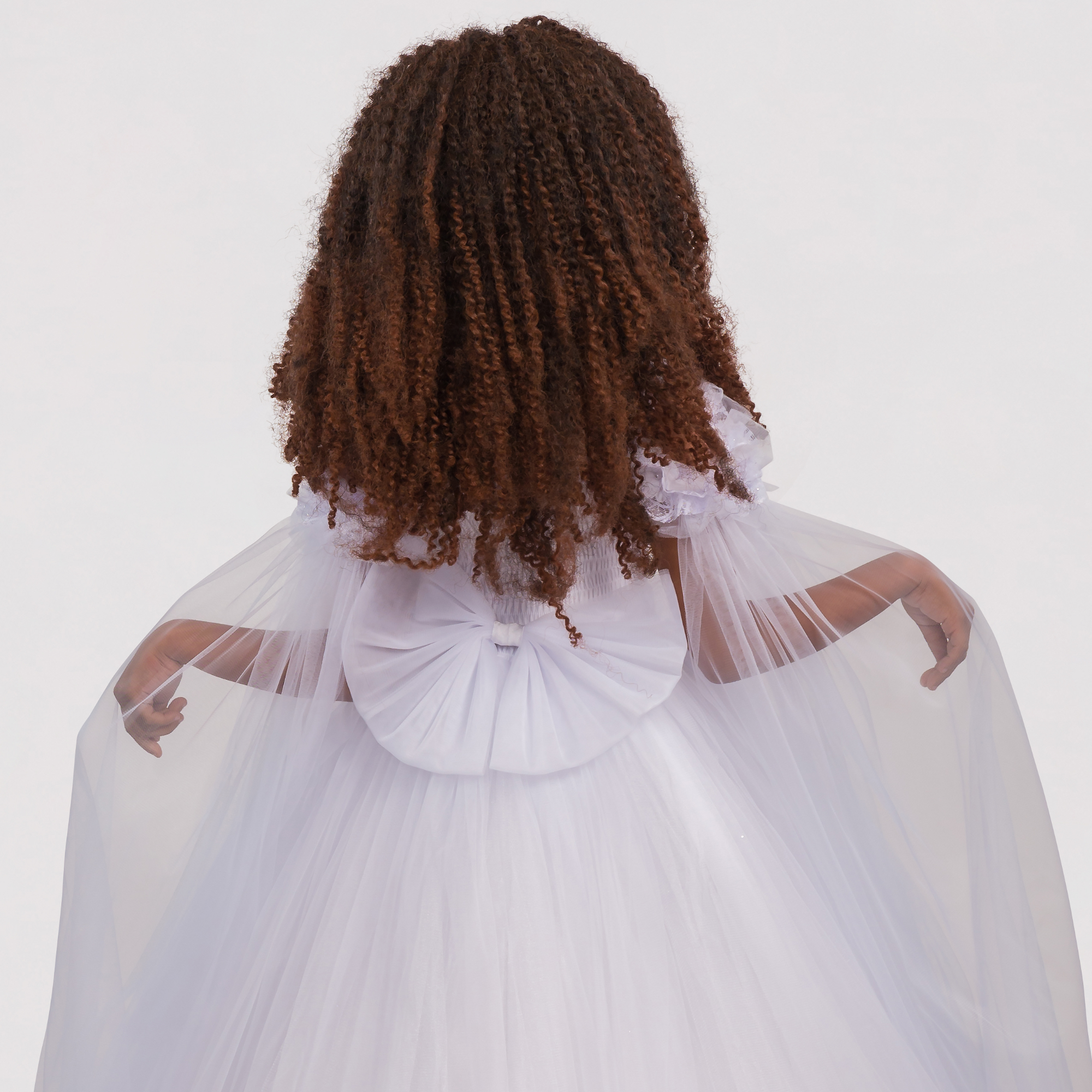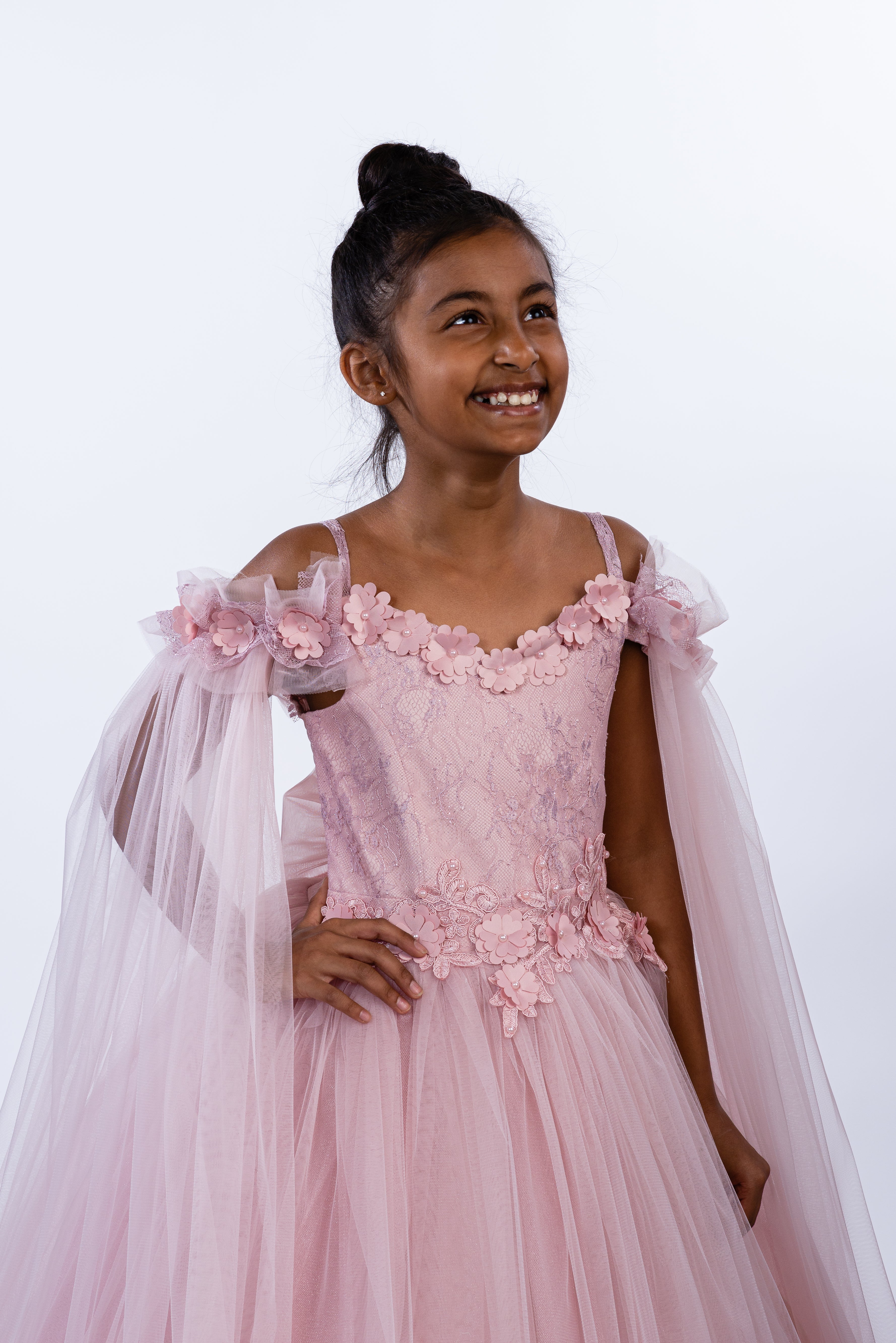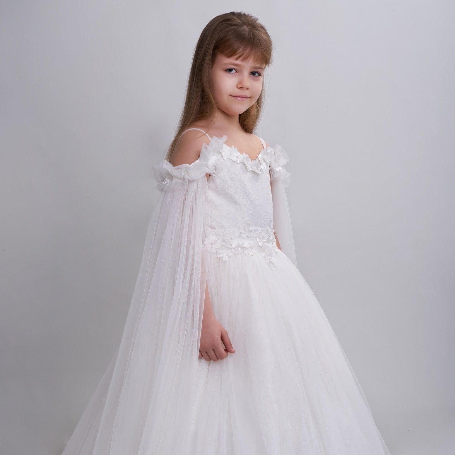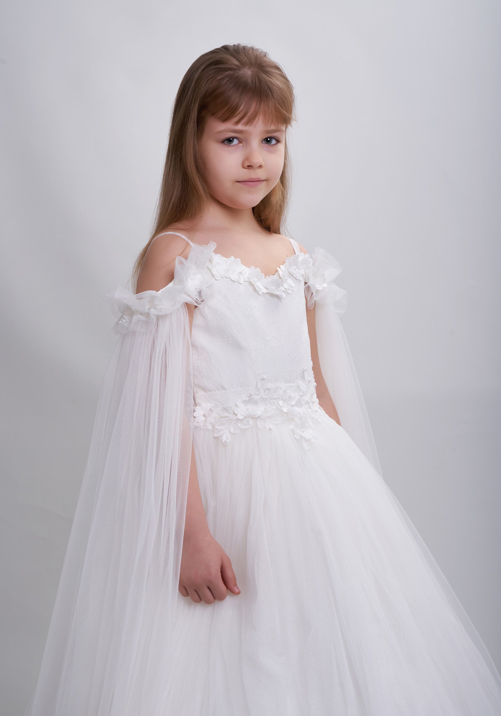 Tout est dans les détails. Robe de princesse en tulle élégante, très bouffante avec des manches transparentes épaules dénudées, broderie florale en 3D sur la poitrine, un grand nœud amovible sur le dos élastique. Une création exclusive de JuniorKids!