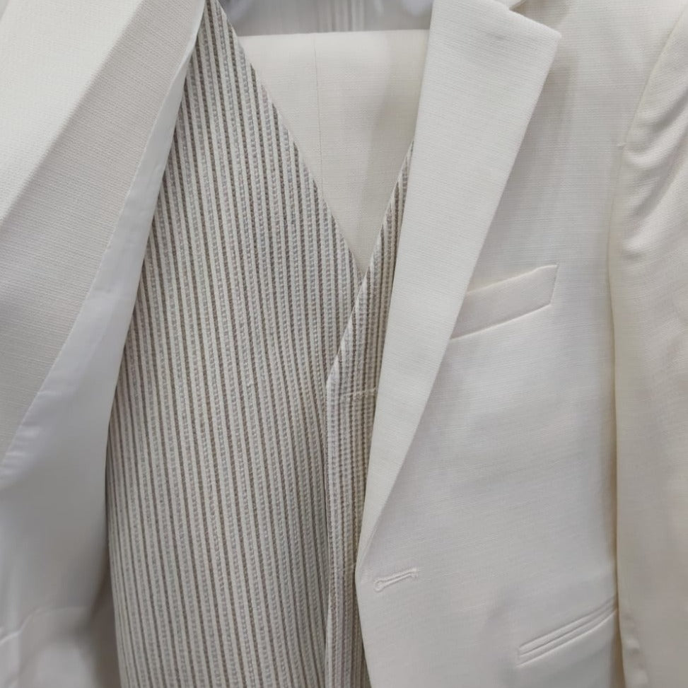Sleeveless Striped Vest: The striped vest introduces a subtle yet stylish detail, complementing the suit’s overall clean and polished aesthetic.
